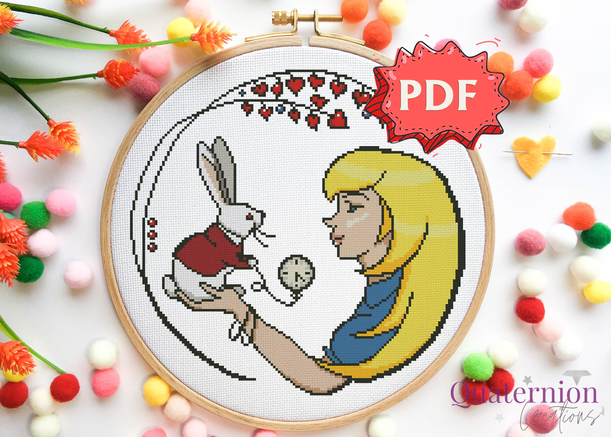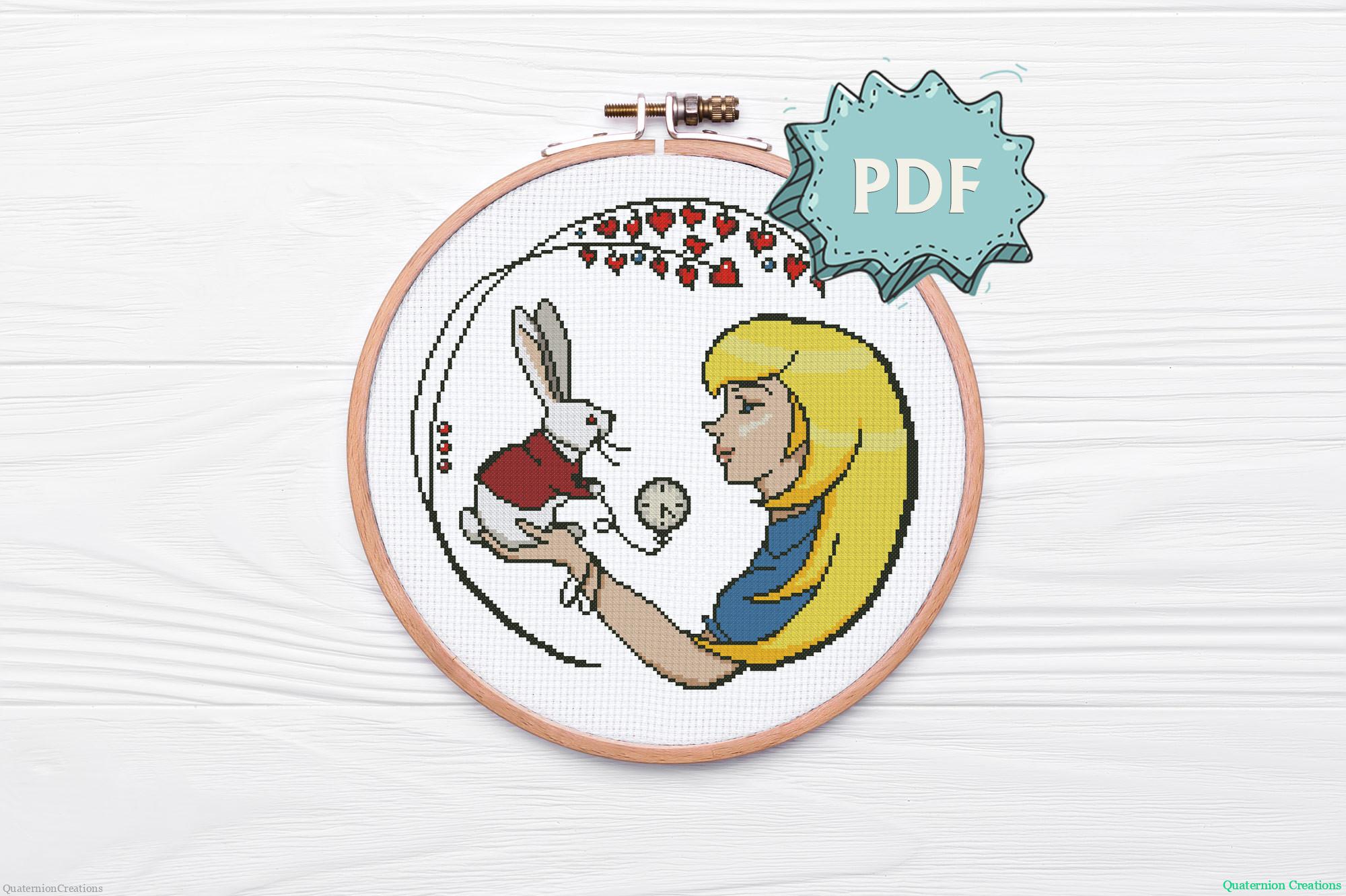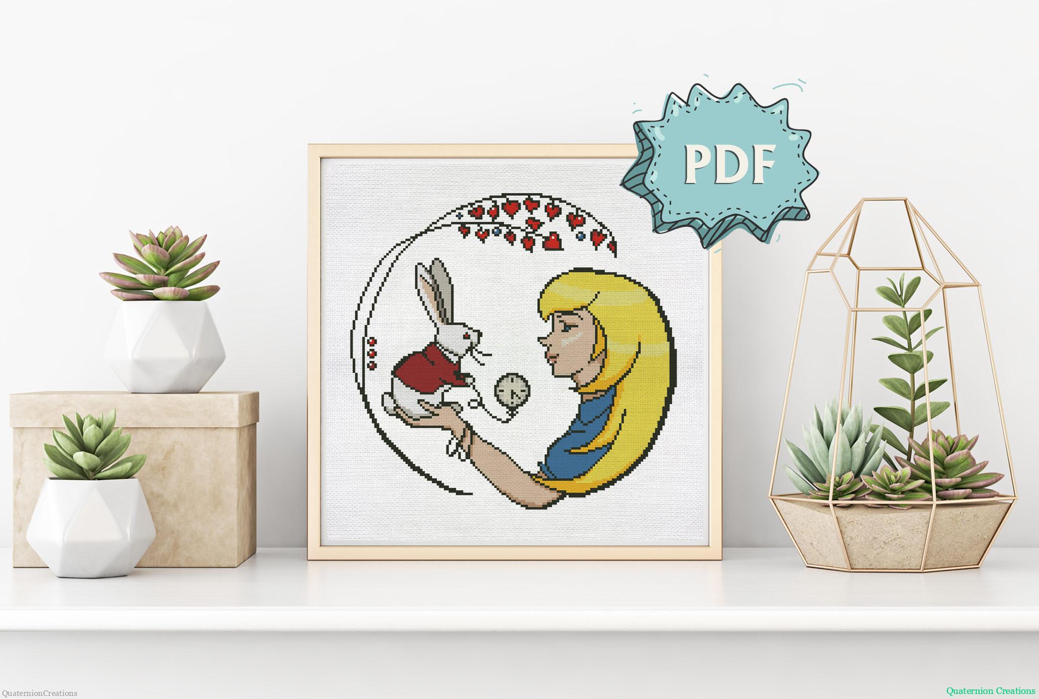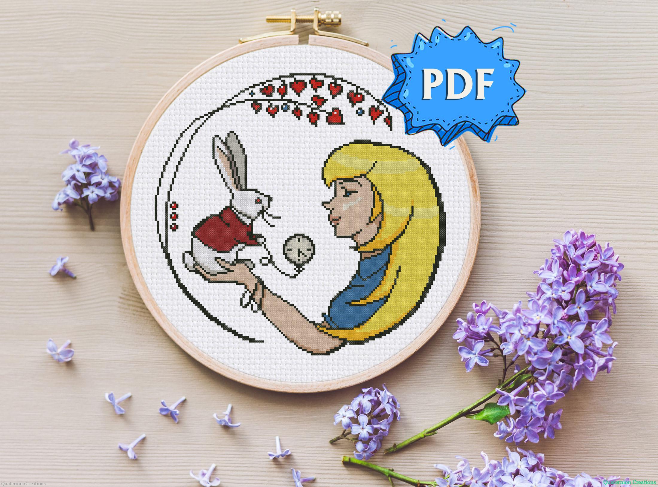 Featuring Alice holding the White Rabbit in her hand, this design is inspired by Alice in Wonderland books.