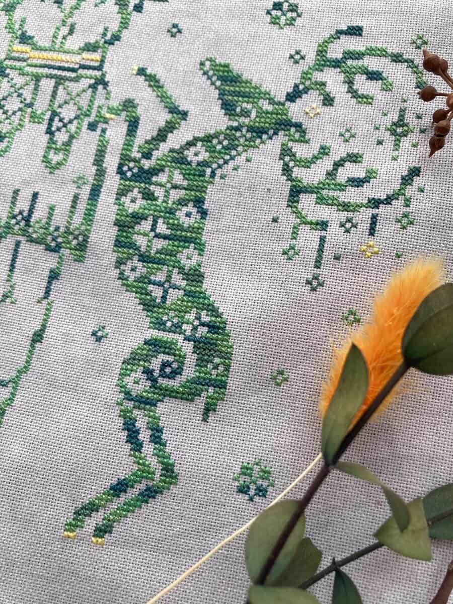 Model stitched in Sulky Petites on Vintage Stormy Night Lugana, DMC conversions included.
