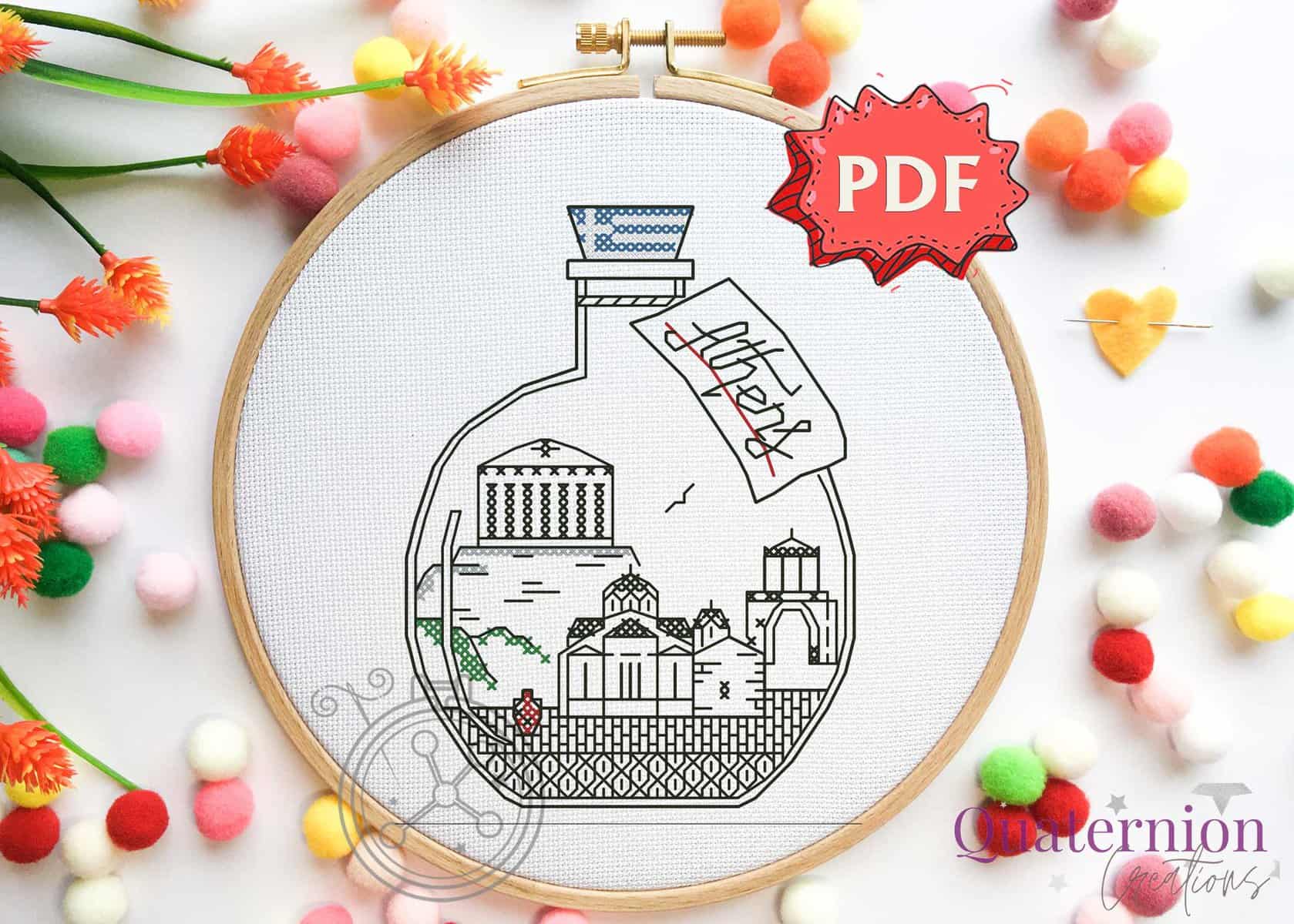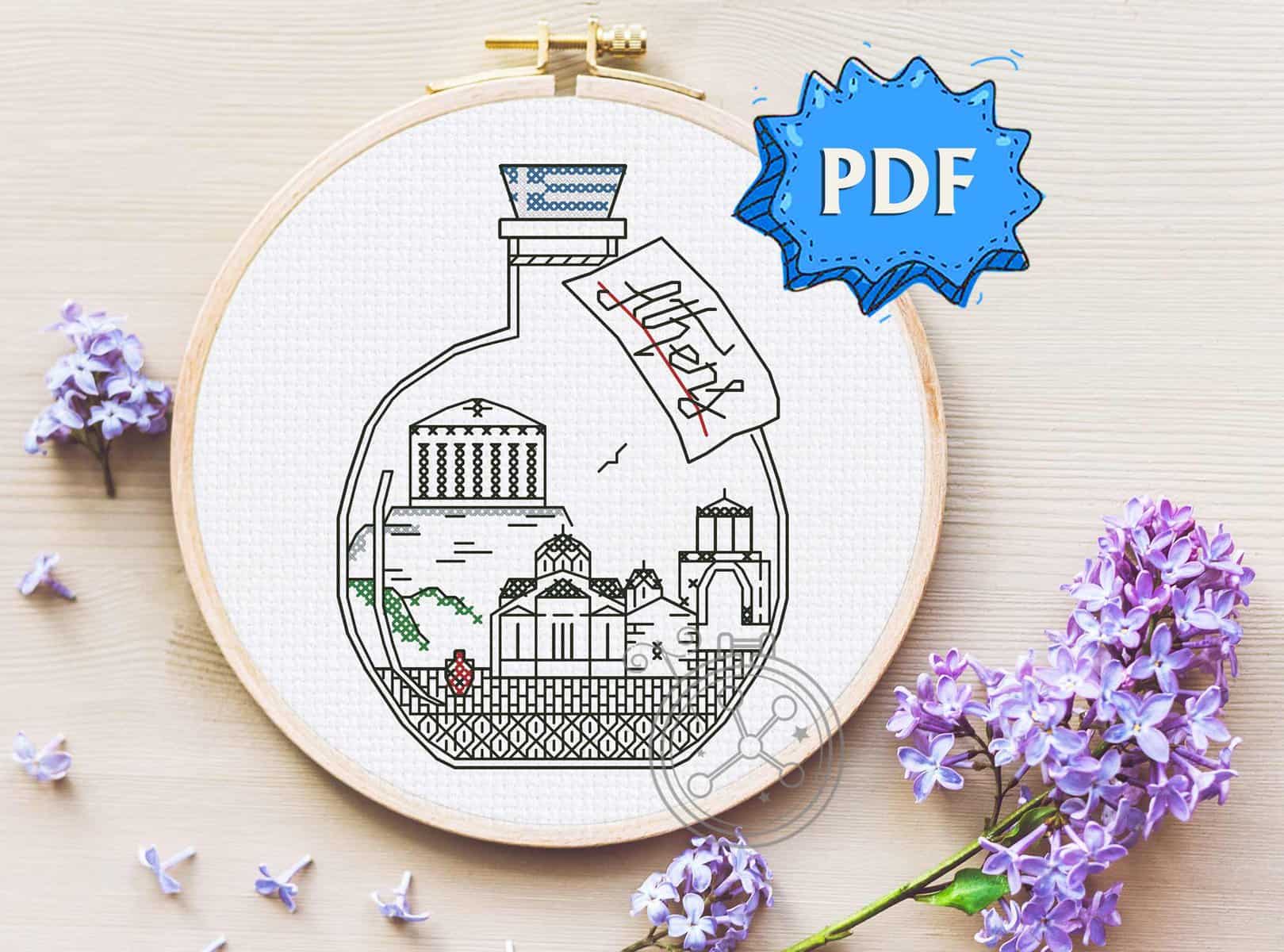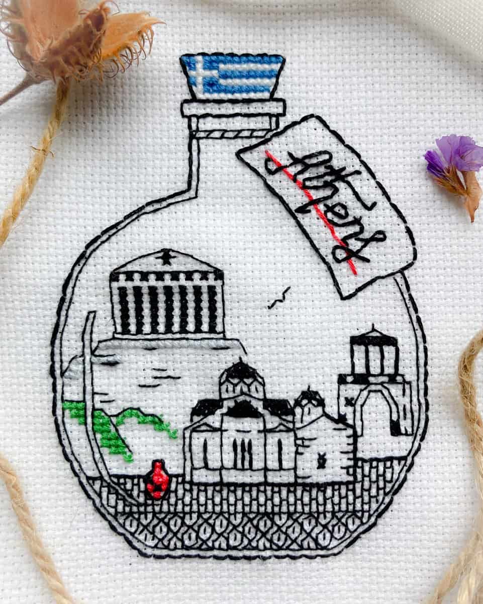 A little bottle with the Parthenon, and several other most loved landmarks of Athens, Greece. The Athens blackwork pattern is a sweet stitching memento of Europe, that can be done together with other similar bottles, or separately!