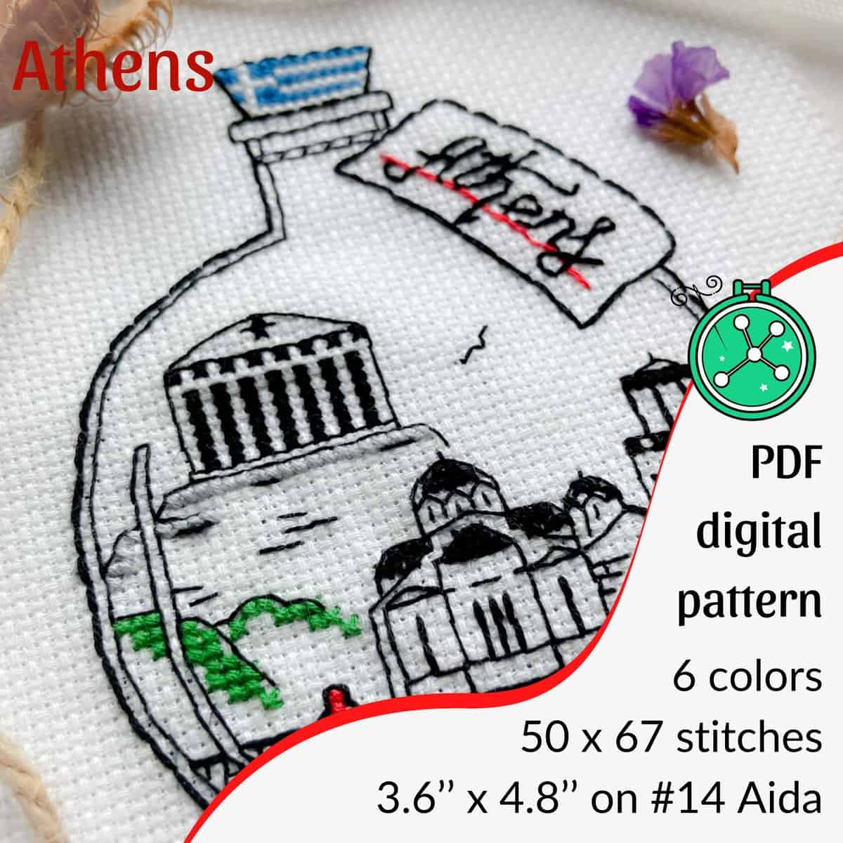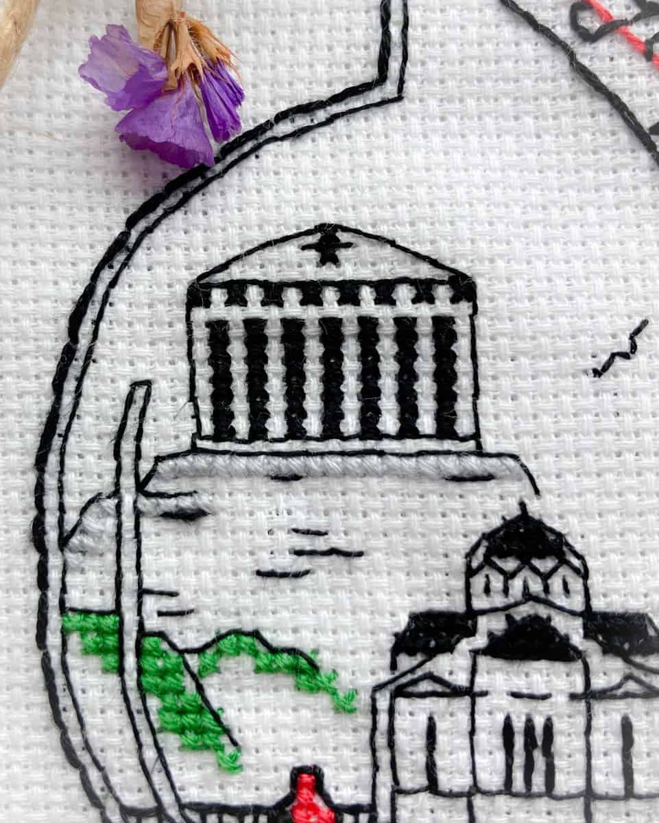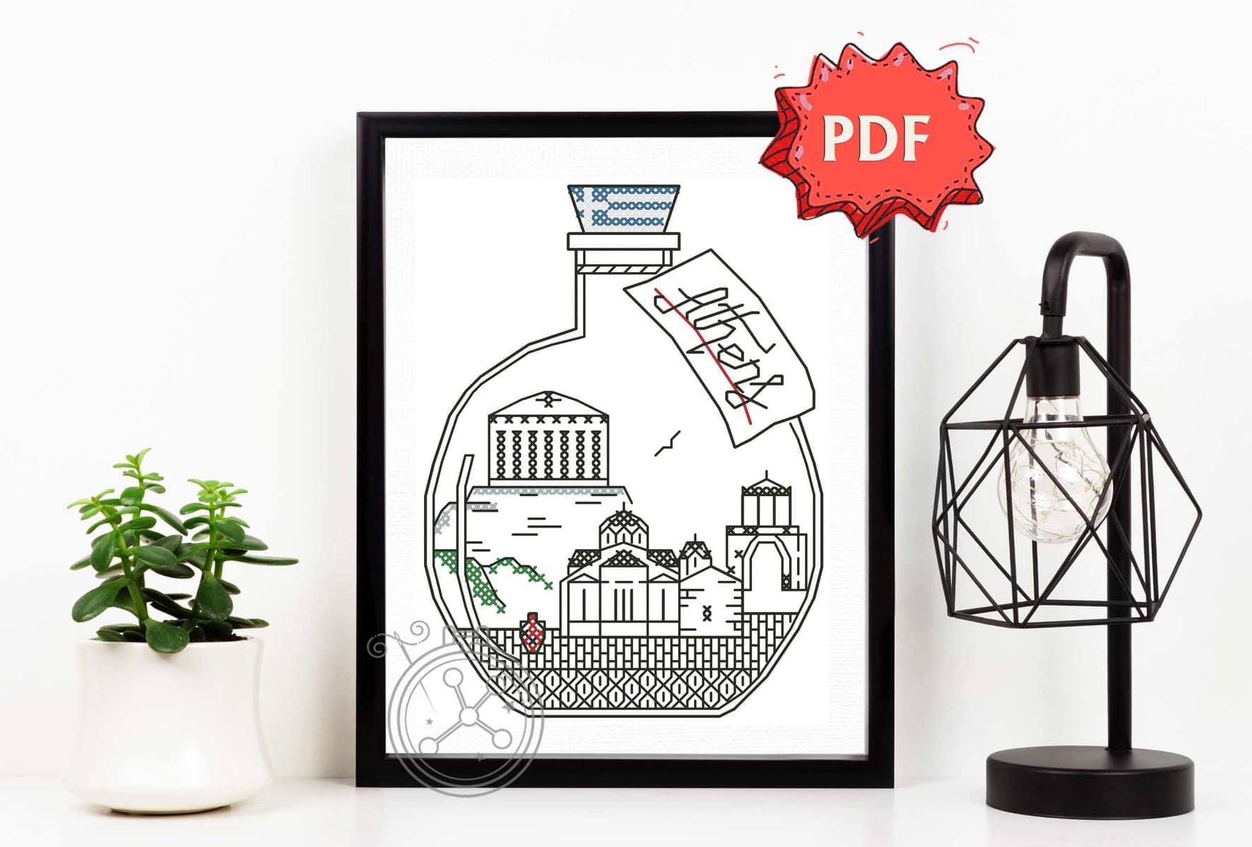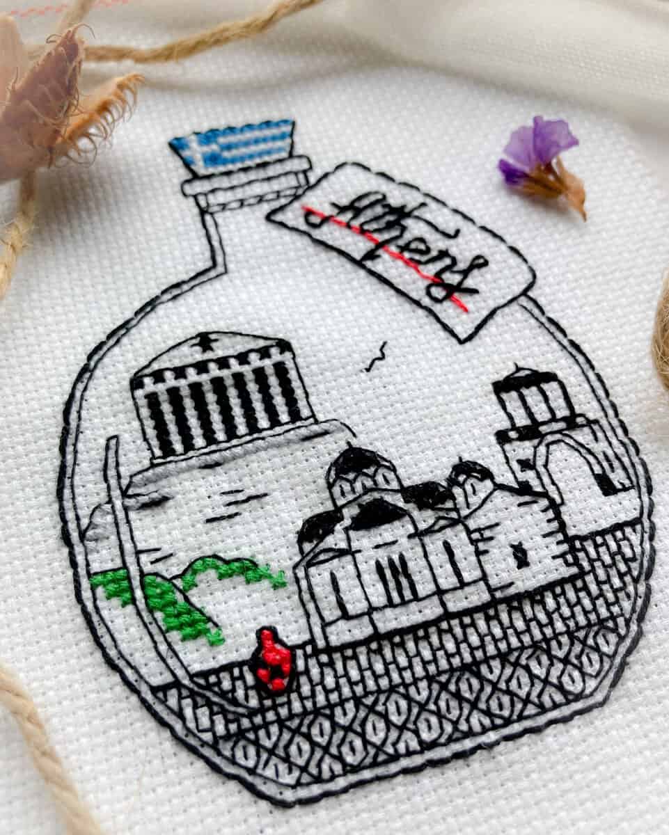 A little bottle with the Parthenon, and several other most loved landmarks of Athens, Greece. The Athens blackwork pattern is a sweet stitching memento of Europe, that can be done together with other similar bottles, or separately!
