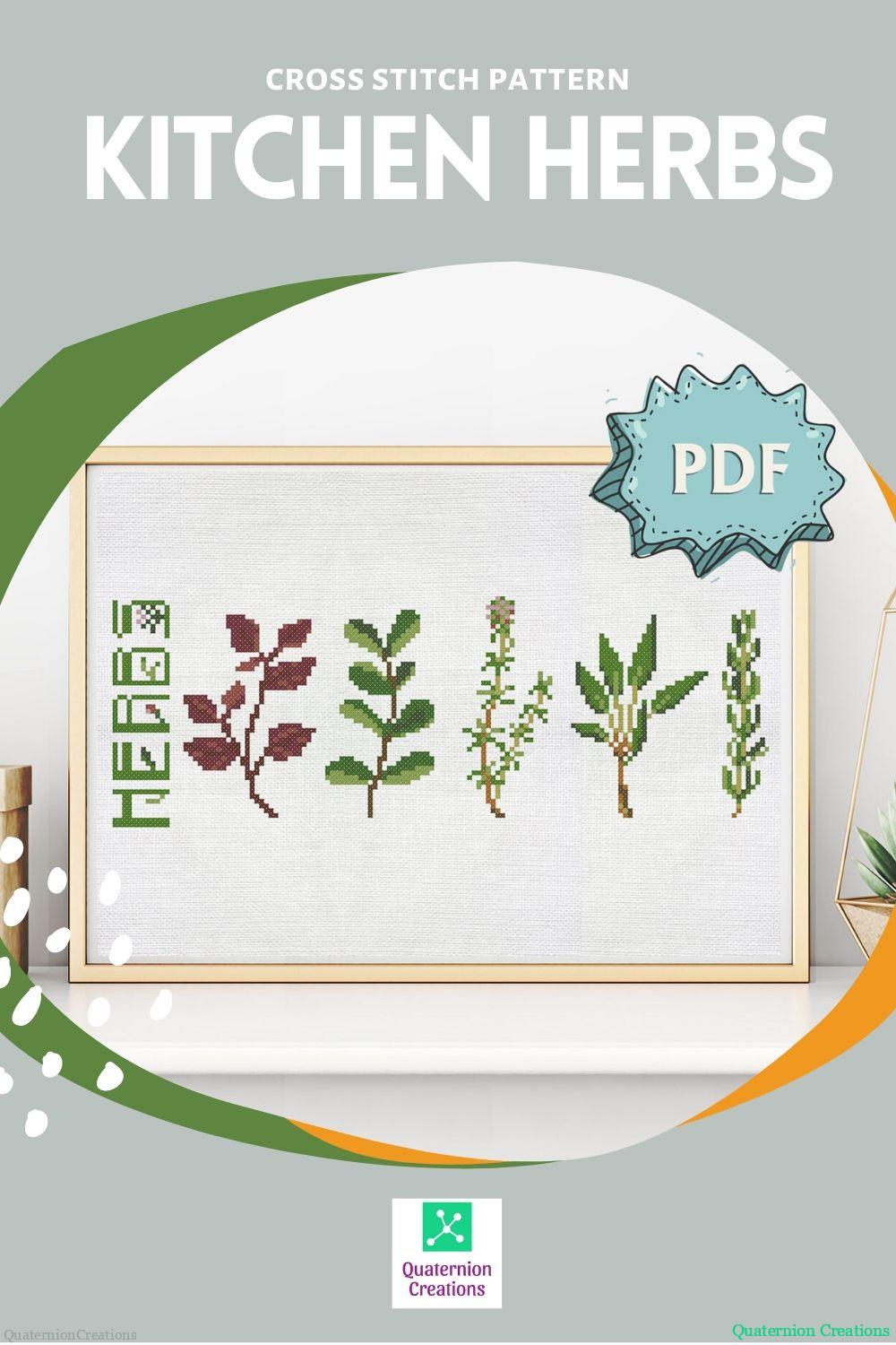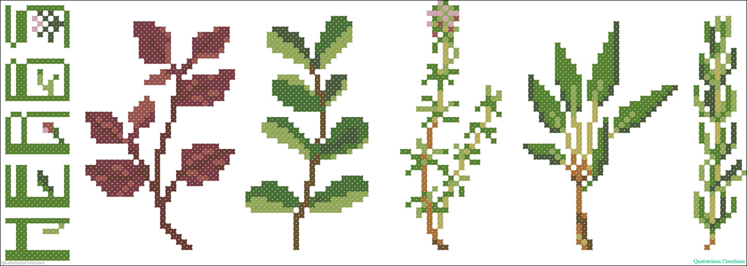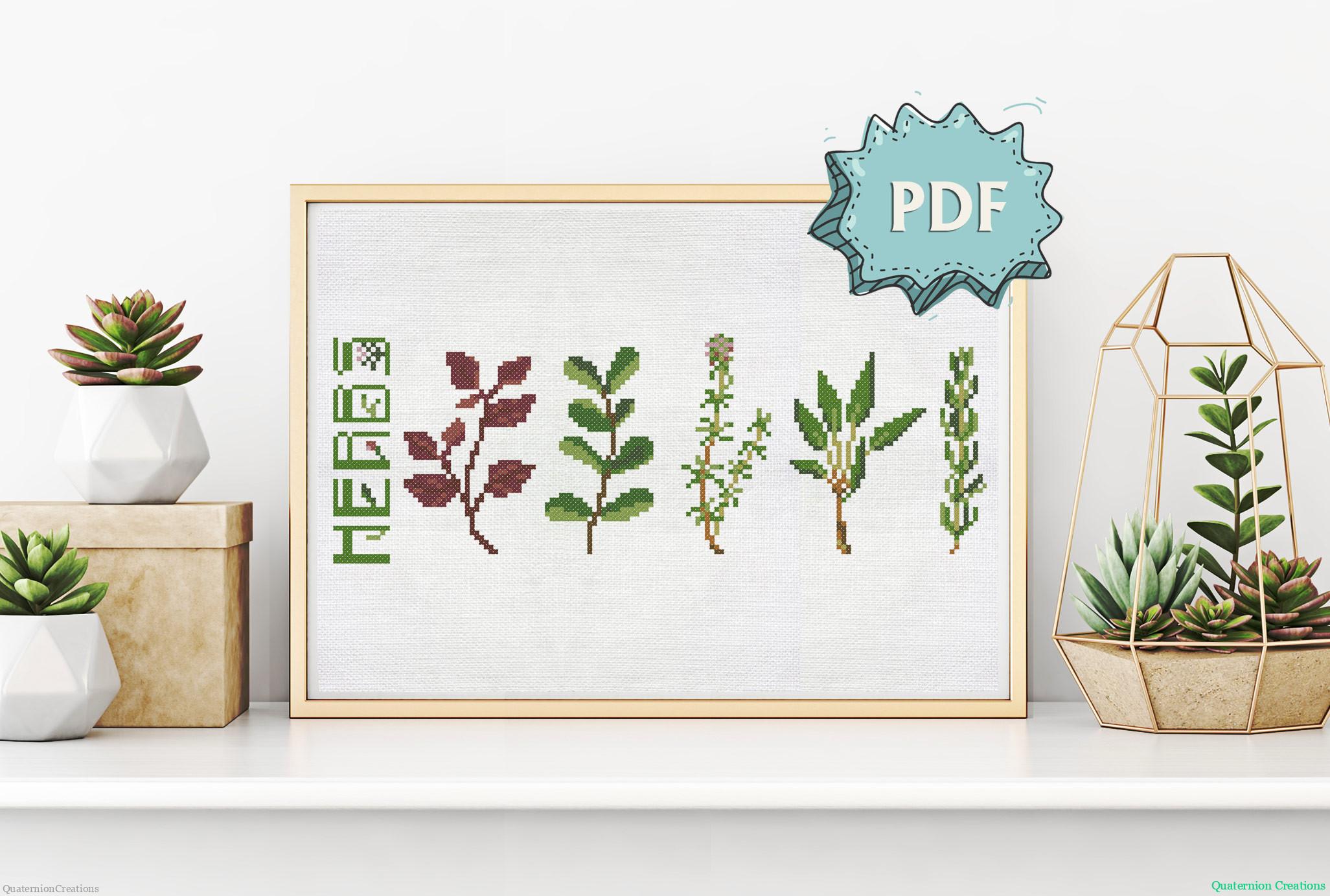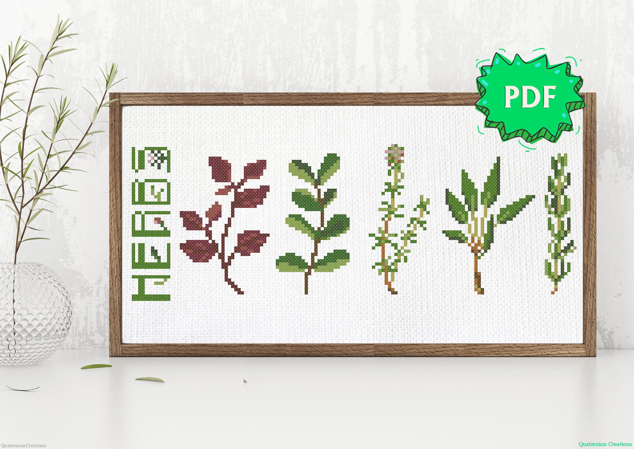 A nice set of culinary herbs – basil, mint, thyme, sage, and rosemary – to stitch together or separately.