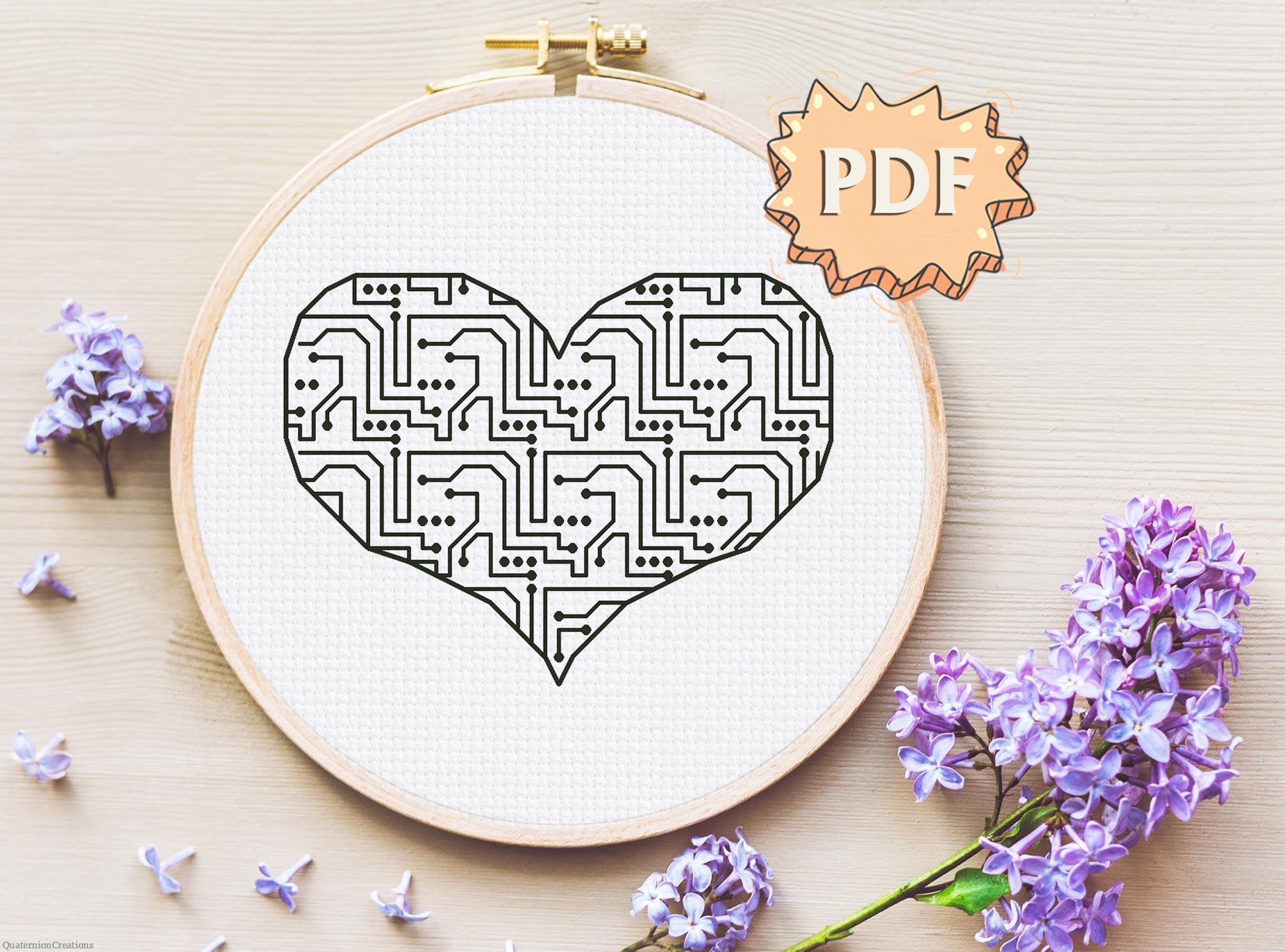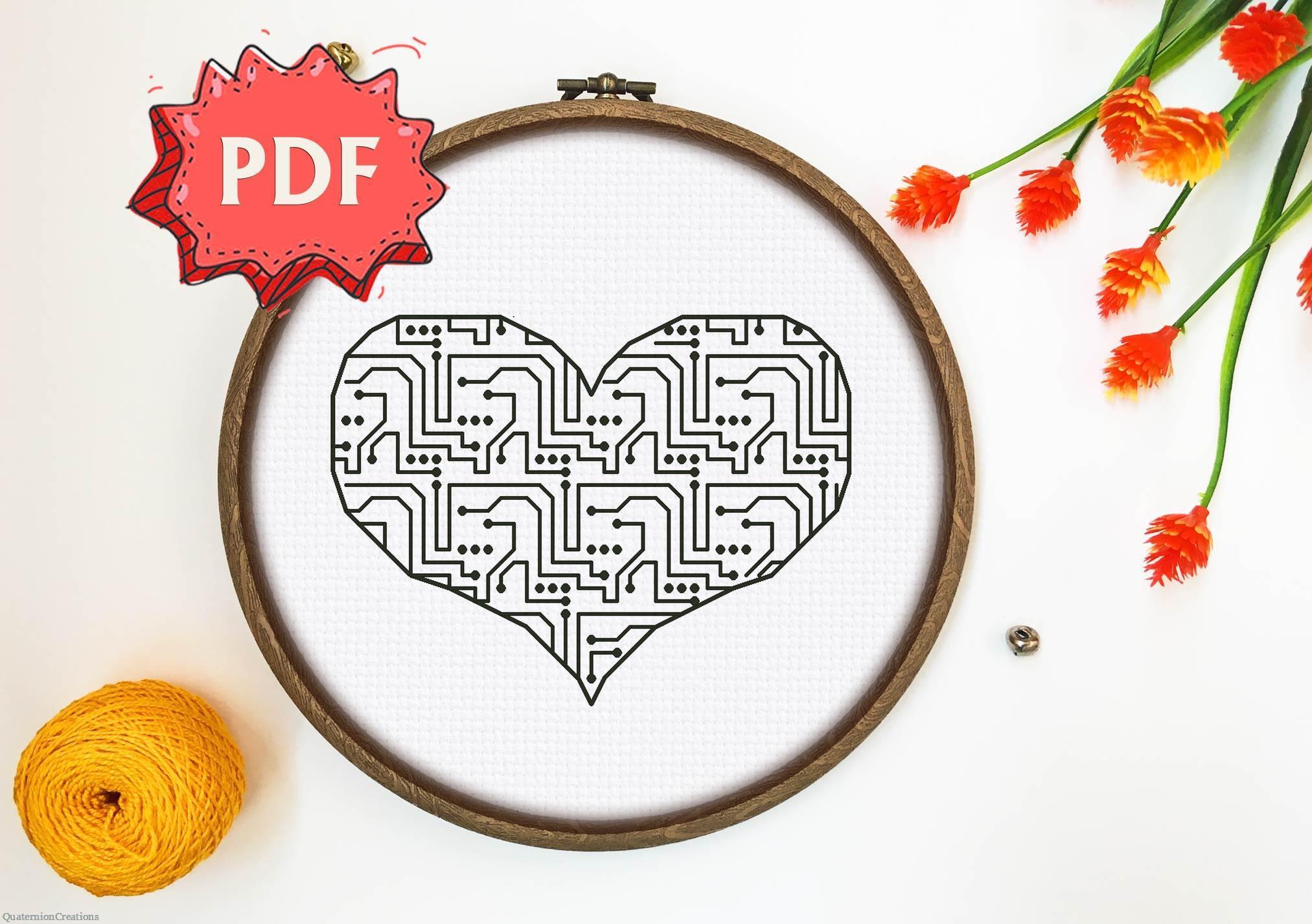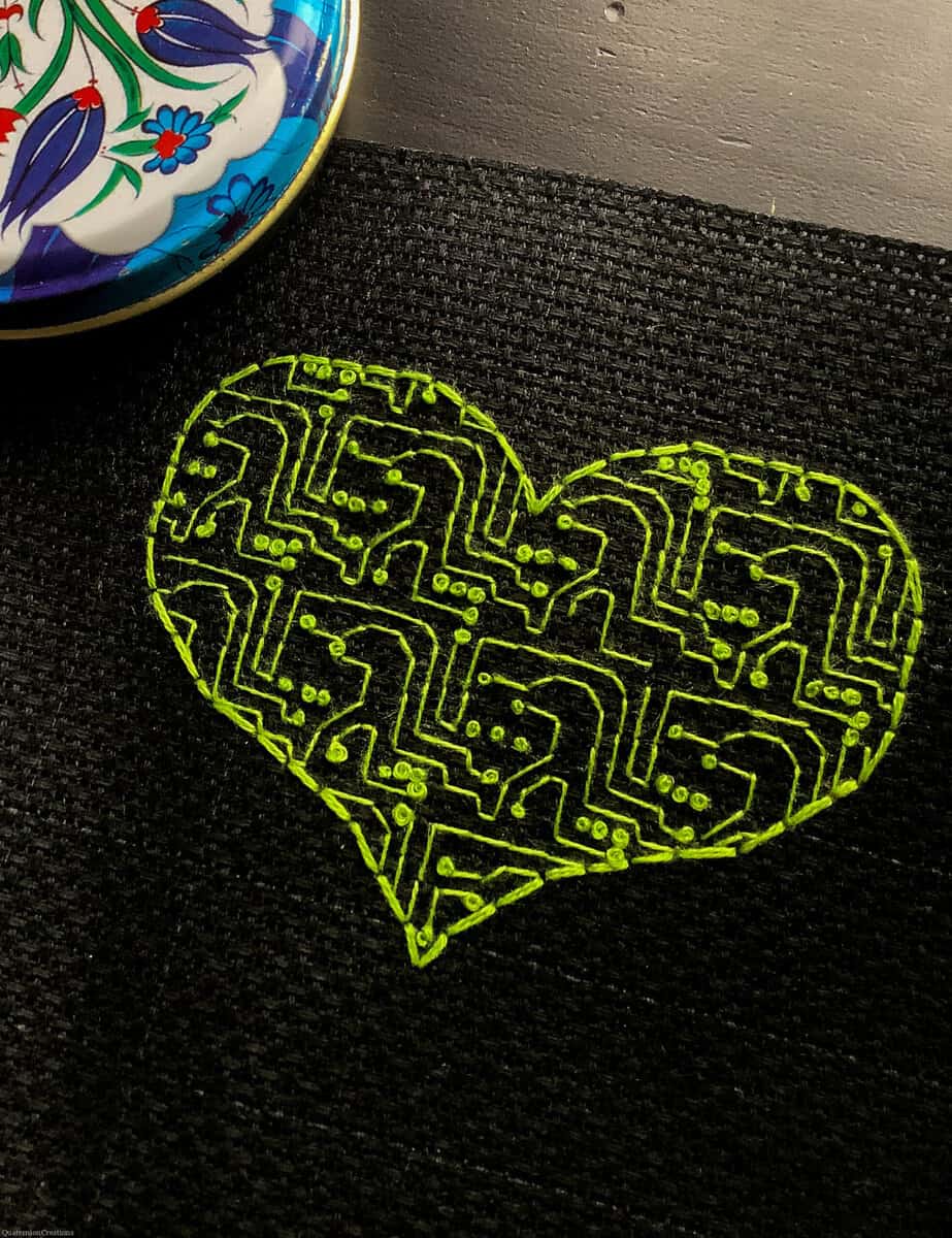 A pretty little heart with a circuit/microchip blackwork pattern to make a perfect geeky Valentine’s Day gift.