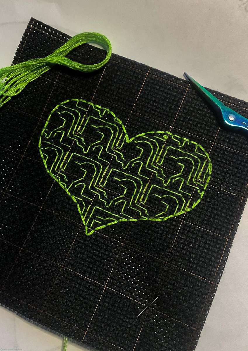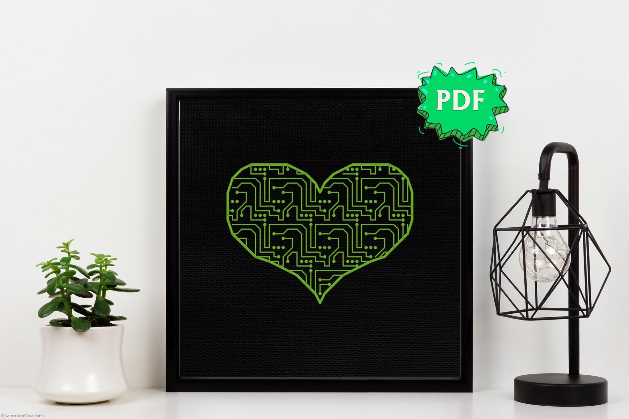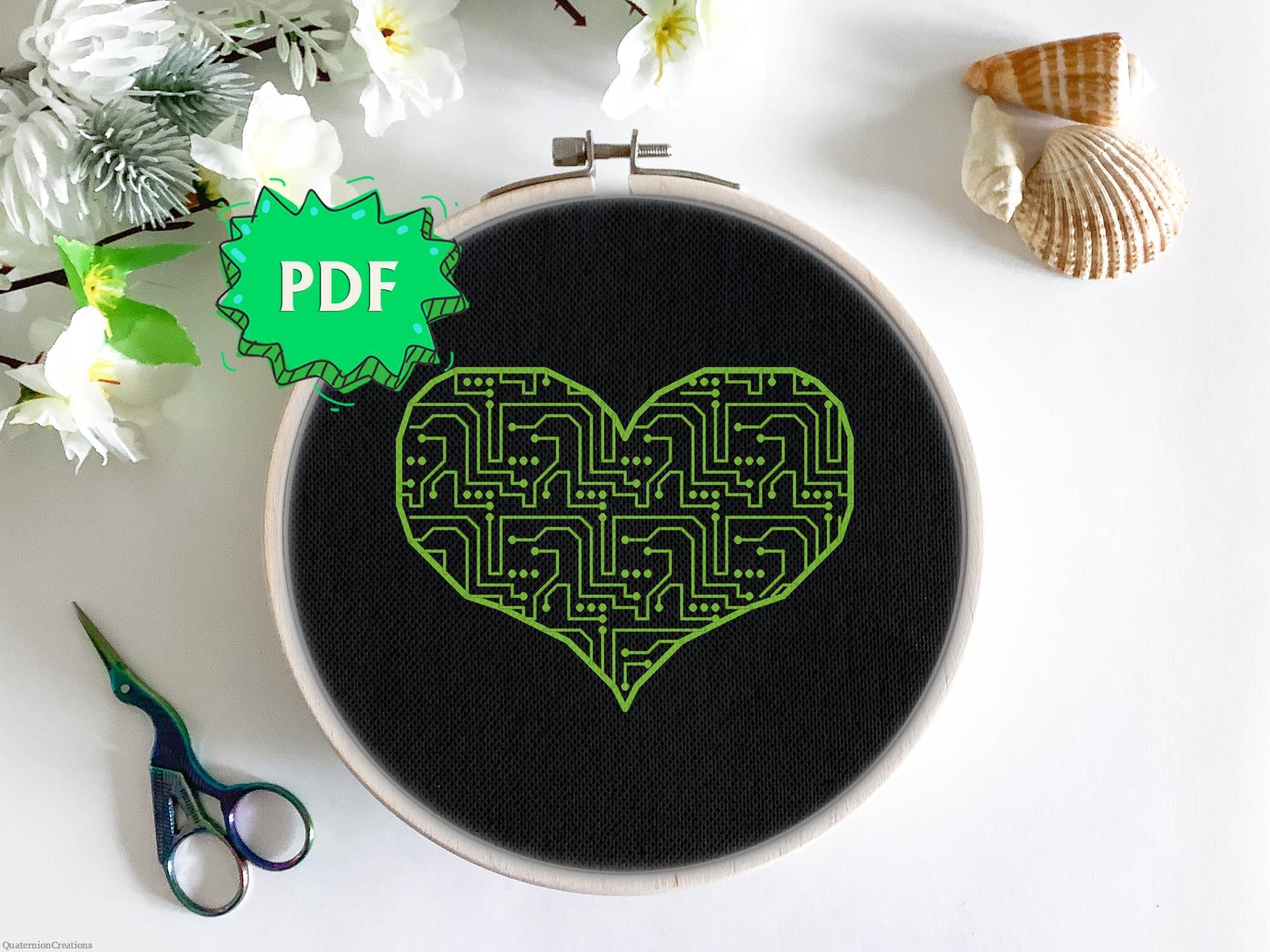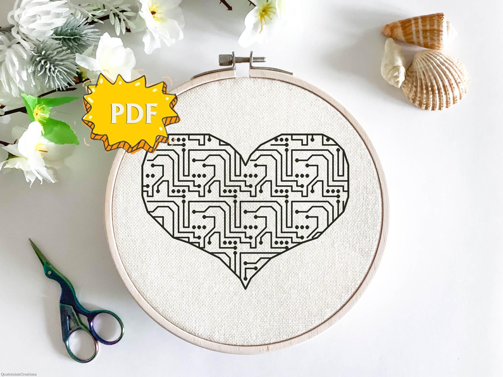 A pretty little heart with a circuit/microchip blackwork pattern to make a perfect geeky Valentine’s Day gift.