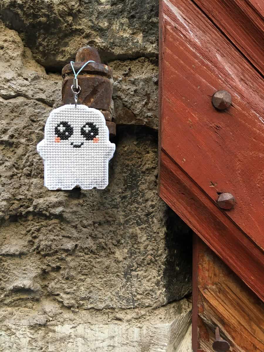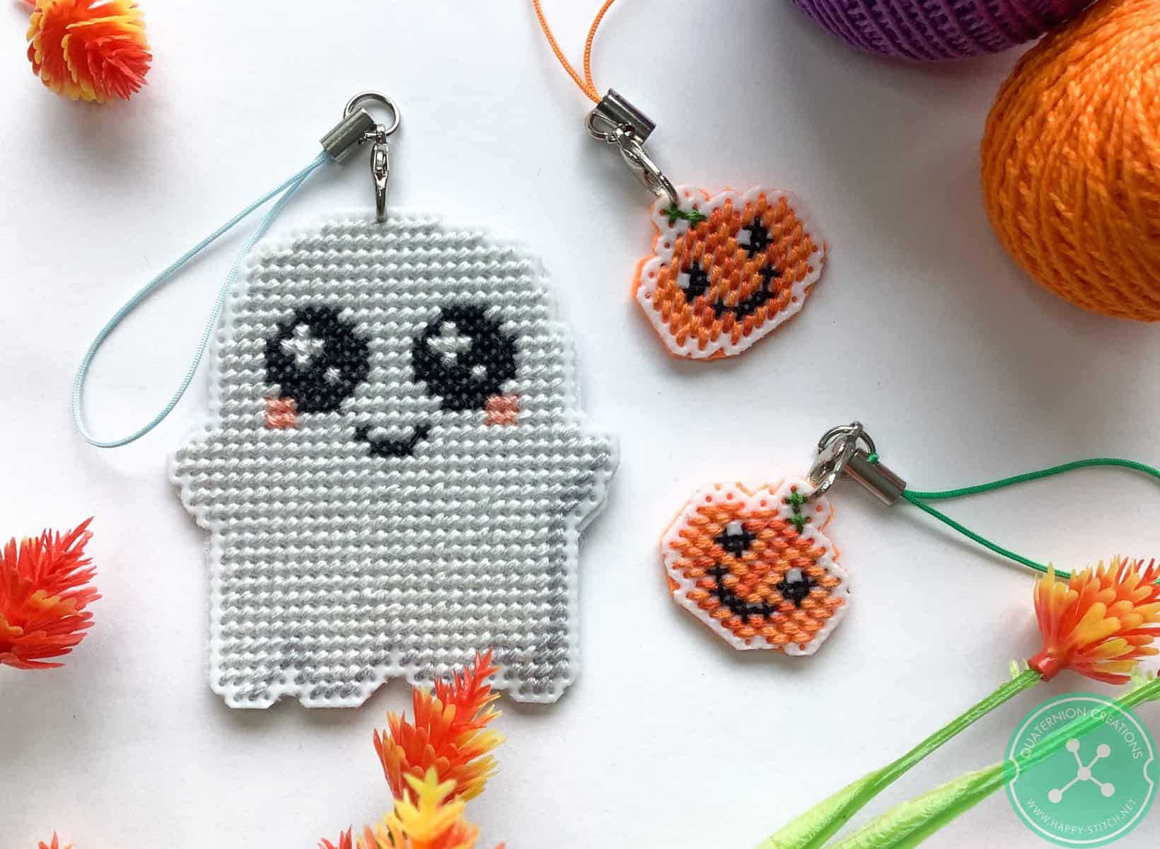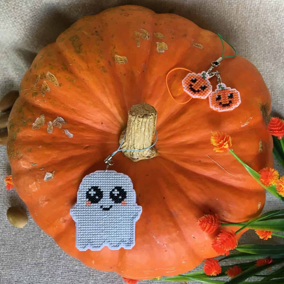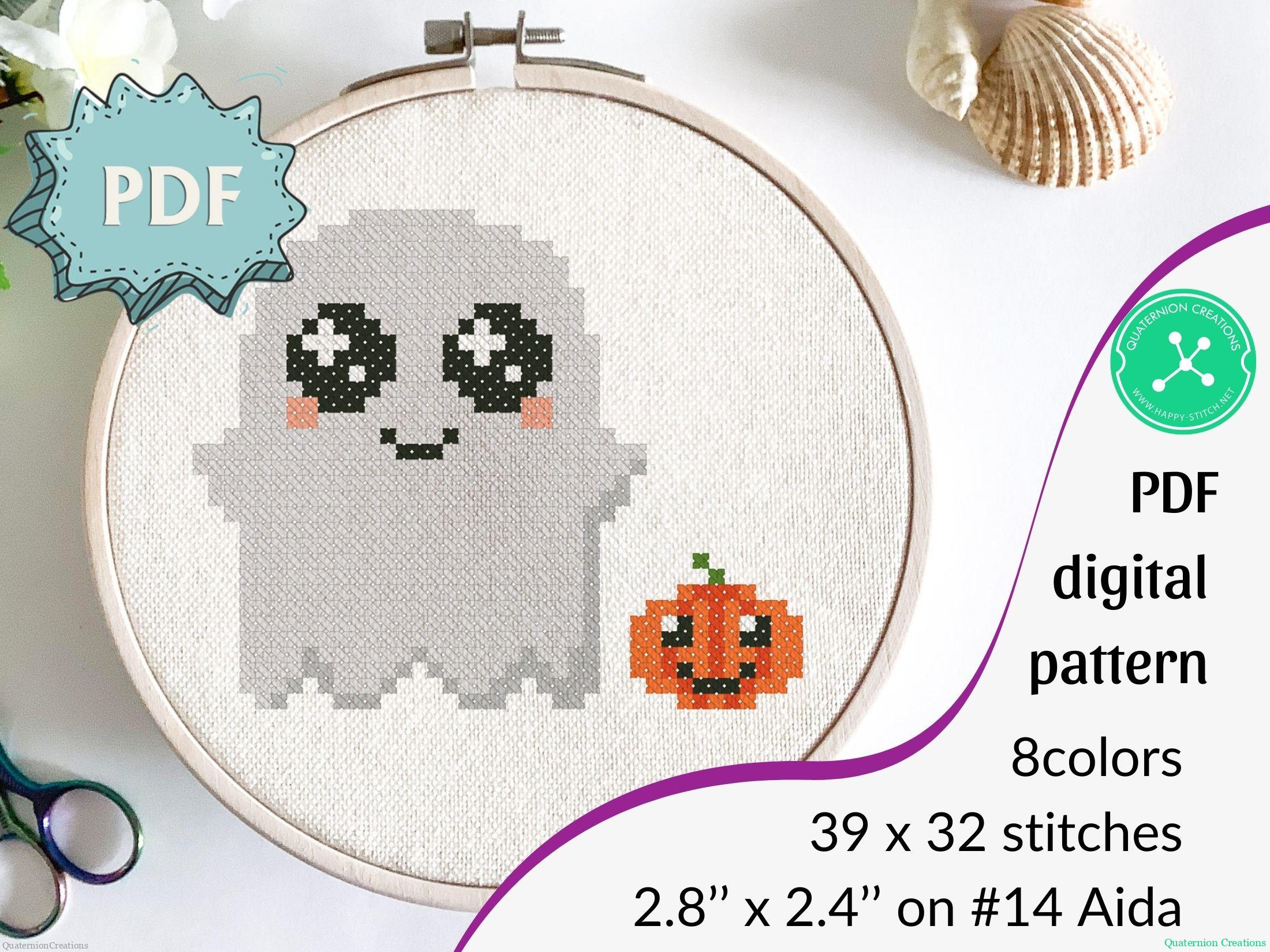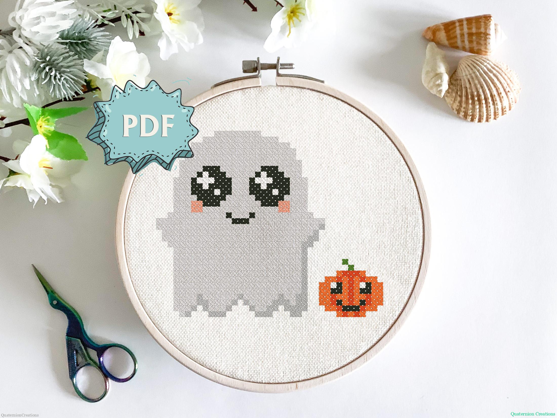 A simple and fun cross stitch pattern featuring a cute little ghost with a very friendly pumpkin.