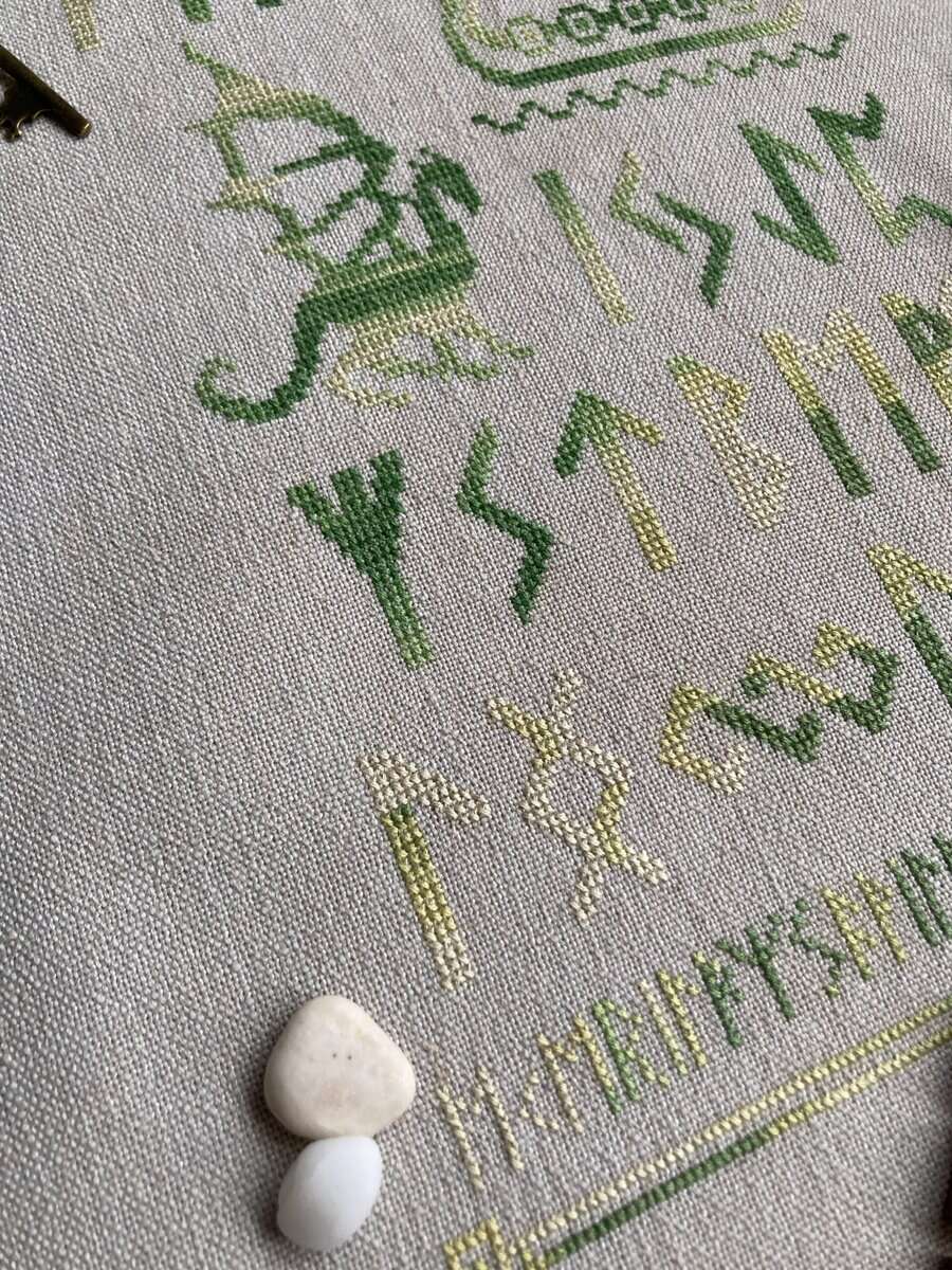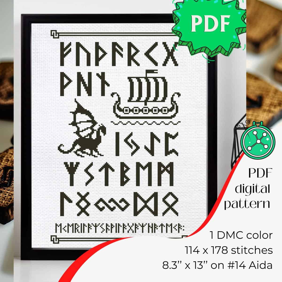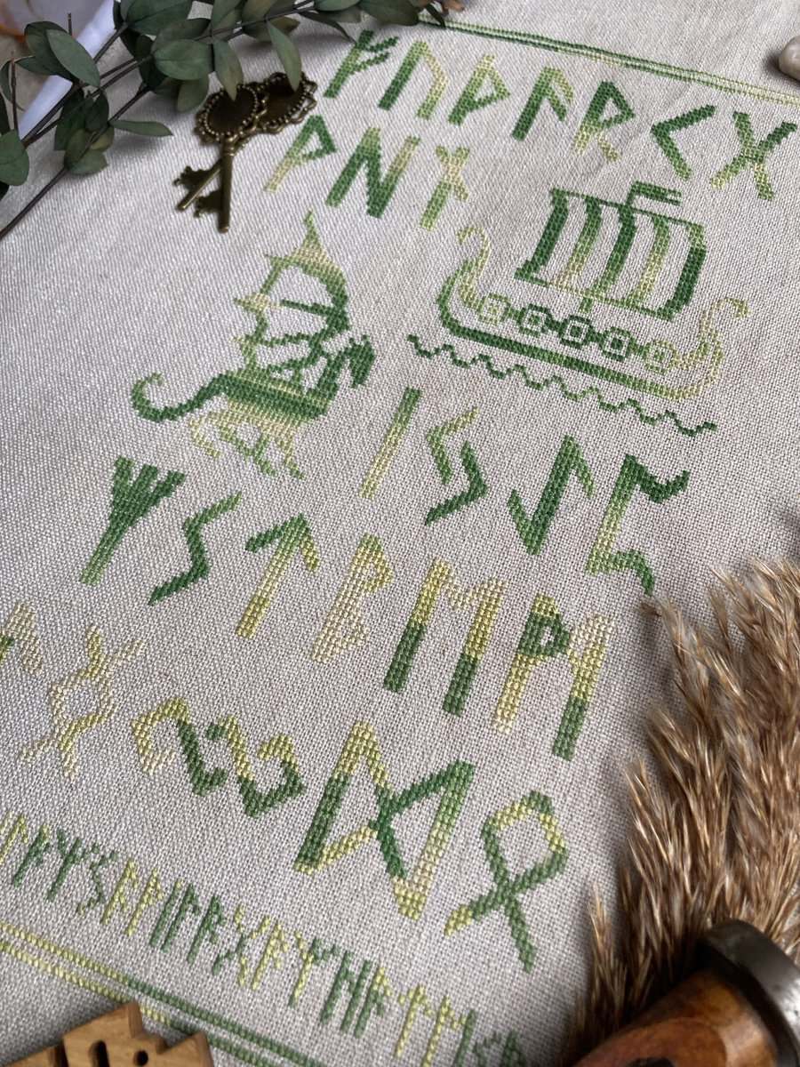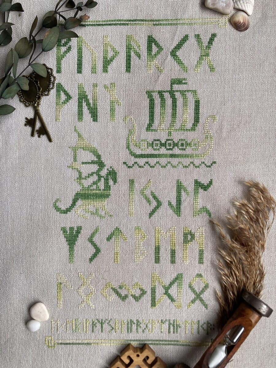 A beautiful and crisp sampler with all 24 Elder Futhark runes embellished with a traditional Viking ship (drakkar) and a dragon. The bottom text is a copy of the inscription on the Lindholm Amulet ( see https://en.wikipedia.org/wiki/Lindholm_amulet )