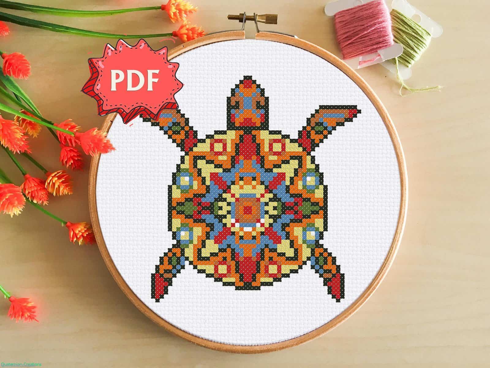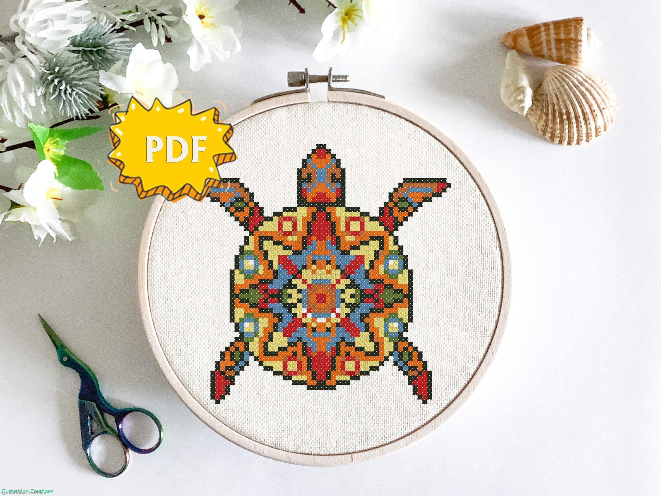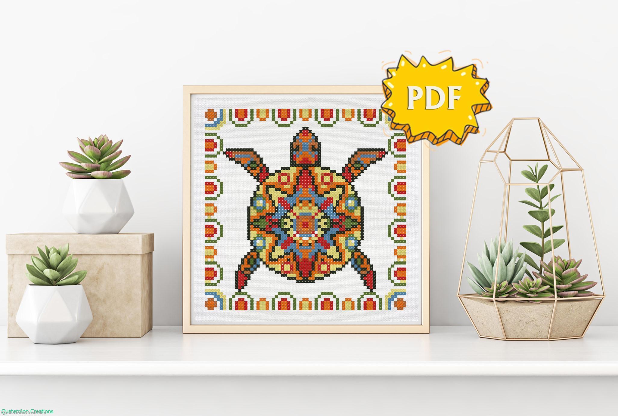 A gorgeous colorful design with an ethnic-inspired turtle. Can be stitched in its original square border, or without a border to make an ornament or a hoop.