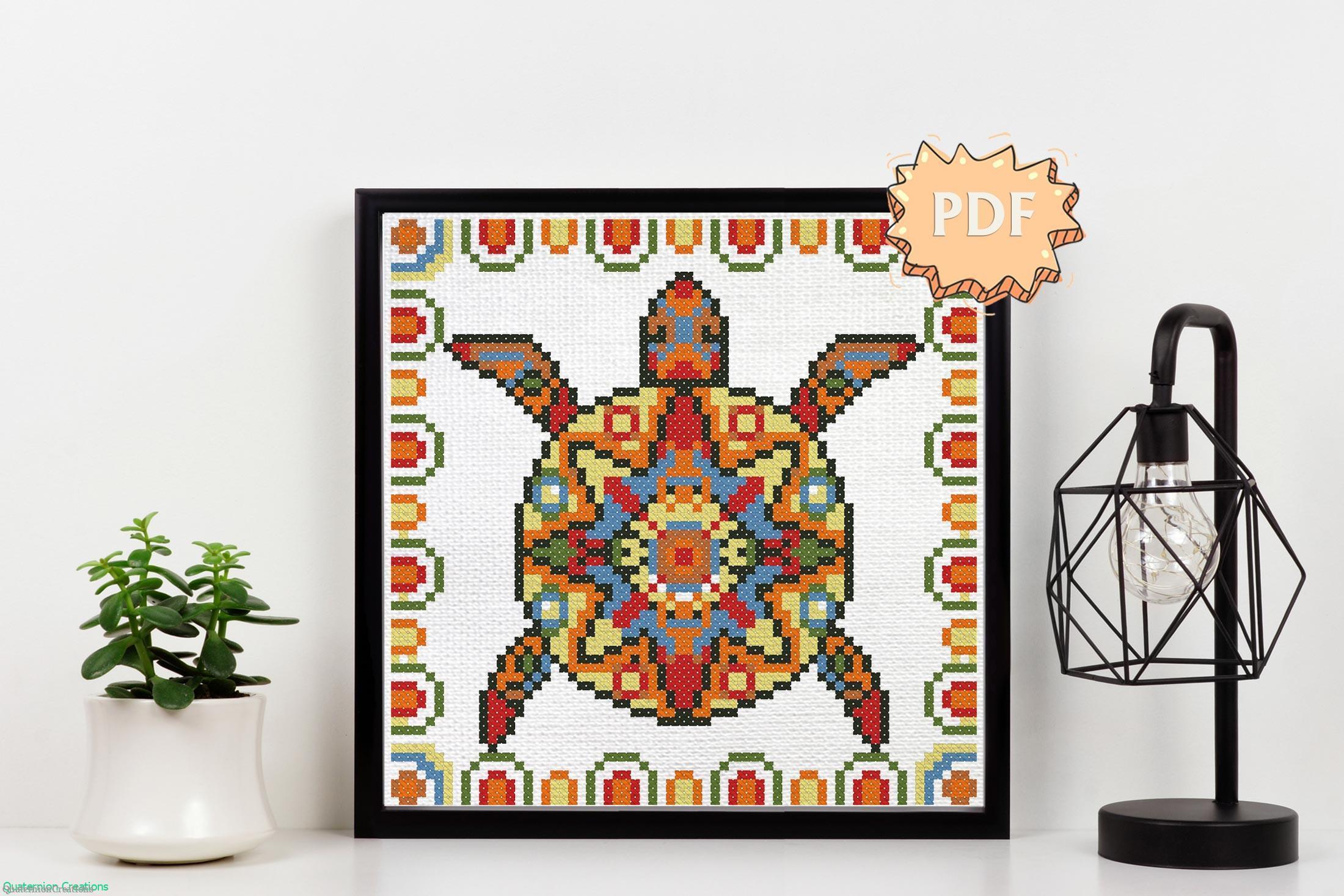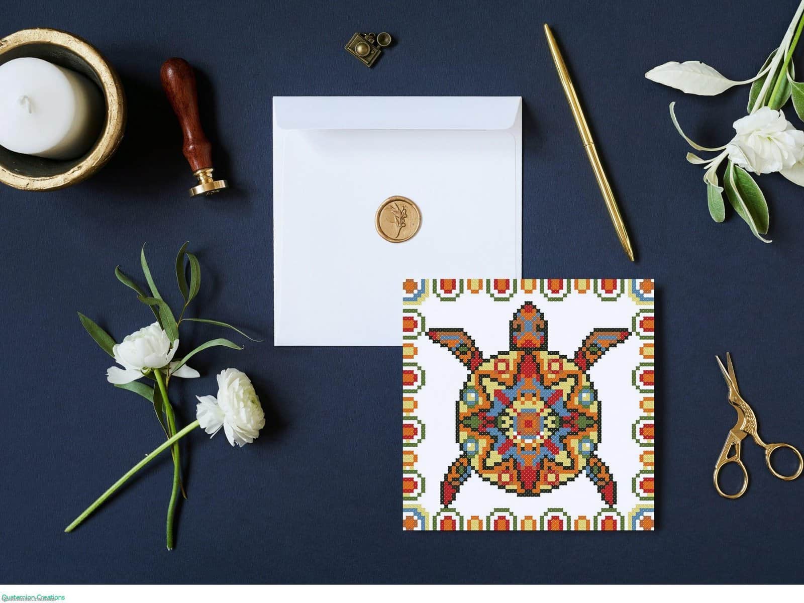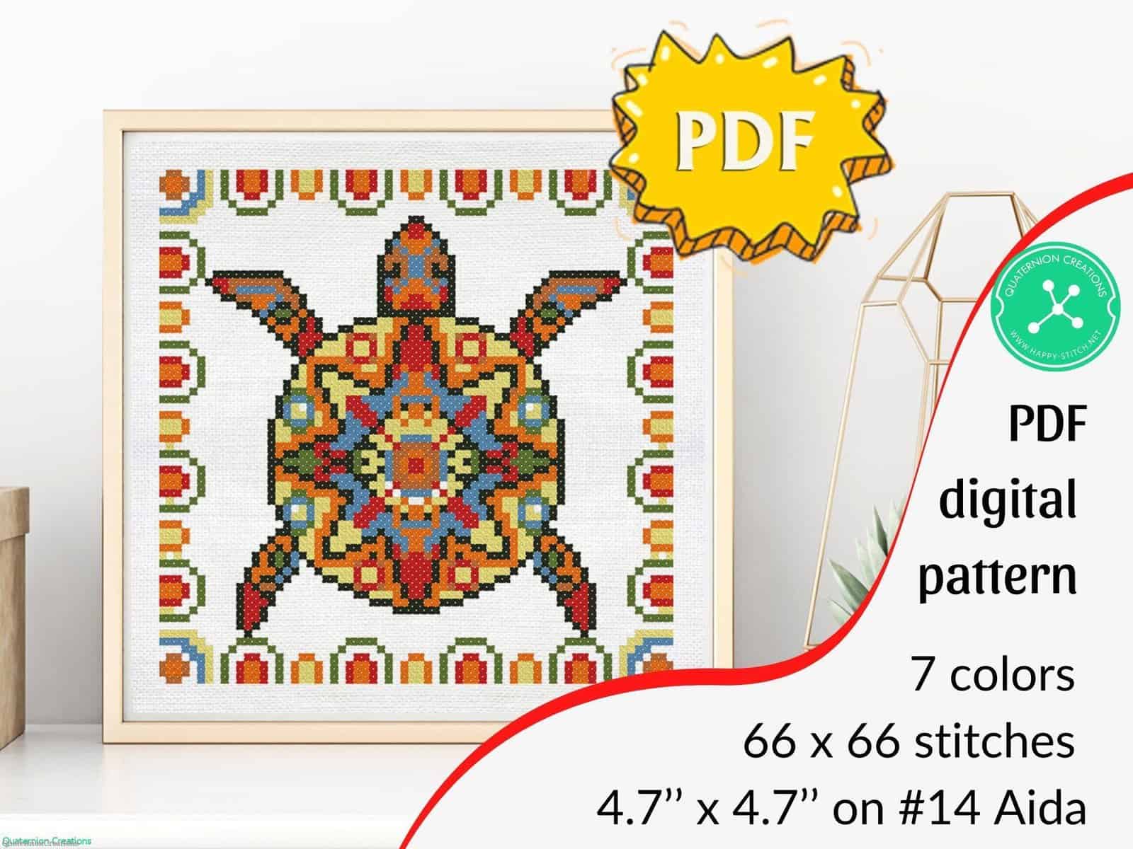 A gorgeous colorful design with an ethnic-inspired turtle. Can be stitched in its original square border, or without a border to make an ornament or a hoop.