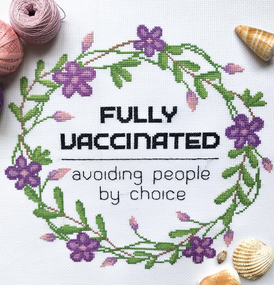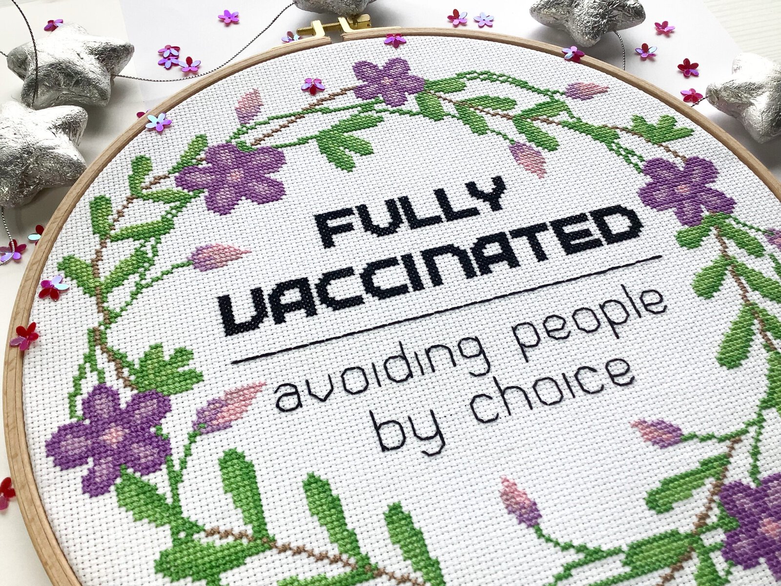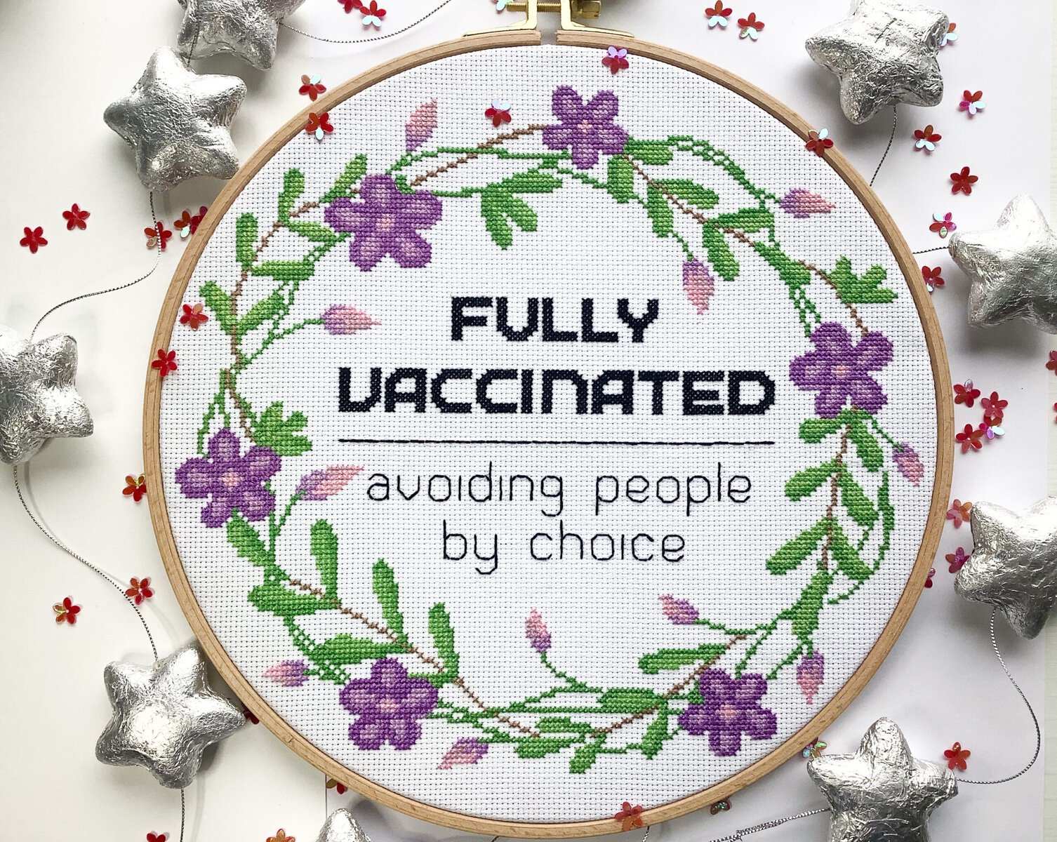 Fully Vaccinated, avoiding people by choice – a modern cross stitch pattern.