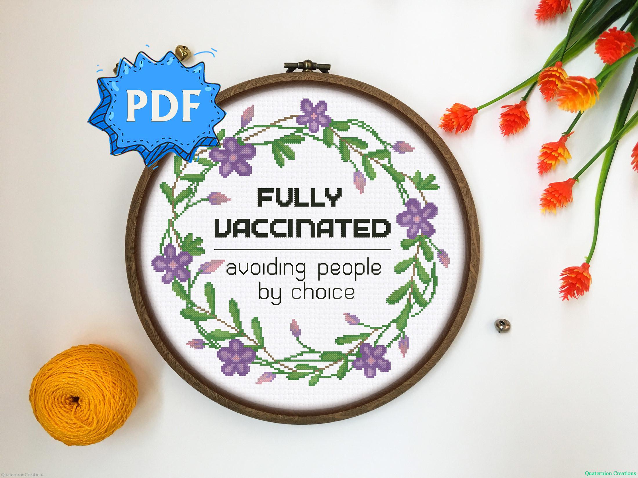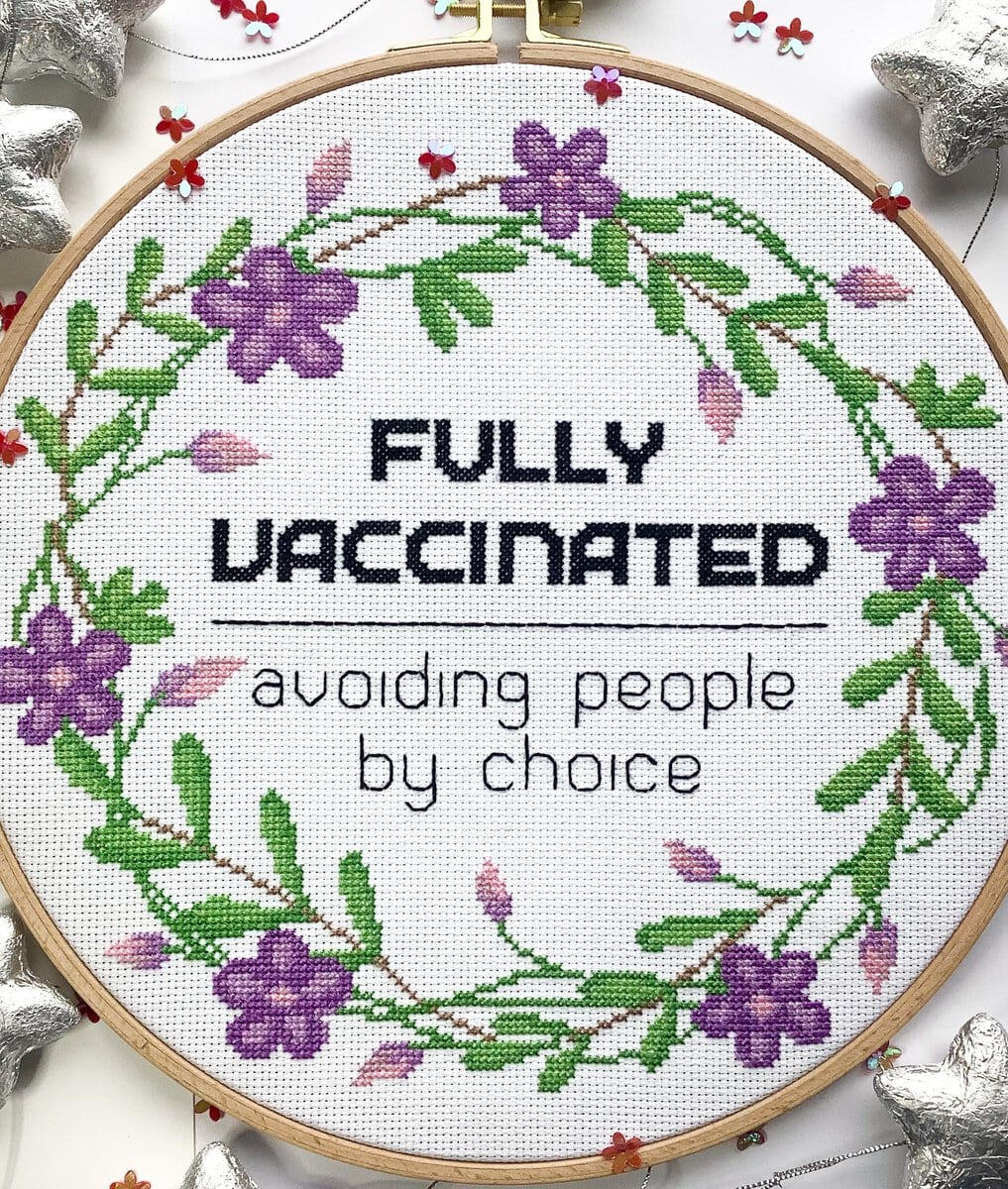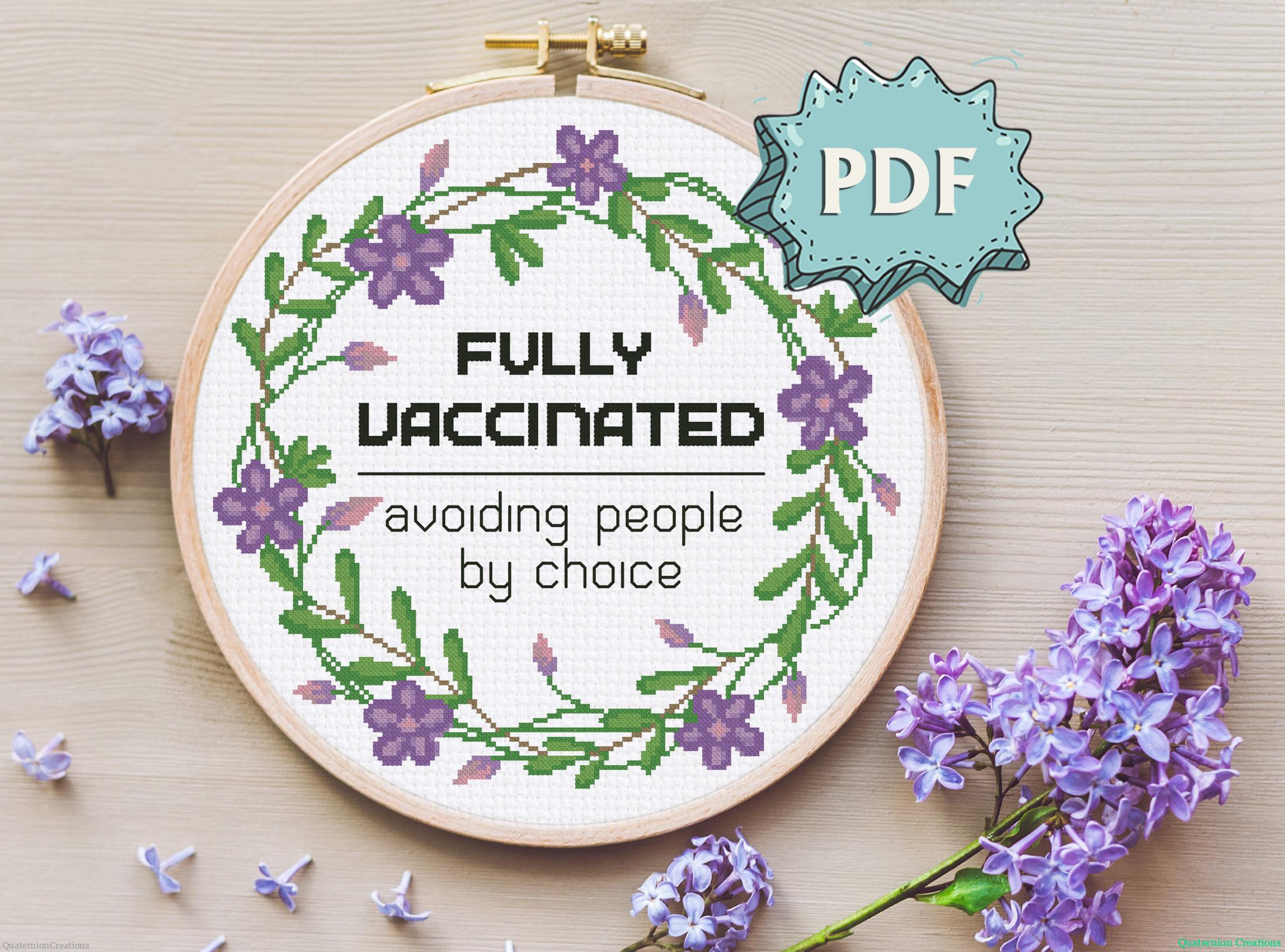 Fully Vaccinated, avoiding people by choice – a modern cross stitch pattern.