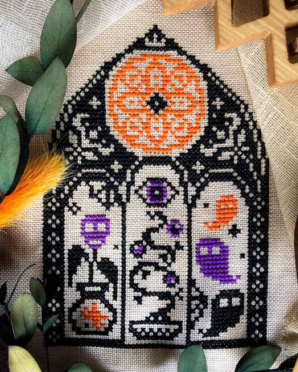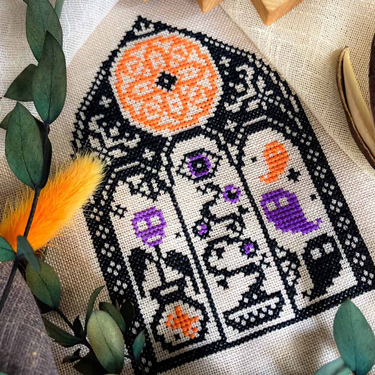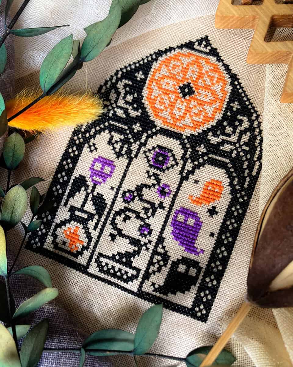Pattern size: 55 x 77 stitches, three colors (model stitched in called-for DMC)