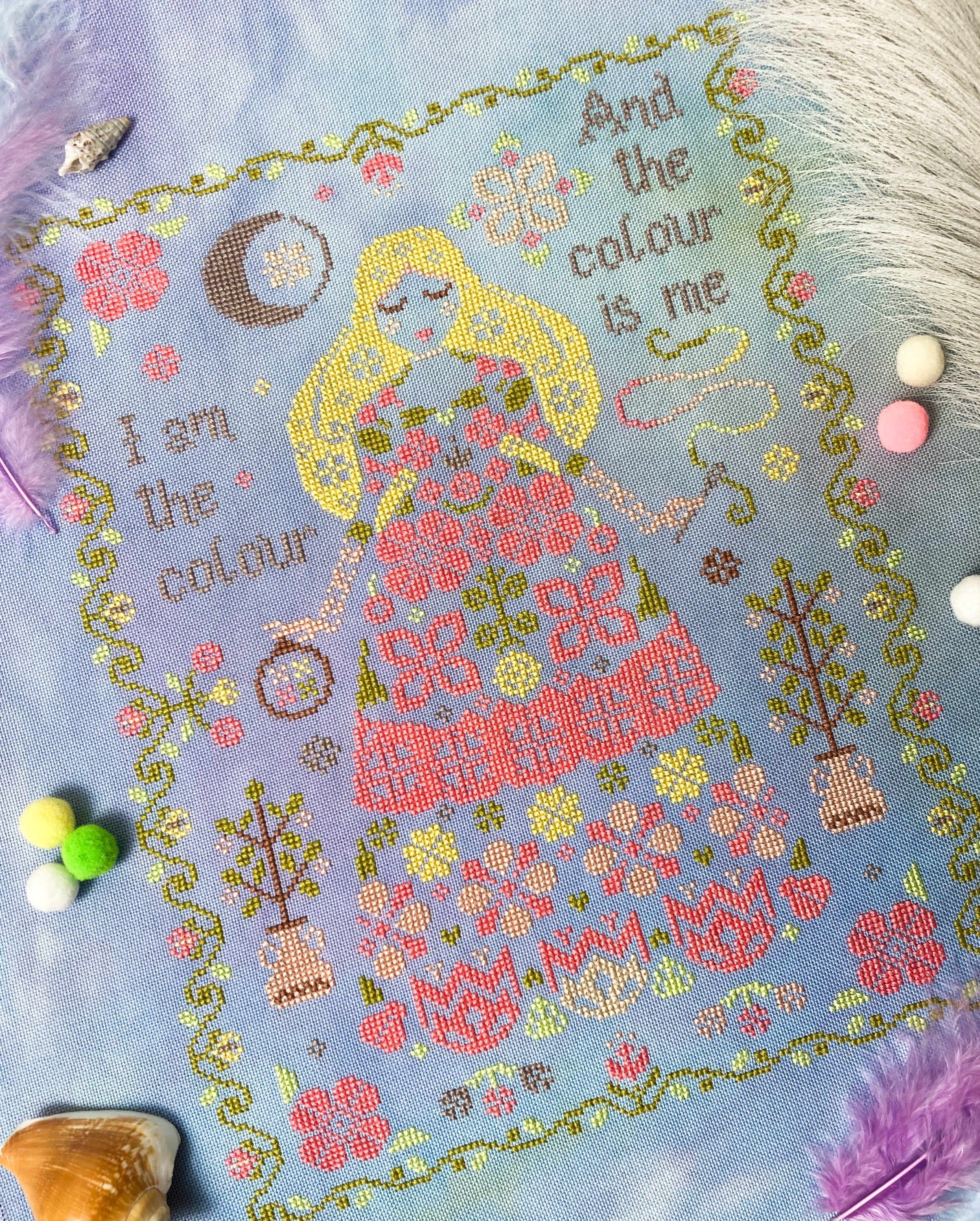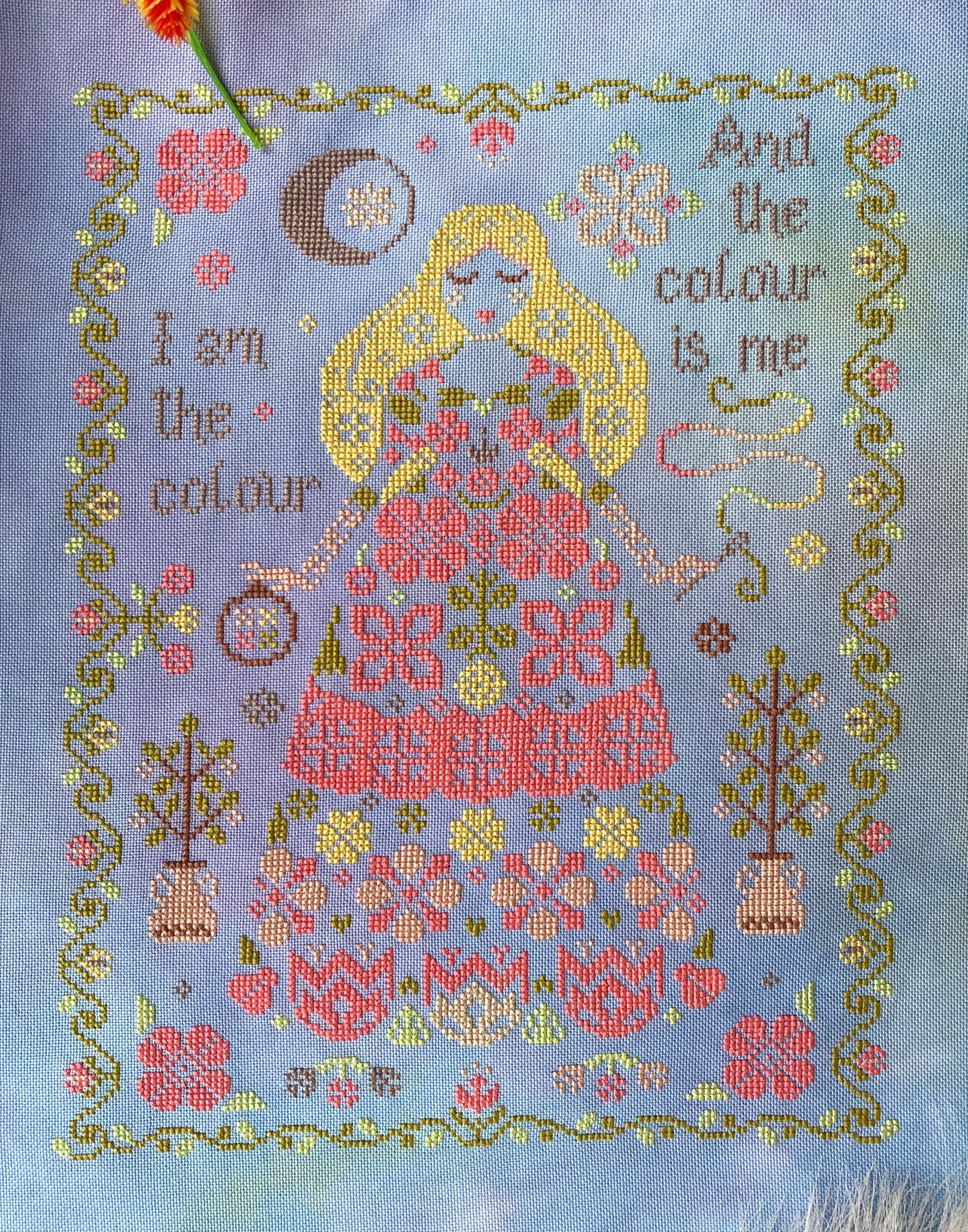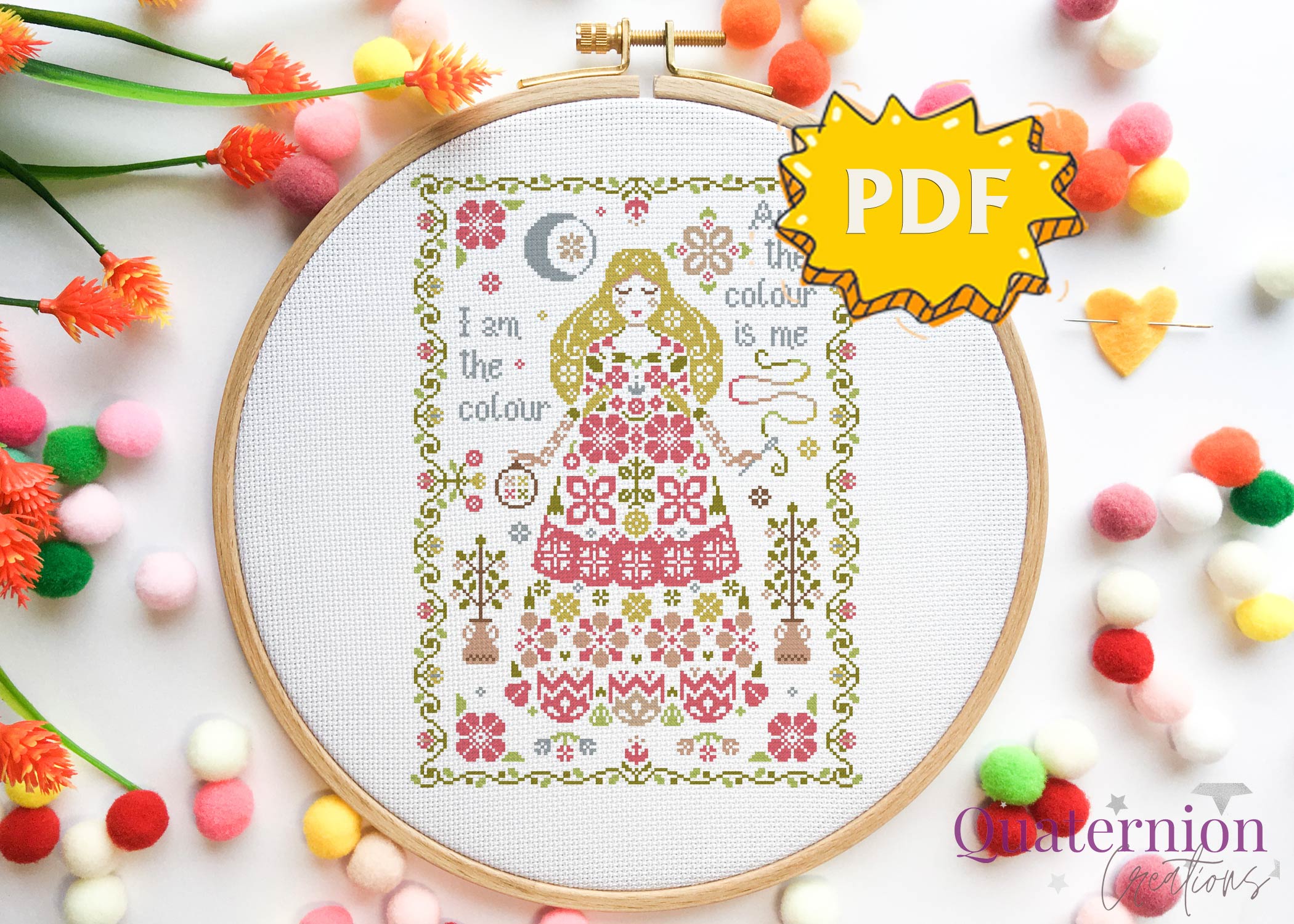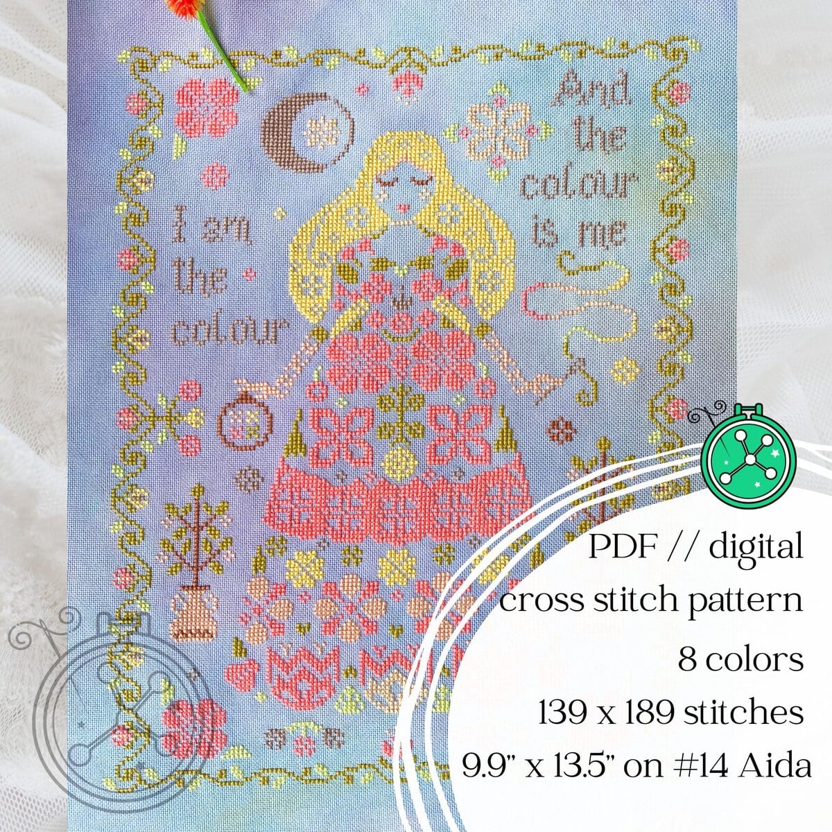 Spring Goddess (I am the colour) is a beautiful primitive cross stitch pattern inspired by the Roman goddess of flowers Flora.