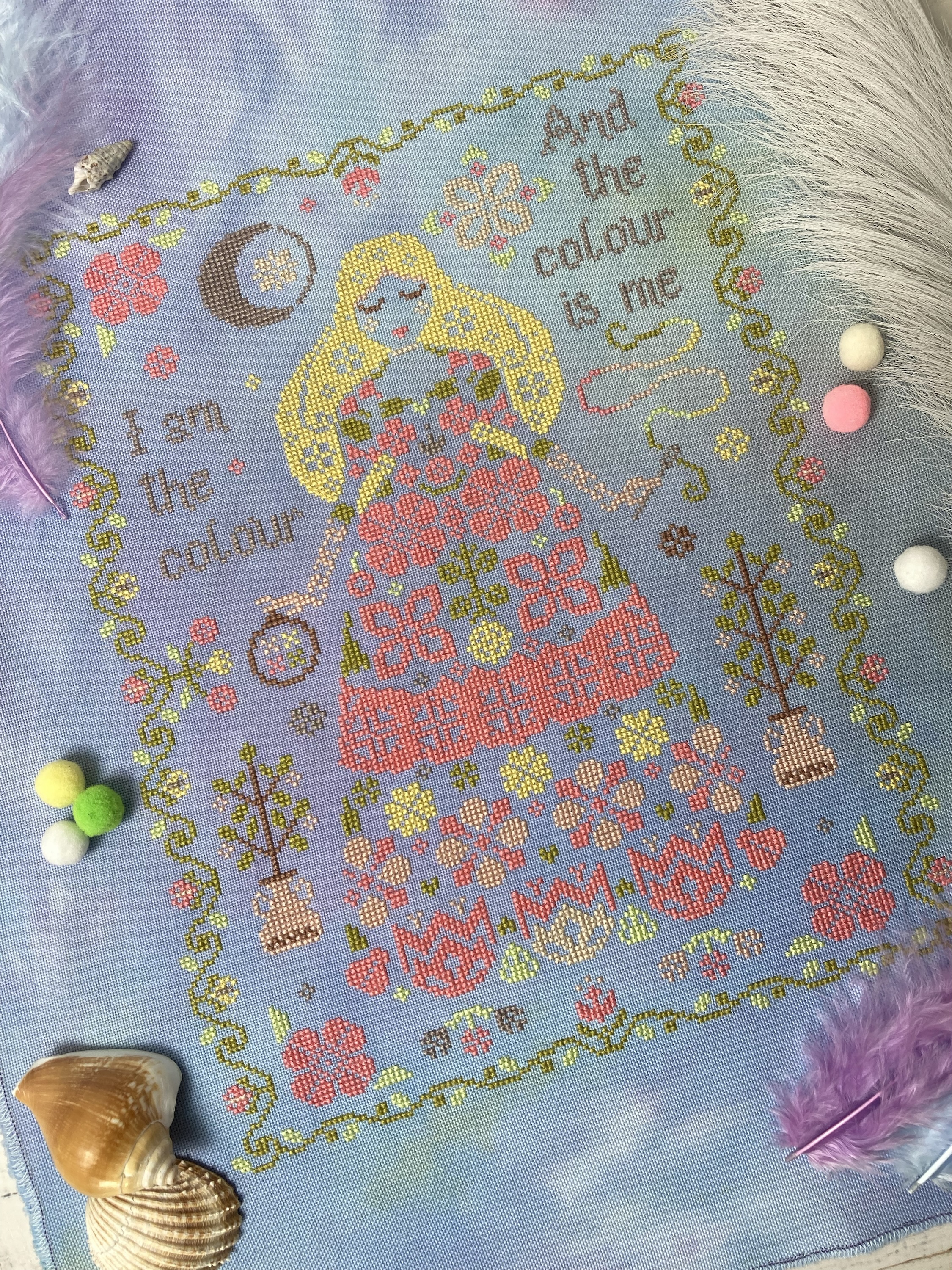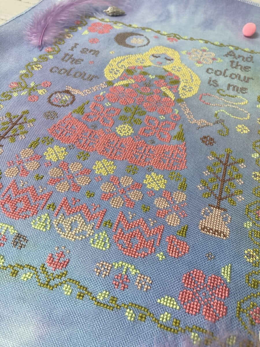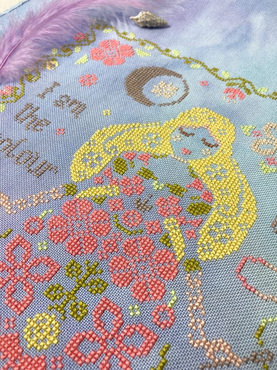 The model is lovingly cross stitched on 32 count Freya linen by Under the Sea fabrics in called for DMC colors with one colors substitution to accommodate for the fabric.