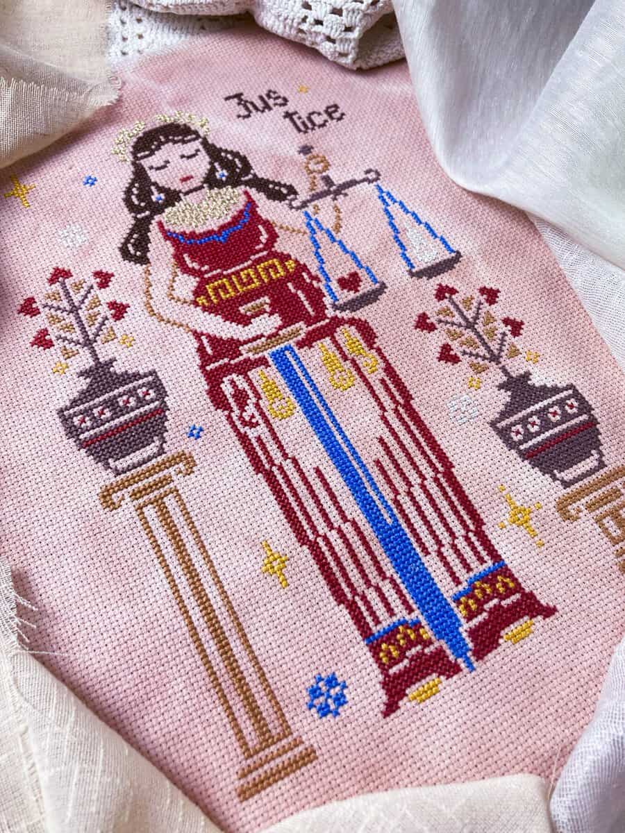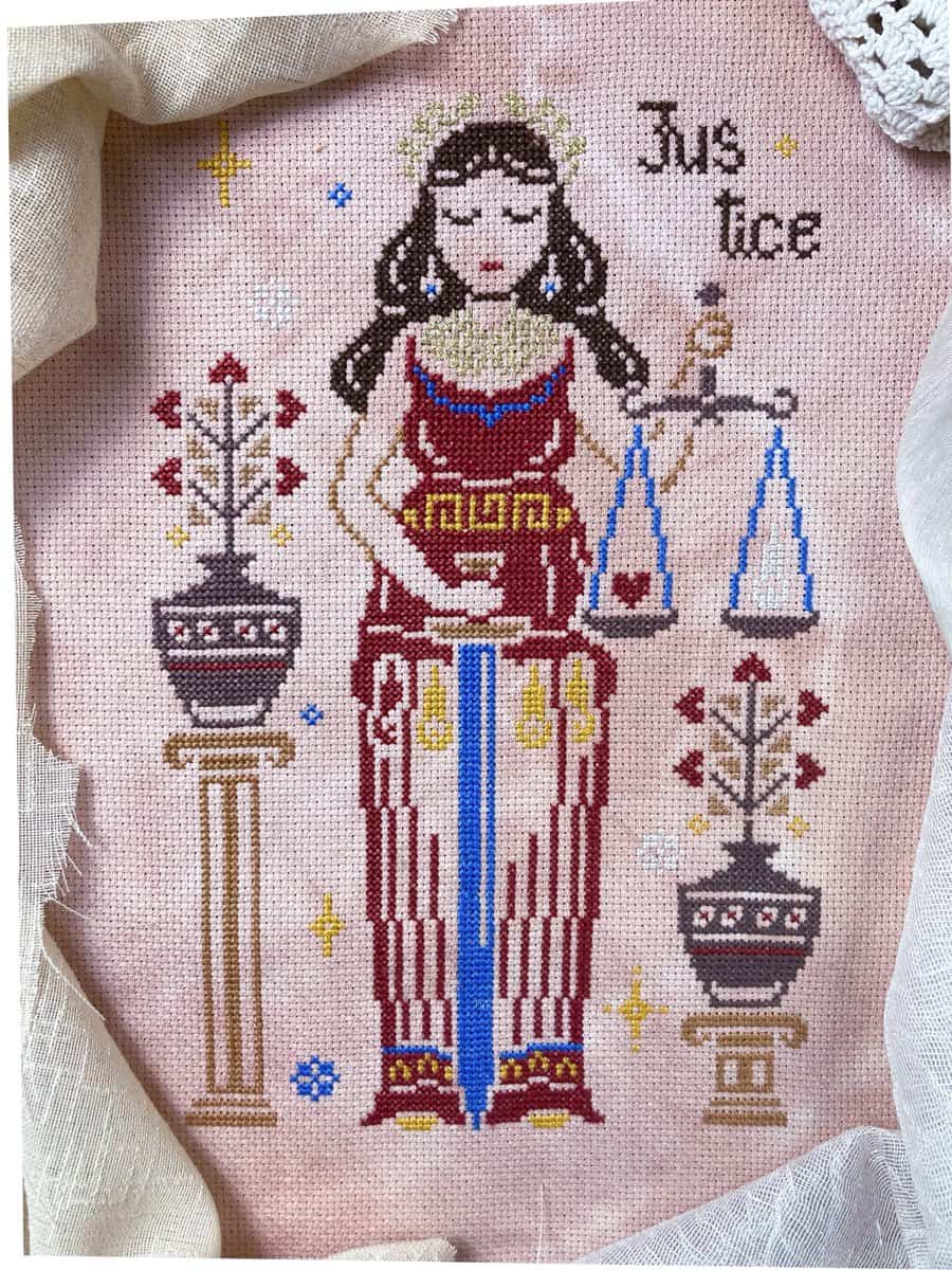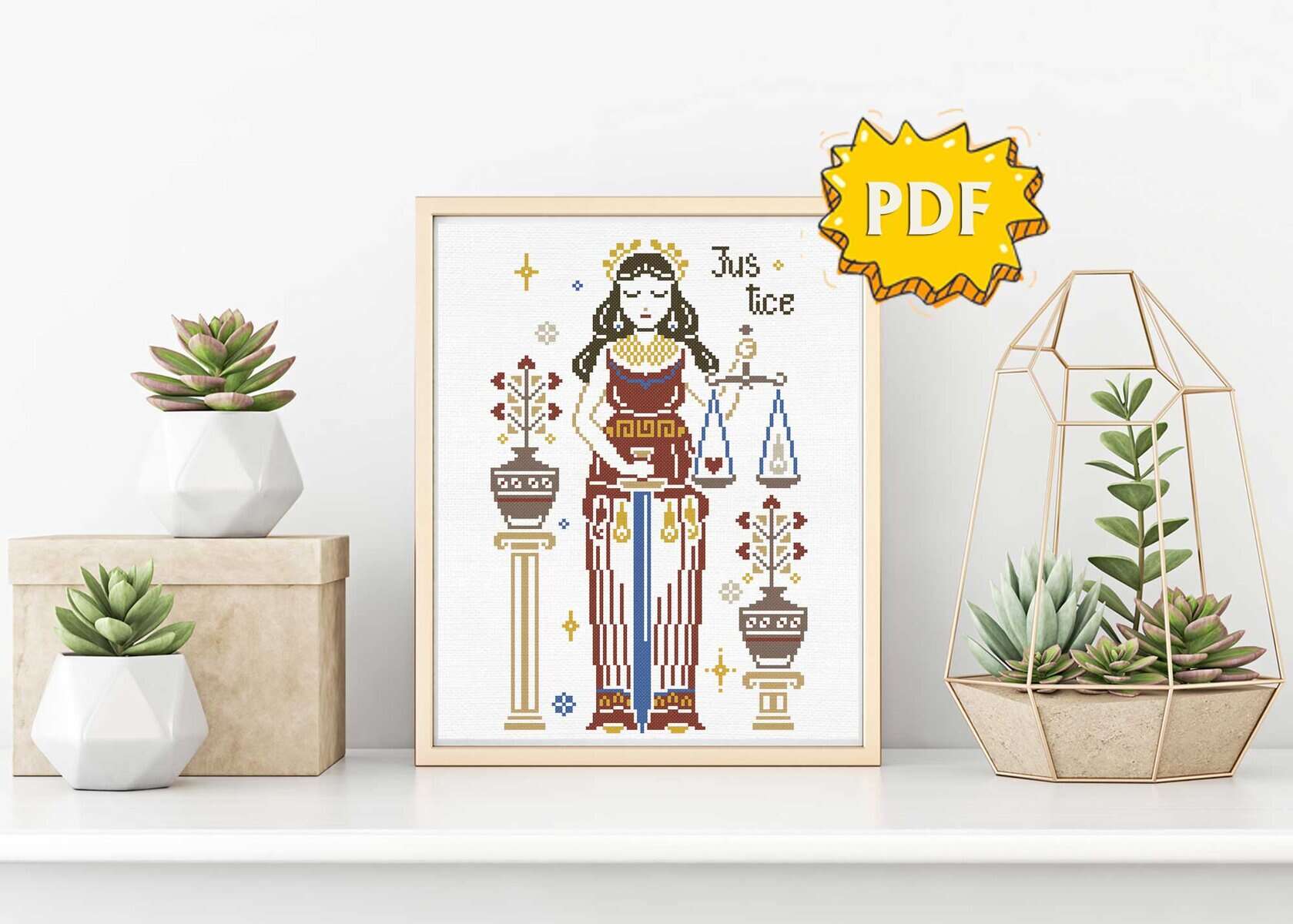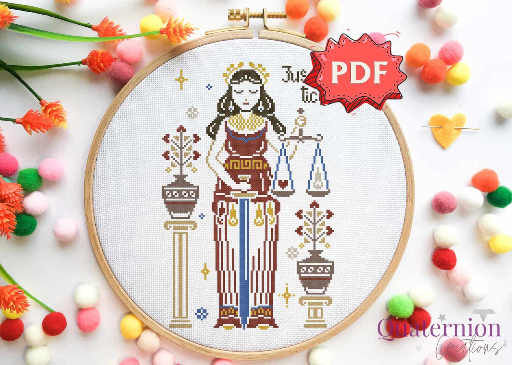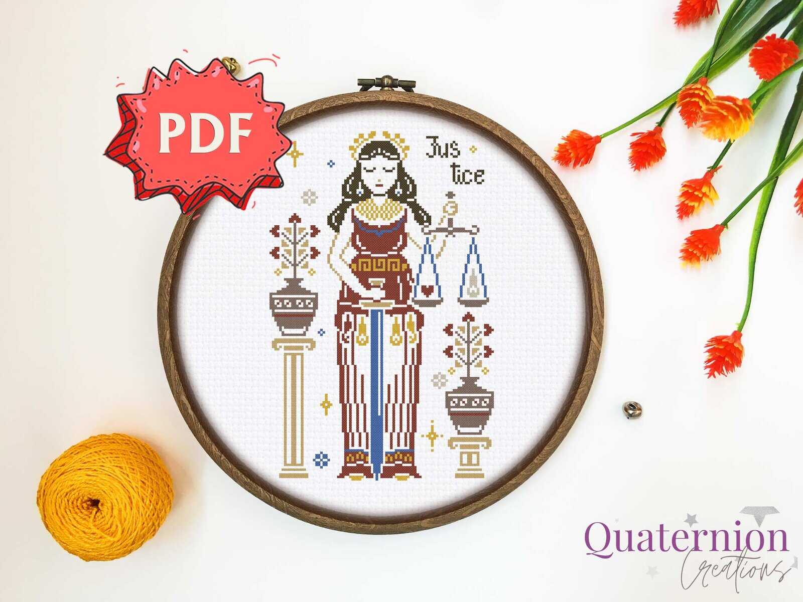 This cross-stitch pattern featuring Justitia is a inspired by the Roman goddess of justice and morality. With her iconic scales and sword, Justitia serves as a powerful symbol of the impartial administration of justice.