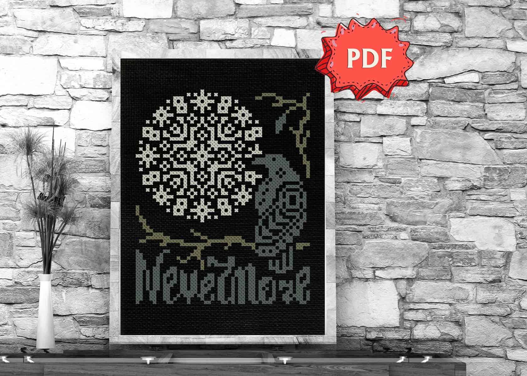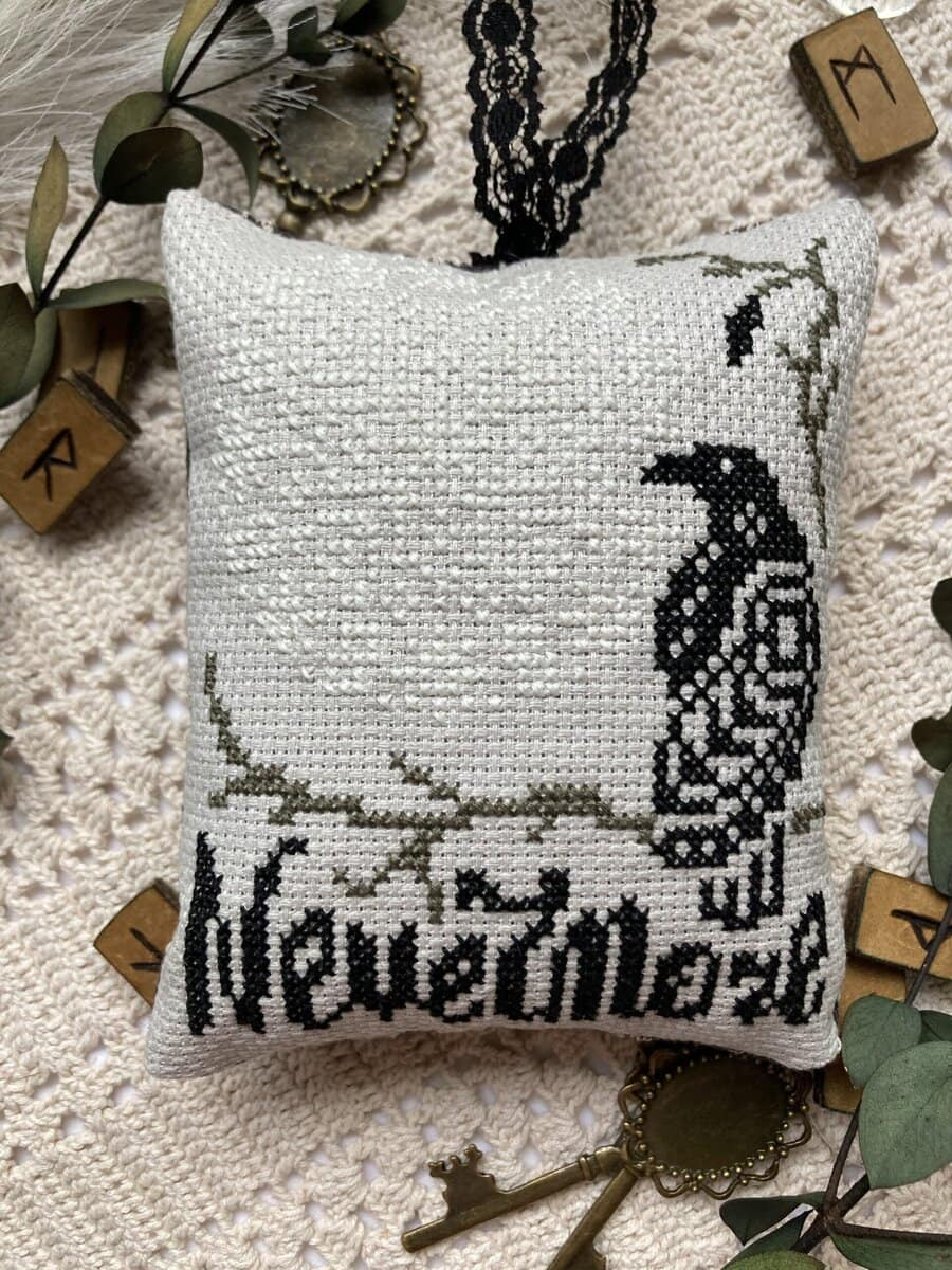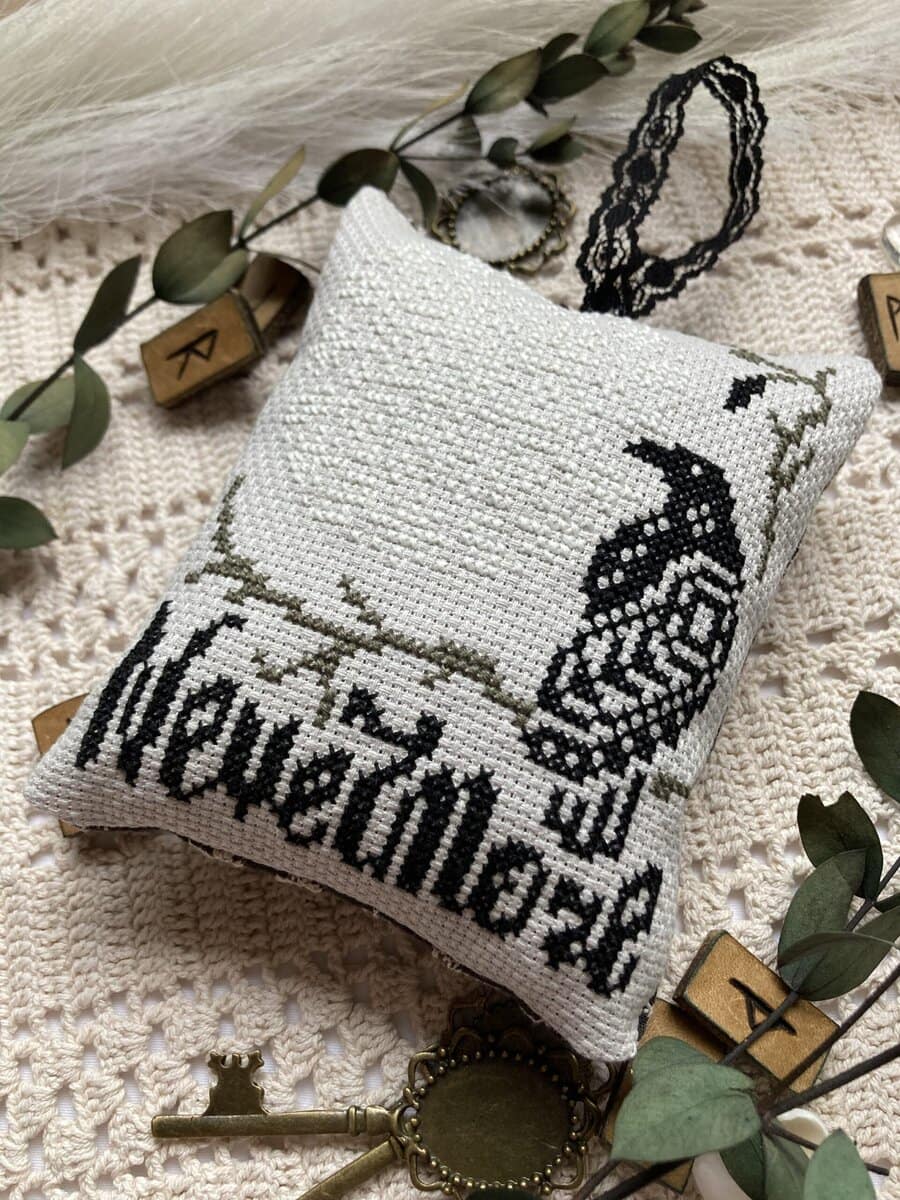 The Nevermore cross stitch pattern is inspired by E.A. Poe’s best known poem, The Raven: