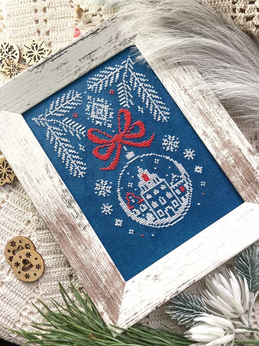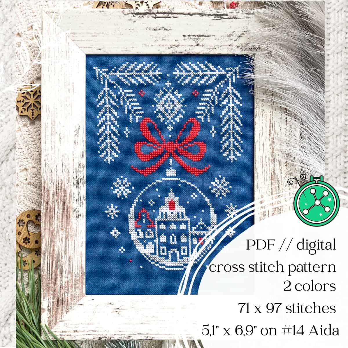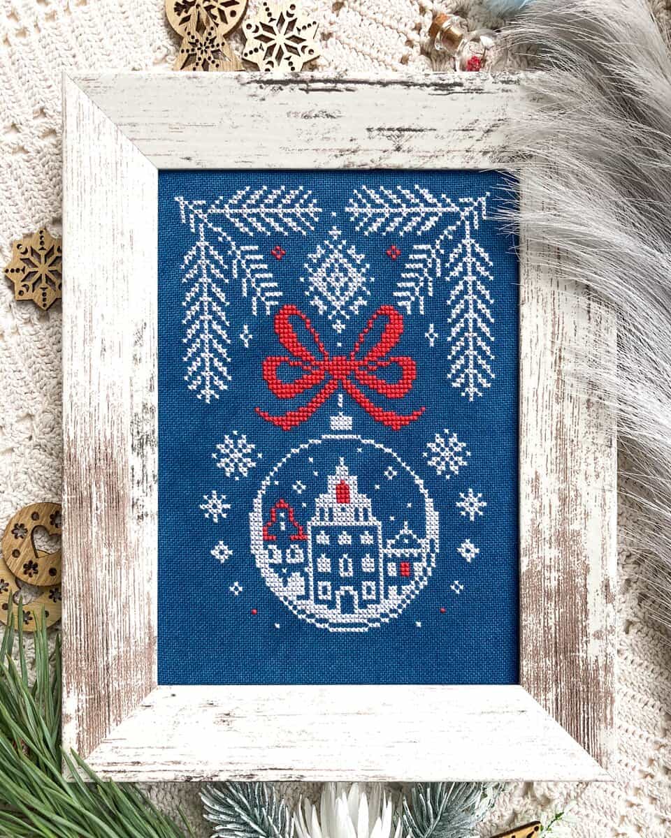 Nordic Yuletide is the perfect cross stitch design for a nice and cozy Scandinavian Christmas. This almost monochromatic design features a quiet town in an ornament adorned with a bright red bow. Follow the called for colors or pick any other colors of your choice!