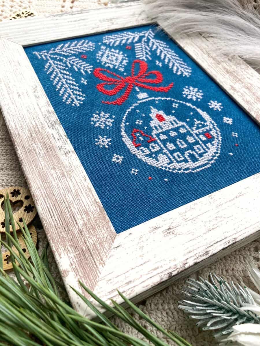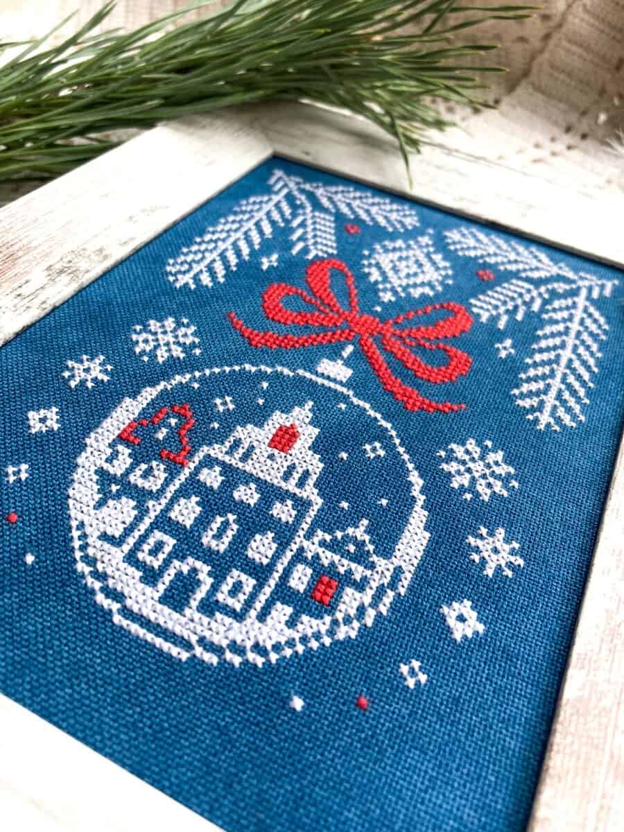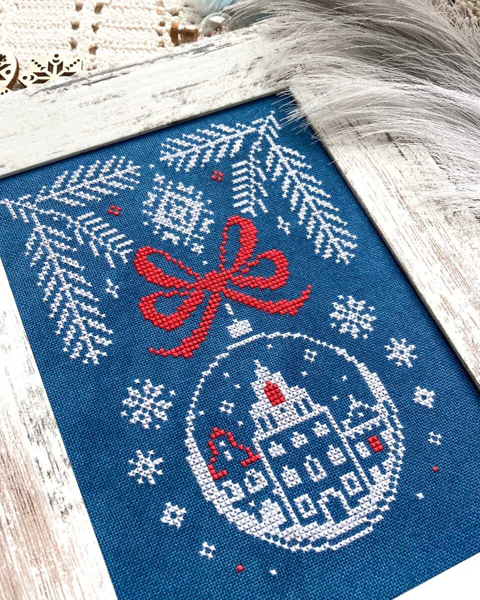 Nordic Yuletide is the perfect cross stitch design for a nice and cozy Scandinavian Christmas. This almost monochromatic design features a quiet town in an ornament adorned with a bright red bow. Follow the called for colors or pick any other colors of your choice!