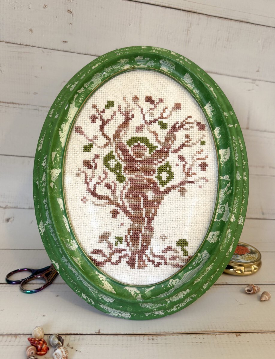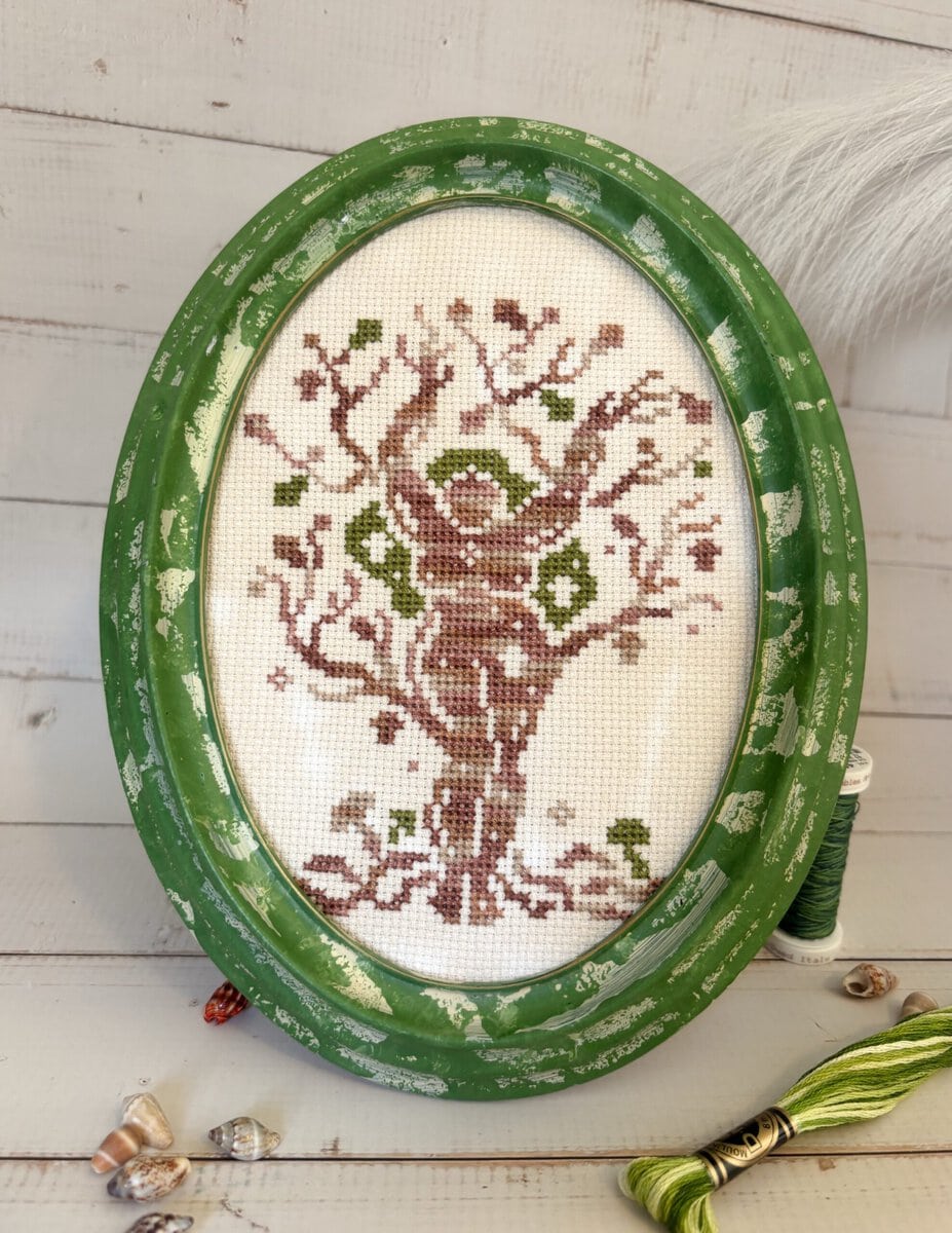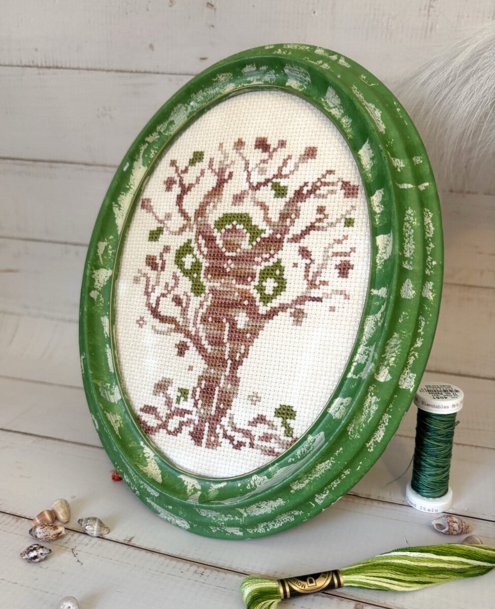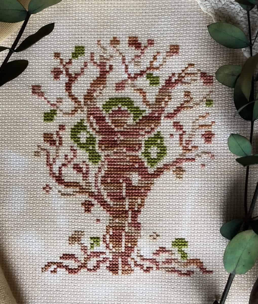 The model is stitched with 2 strands on hand-dyed 14 count Zweigart Aida.