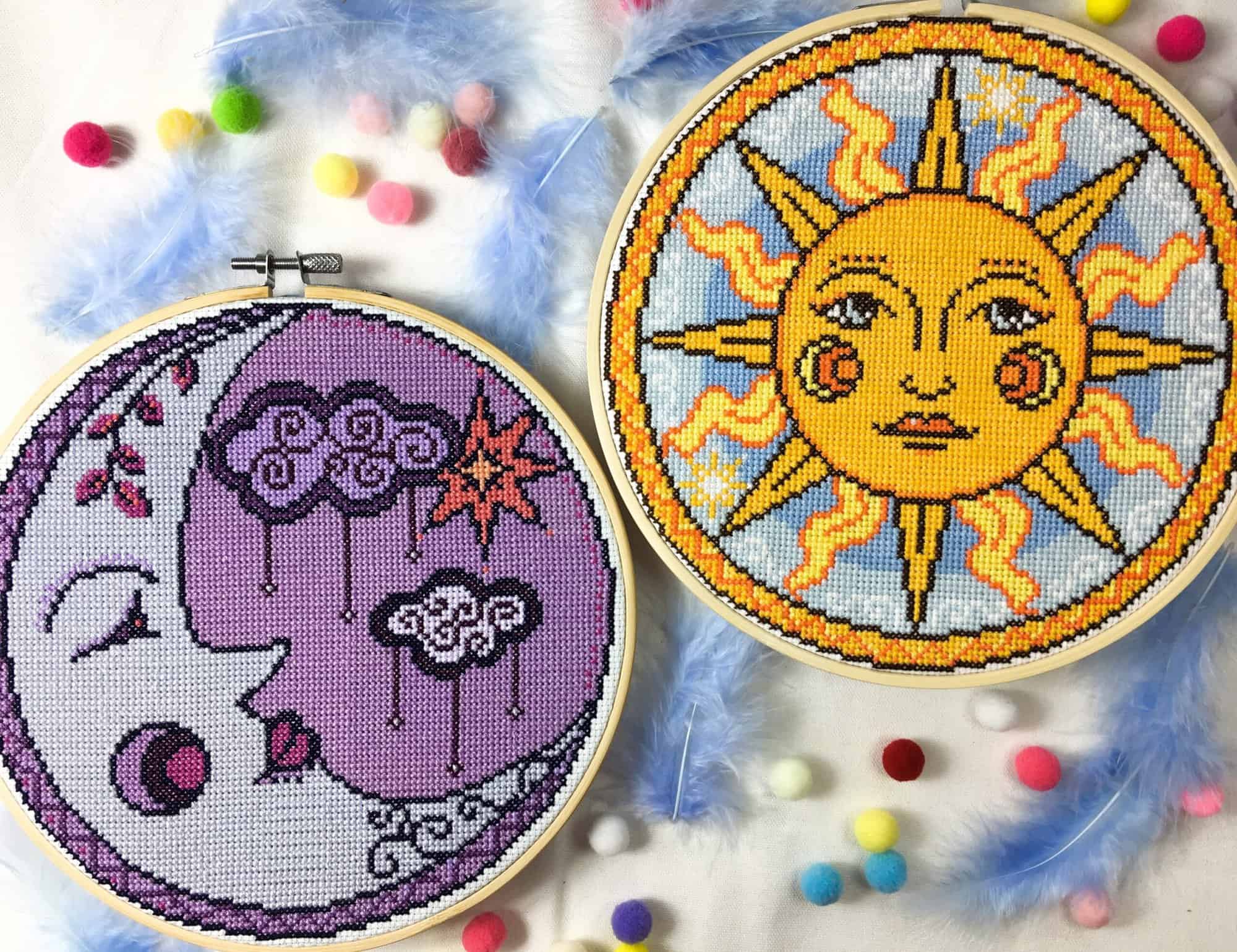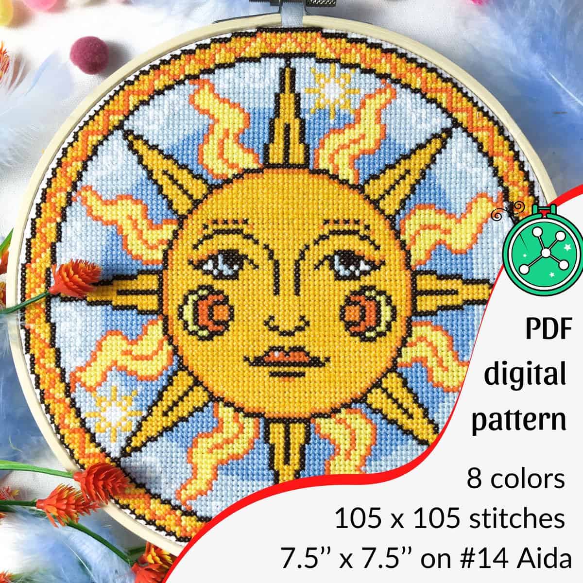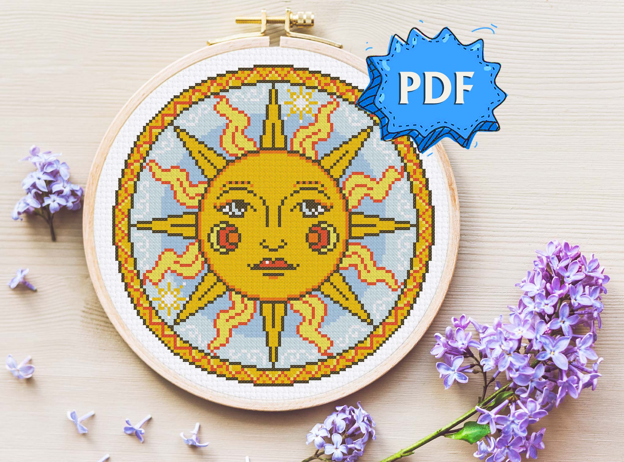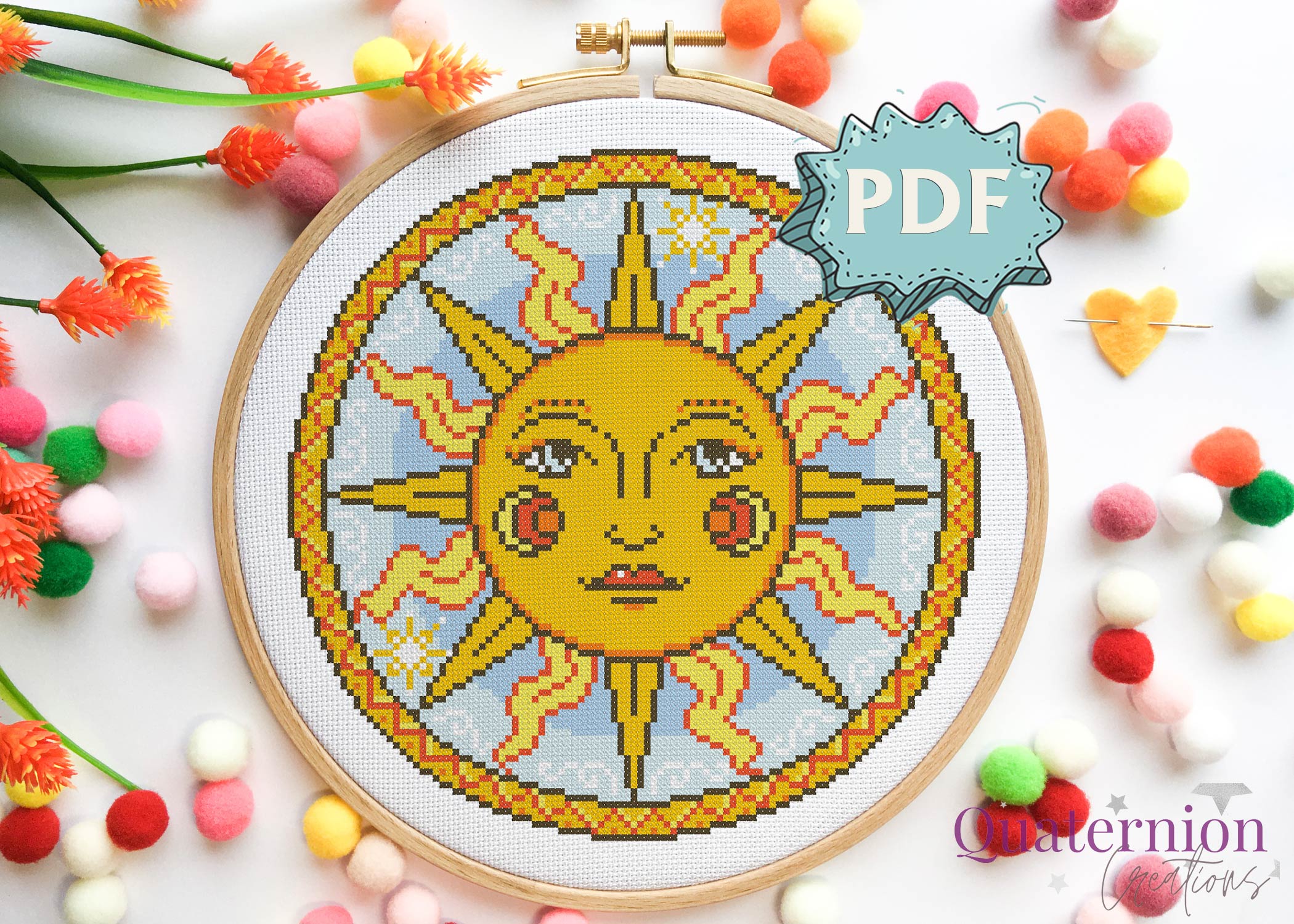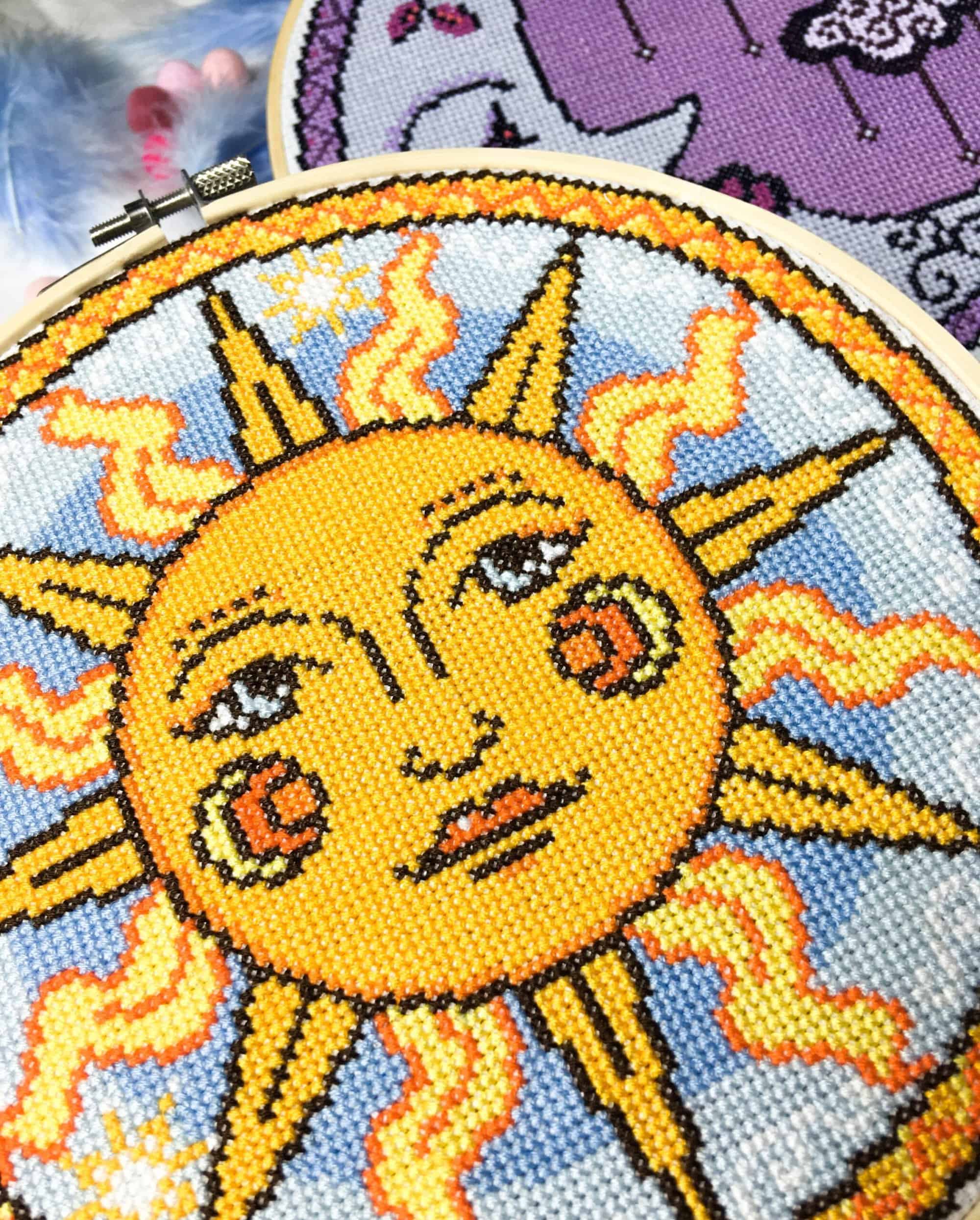 A gorgeous sun inspired by medieval celestial images in bright shades of yellow and orange. This is a sister pattern for my Purple Moon design, made in the same style and size.