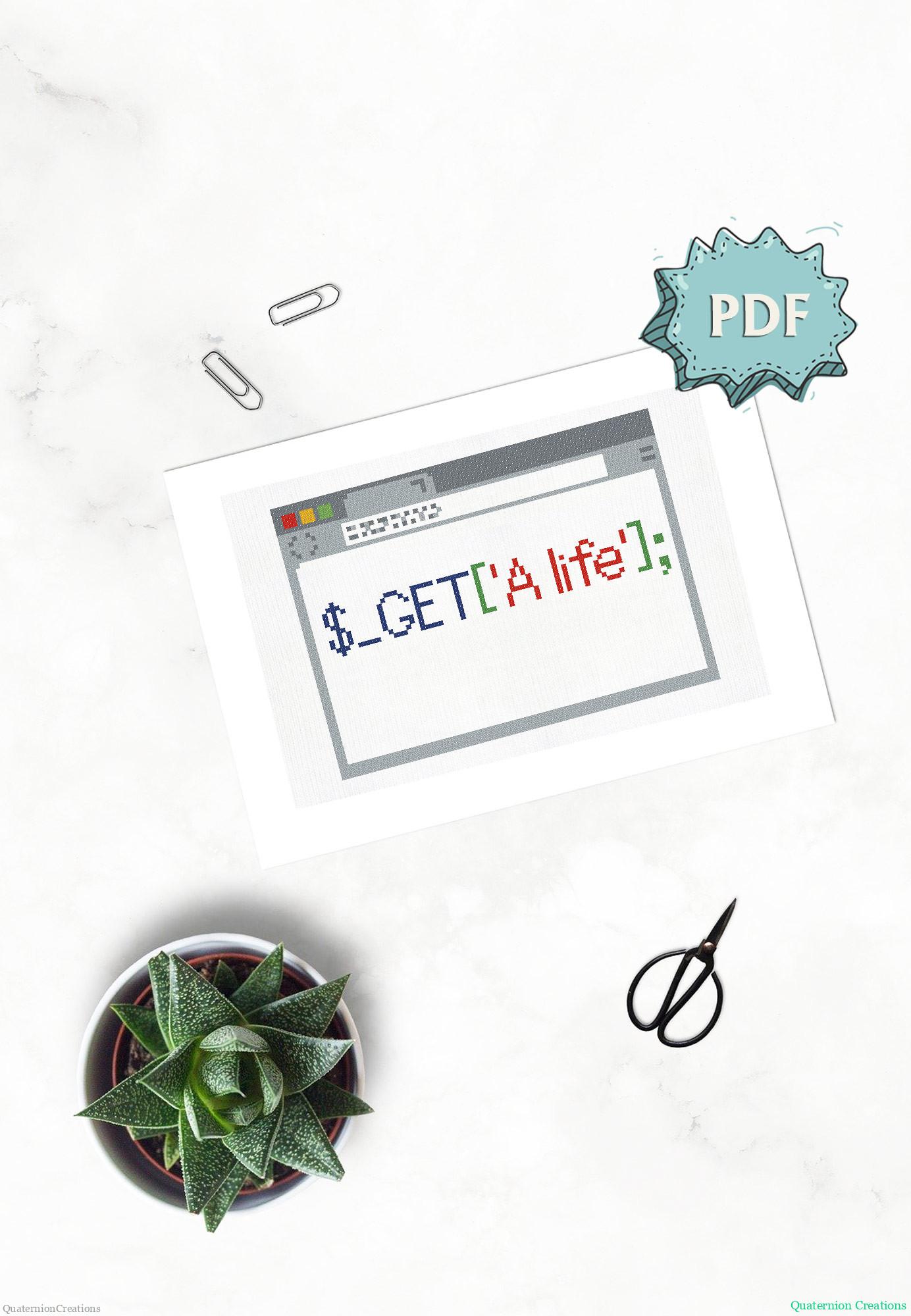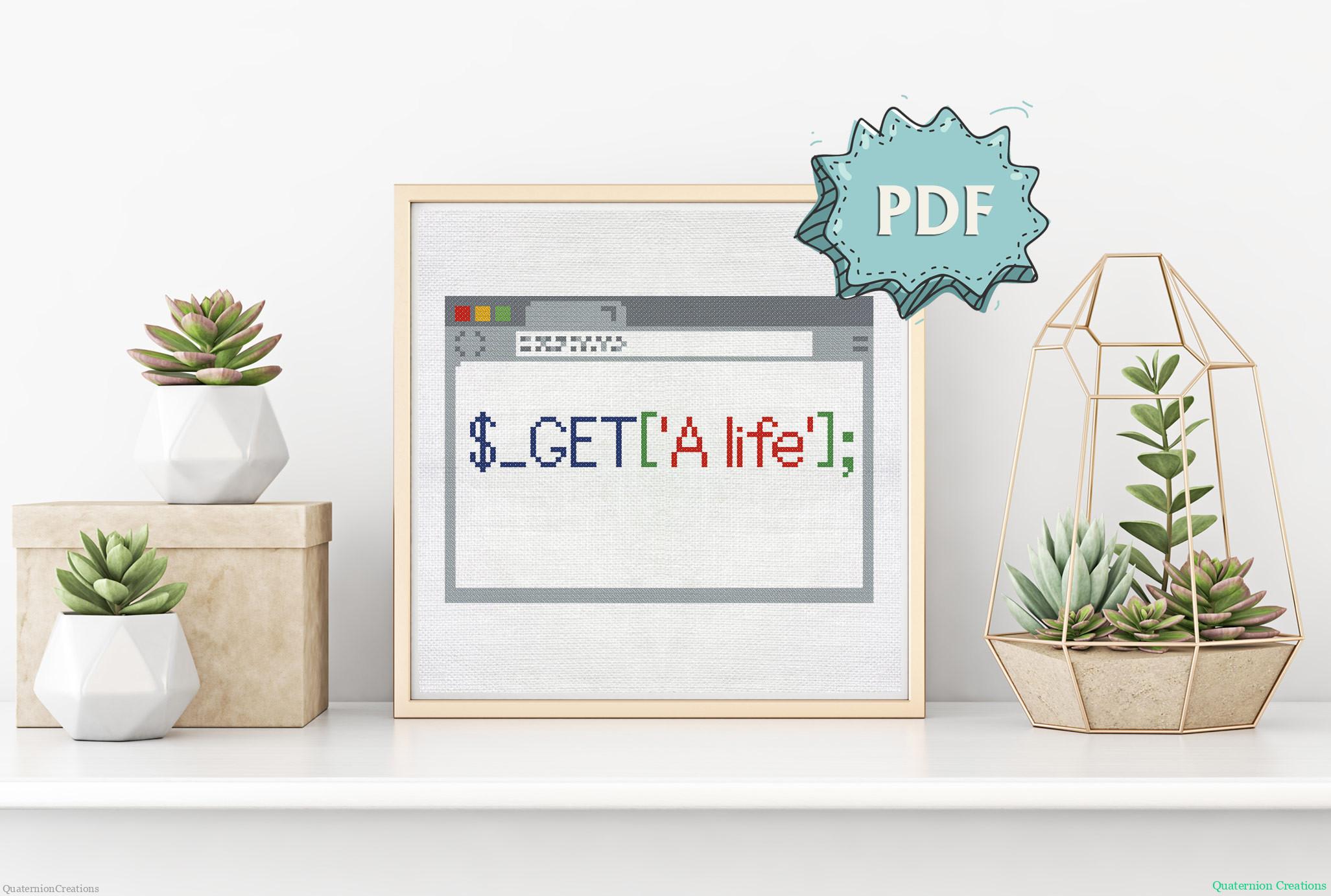 A cross stitch pattern with a geeky programmers joke in a browser-looking border. The code on the stitching says, $_GET[‘A_life’];