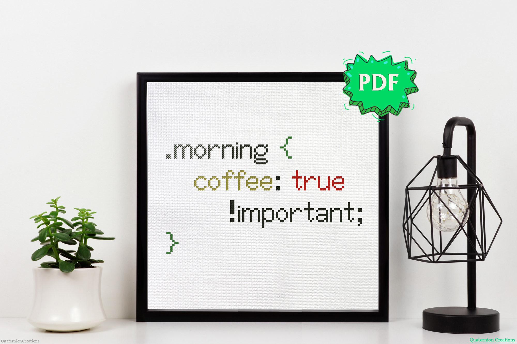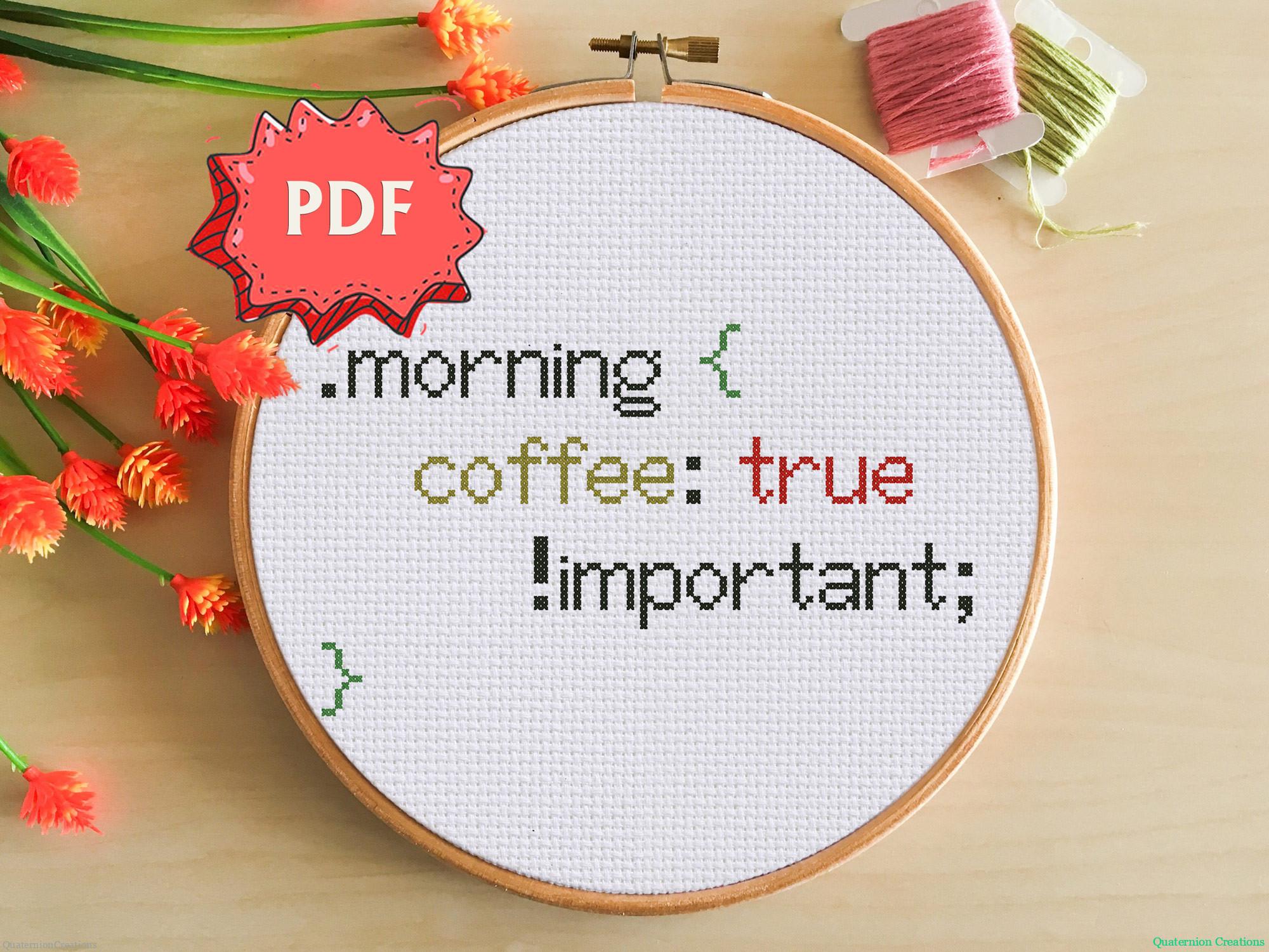 A funny cross stitch pattern in pseudo language very similar to CSS that describes morning coffee craving of all programmers and designers 🙂