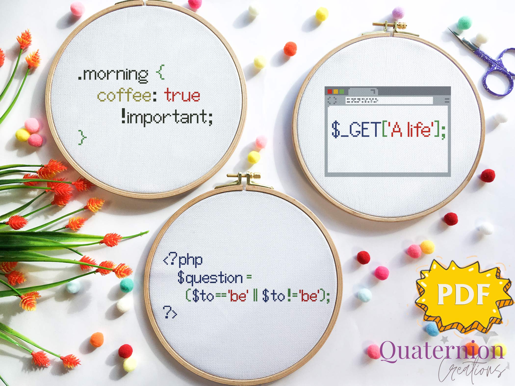 A set of three programming-inspired cross stitch patterns: Morning Coffee, Get a Life, and To be or not to be.