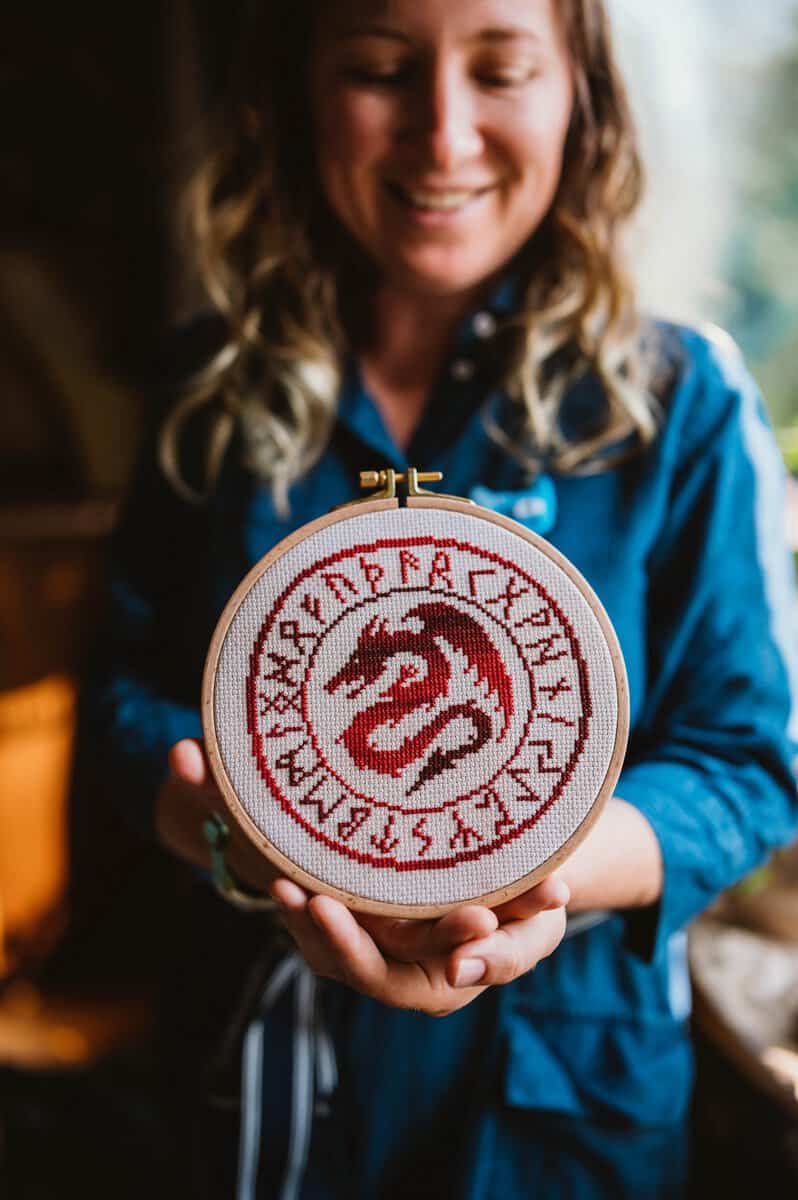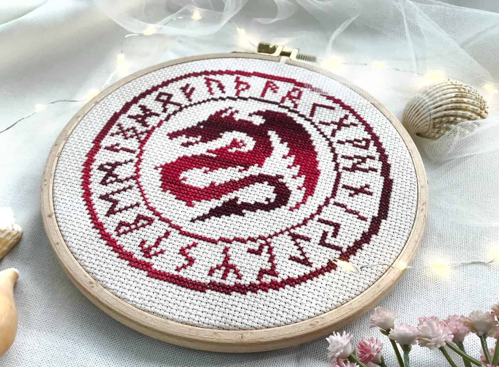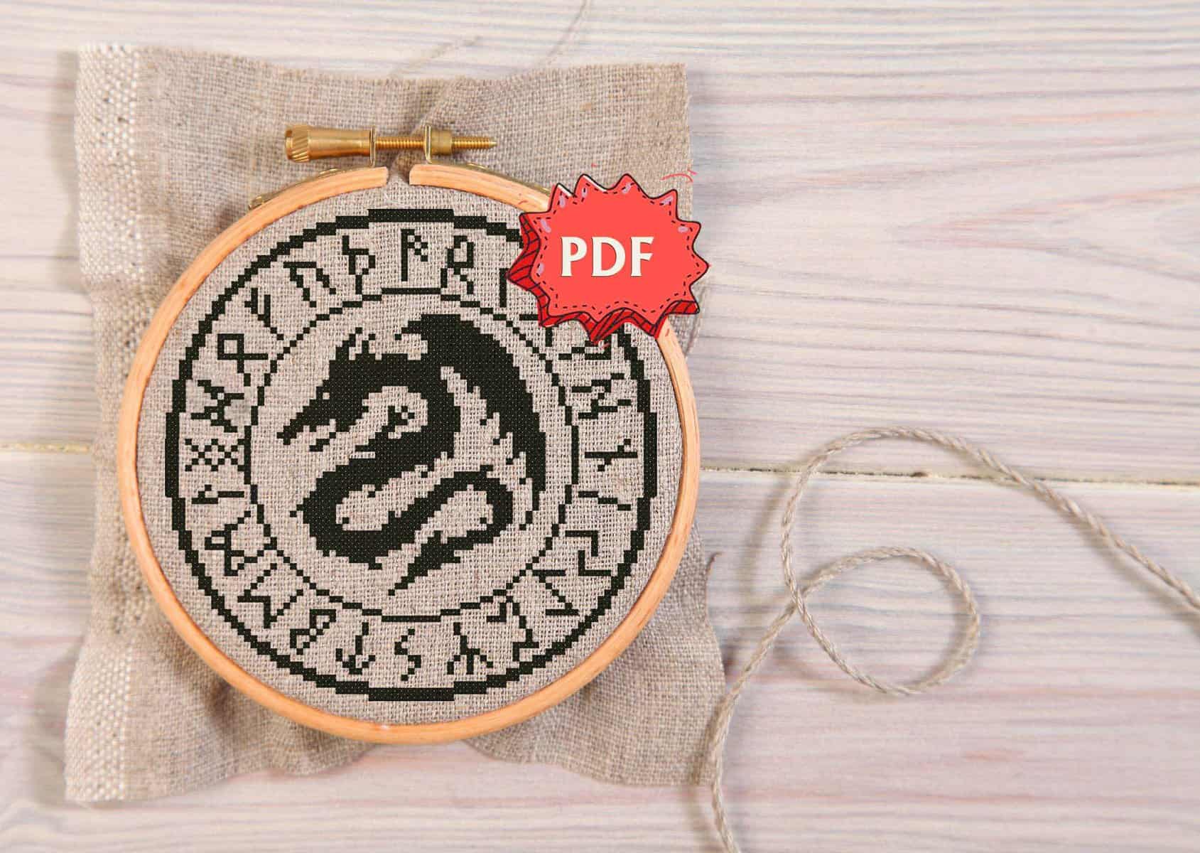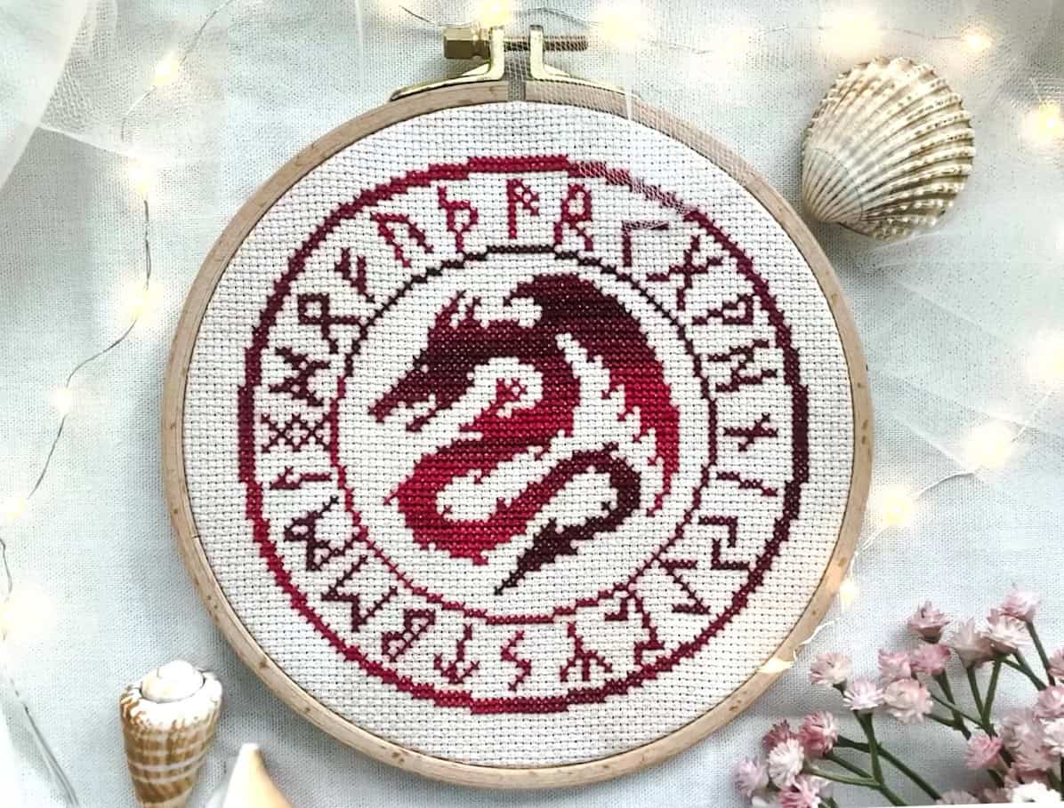 This cross stitch pattern is inspired by the Nordic mythology and features a beautiful dragon encircled with Elder Futhark runes.