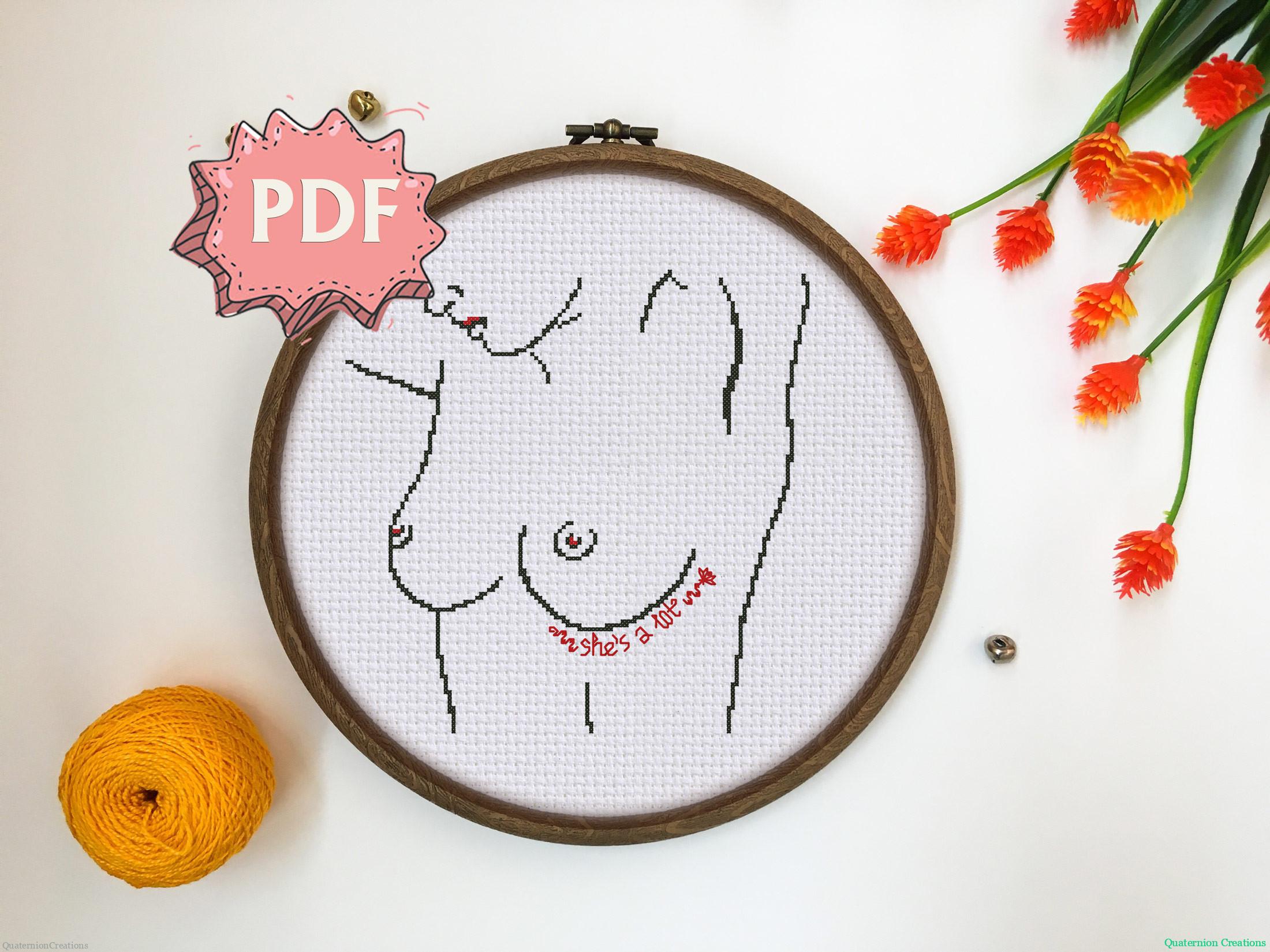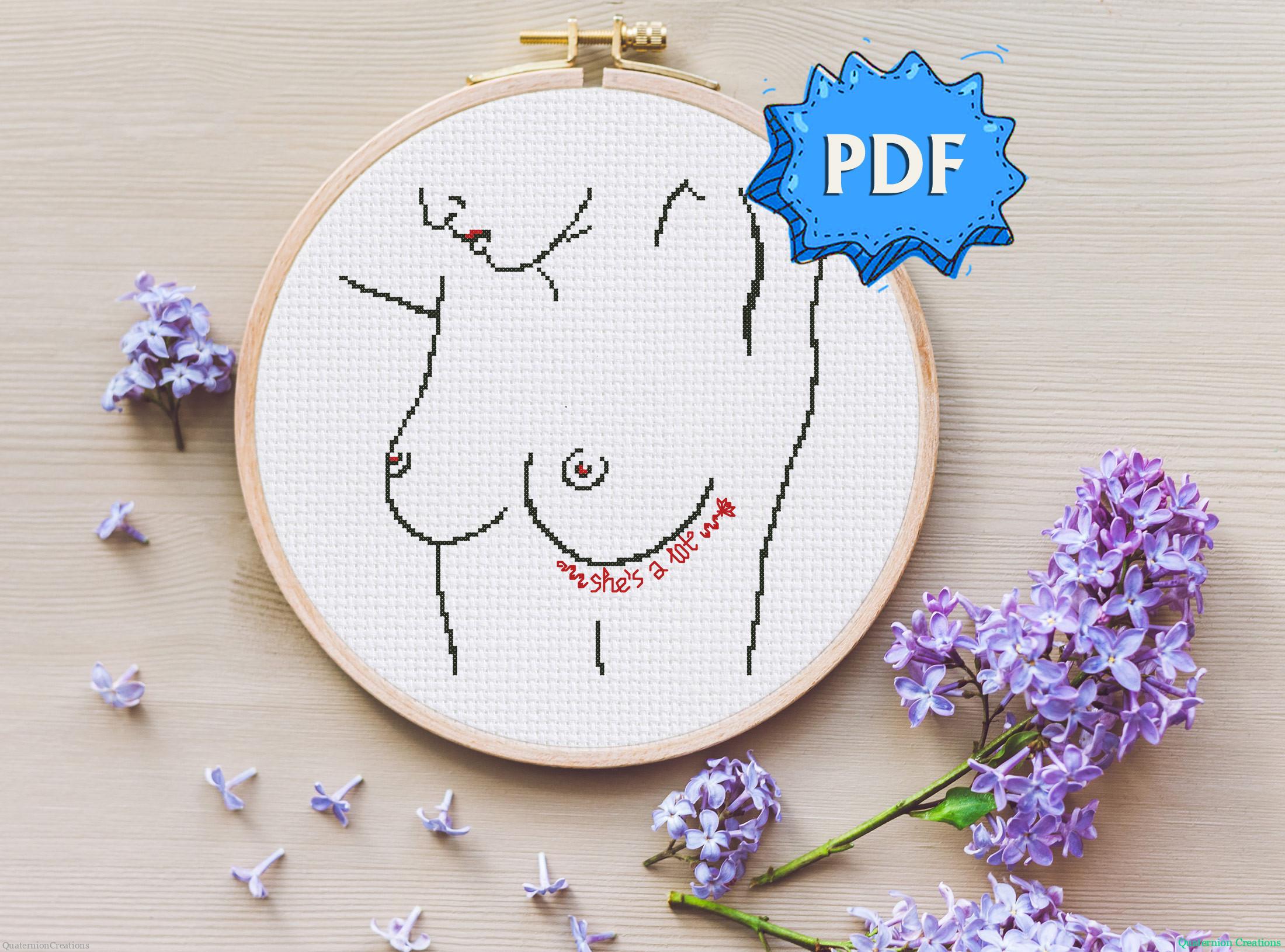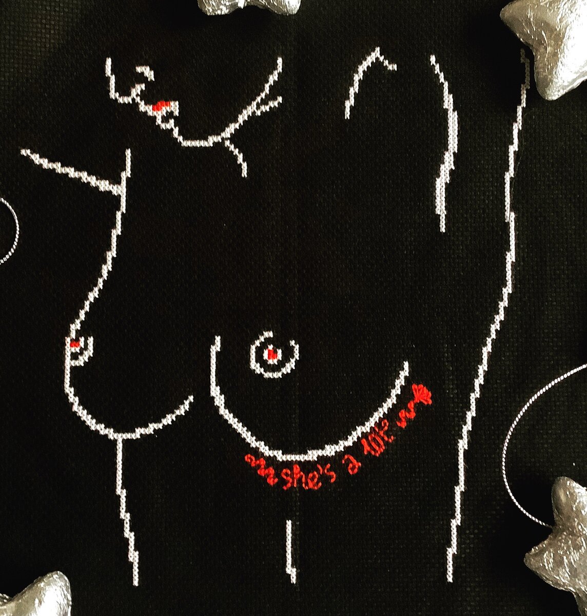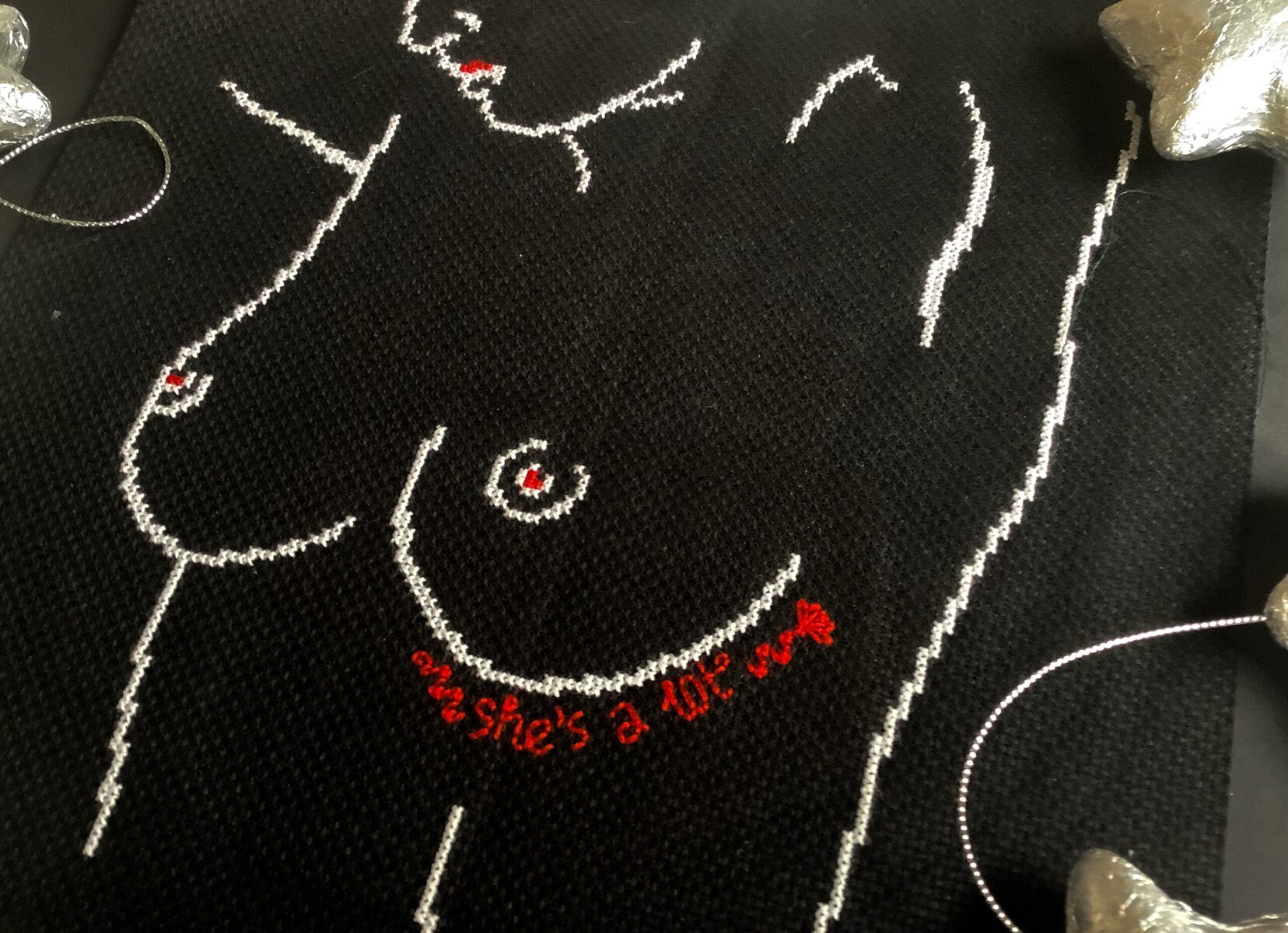 A silhouette of a woman, with a tattoo saying, “She’s a lot”. Modern cross stitch design in black color with red highlights.