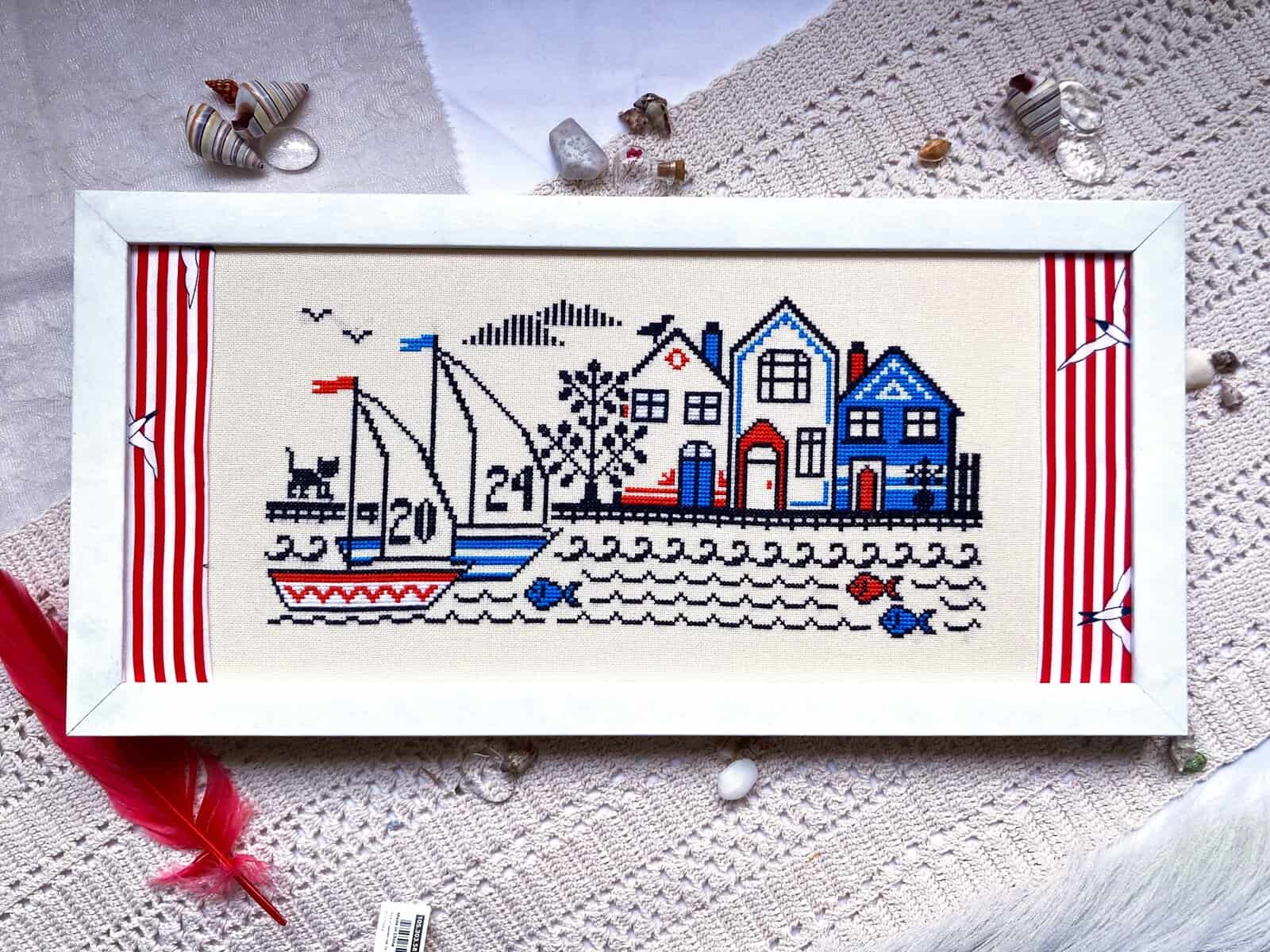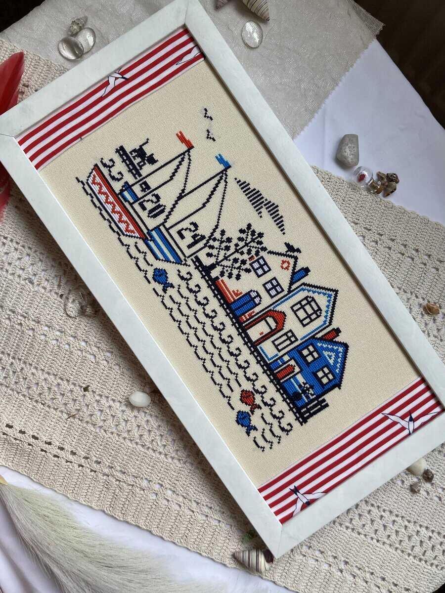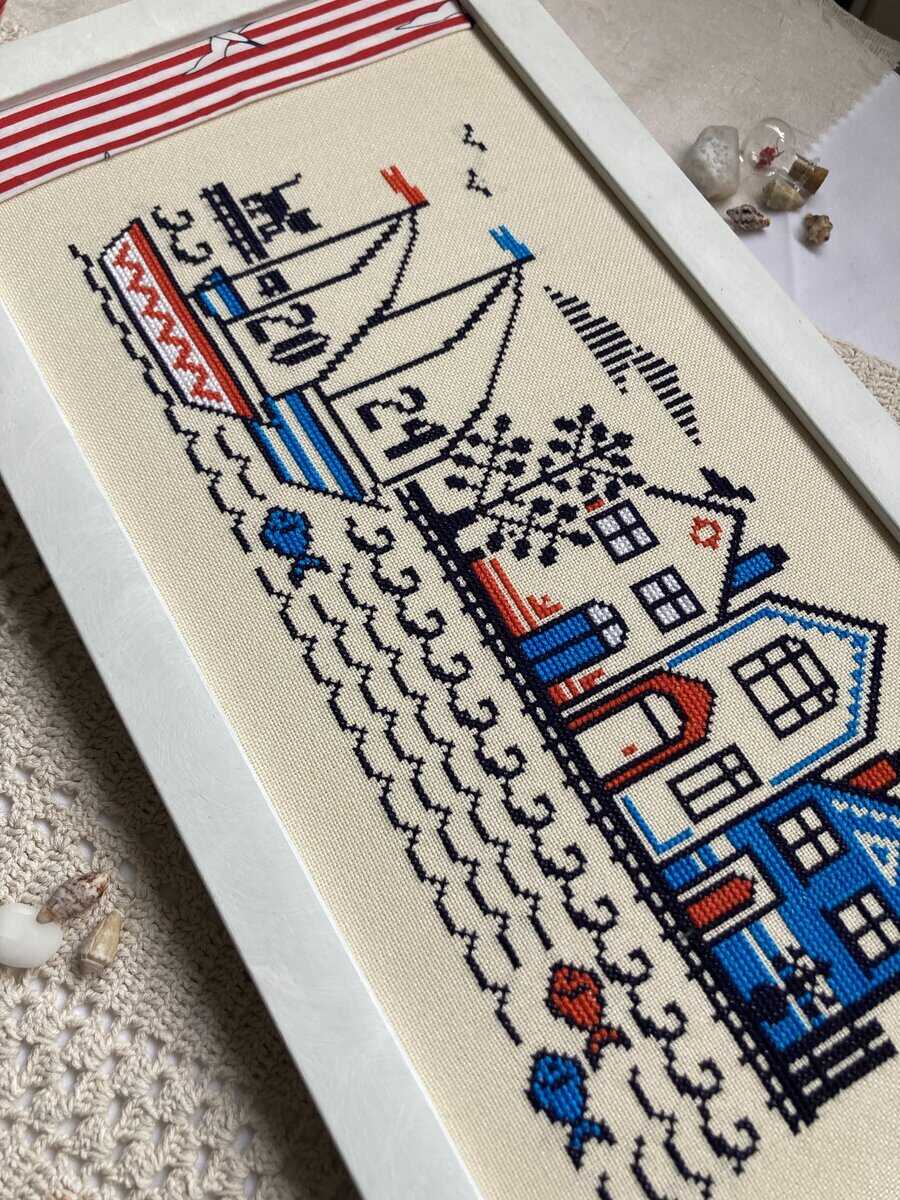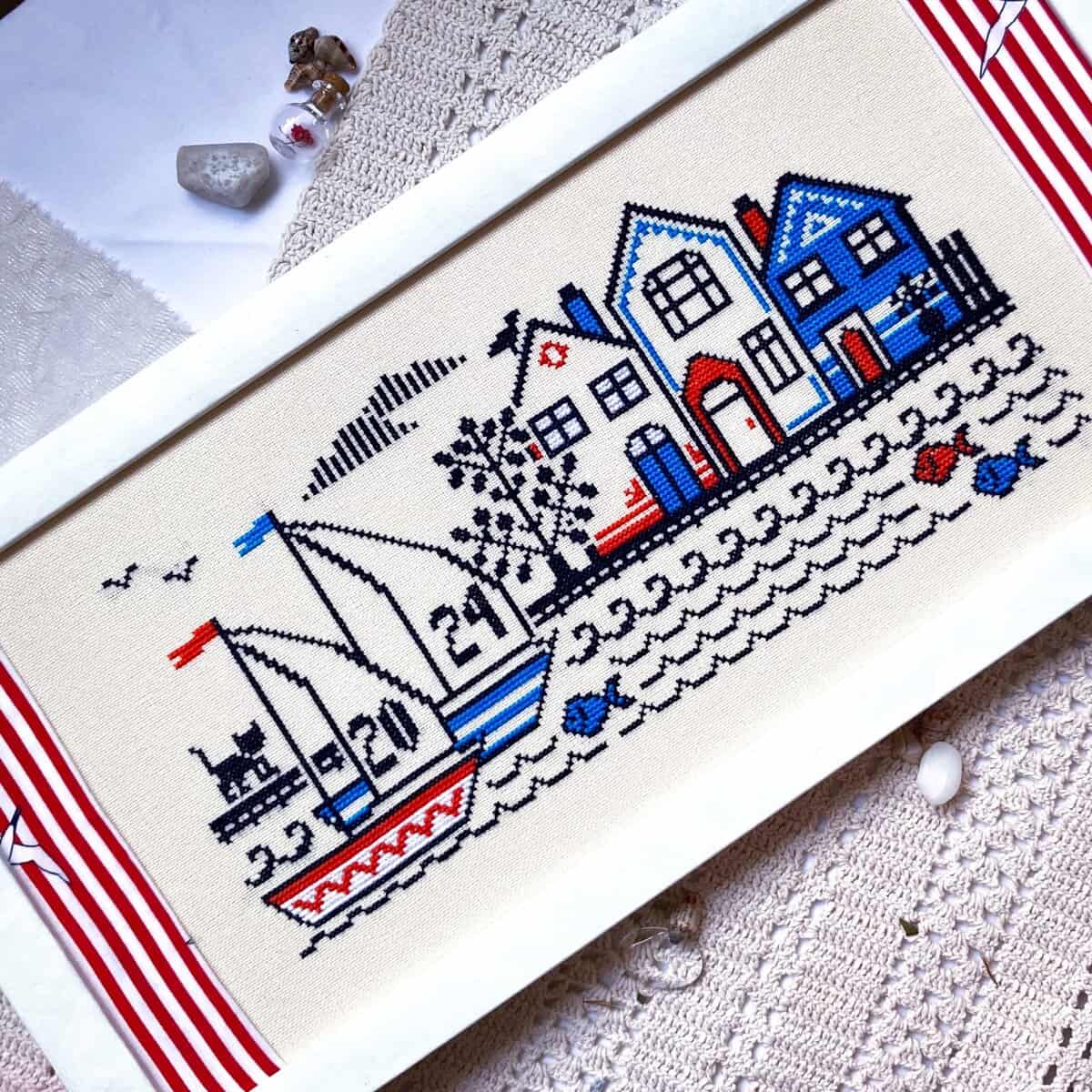 A peaceful summer cross stitch pattern with brightly colored yachts and cute beach houses. Boat numbers can be customized.
