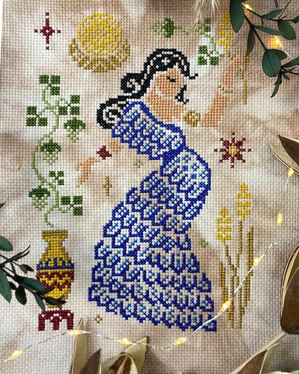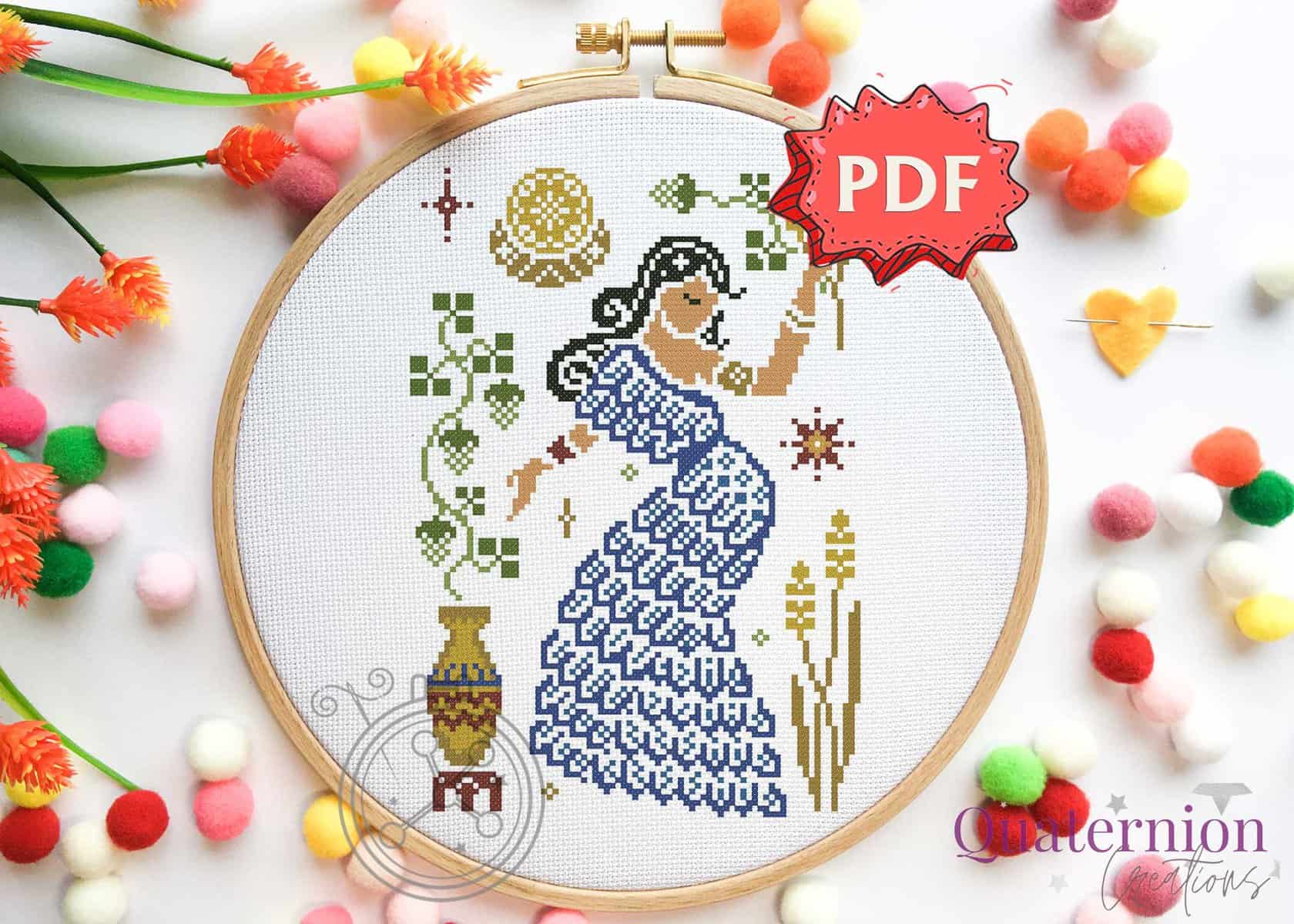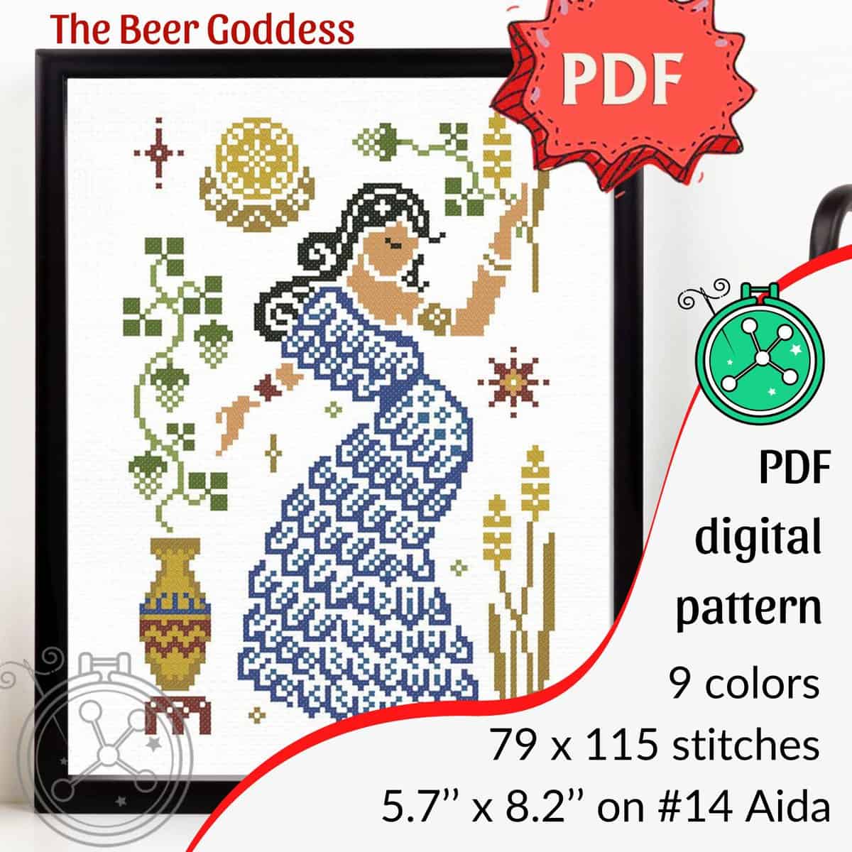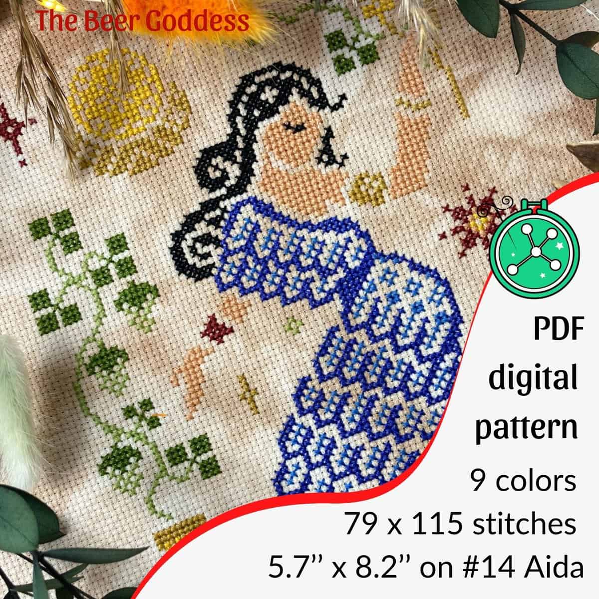 Ninkasi is the ancient Sumerian Goddess of beer and brewing, who is both the deity responsible for the beer quality and effects; but also the personalization of the beer itself. The Beer Goddess cross stitch pattern features Ninkasi in traditional Sumerian clothing, kaunakes, with a beer jug and a hops plant. The colors are inspired by the colors available to the region at the time.