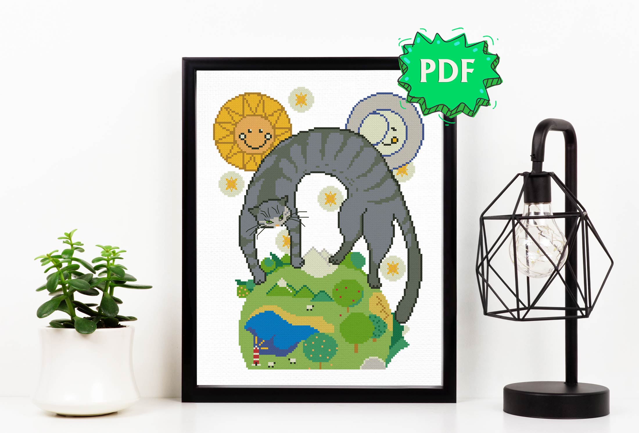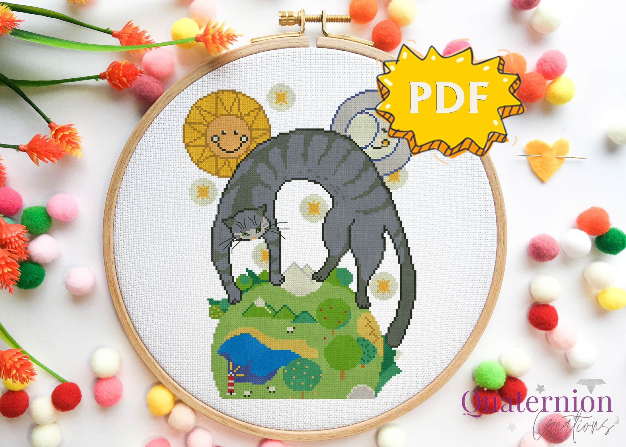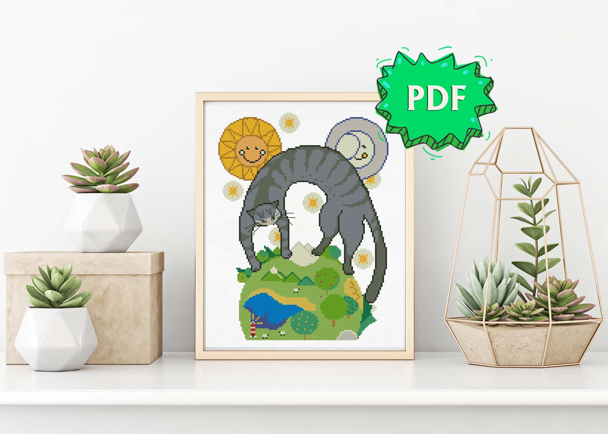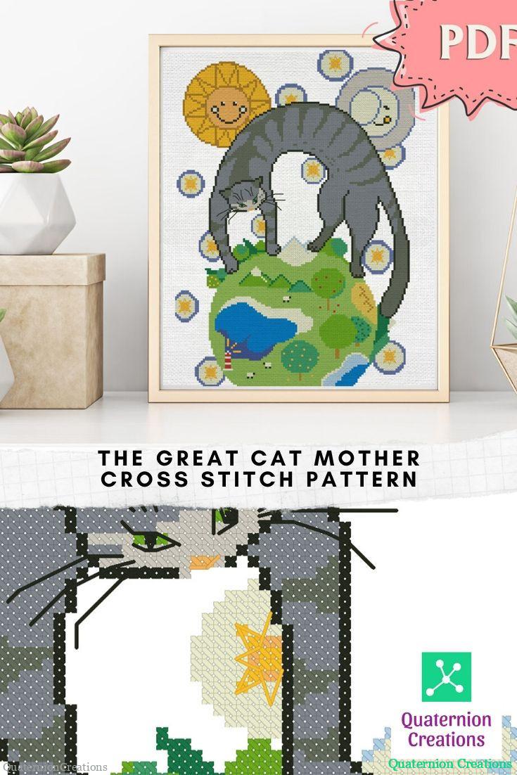 The Cat Goddess cross stitch design is a bright and happy image of a Cat Mother goddess leaning over her planet, with the sun, moon, and stars in the background.