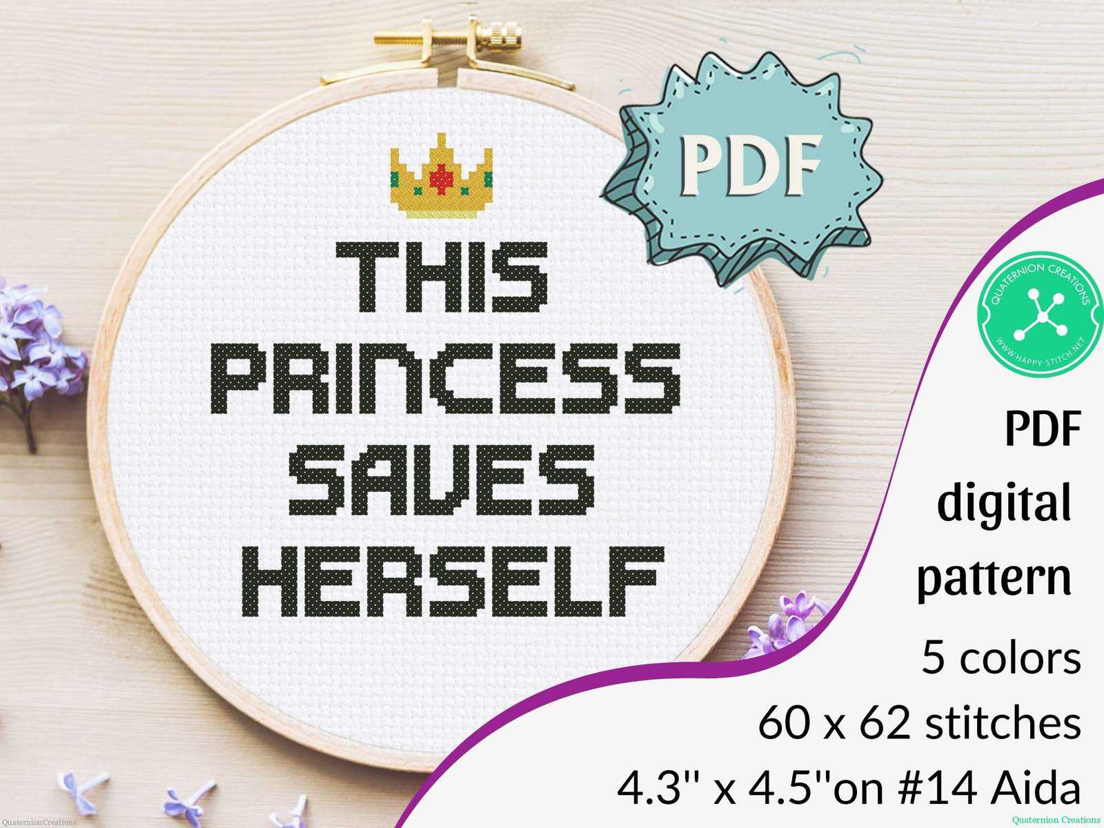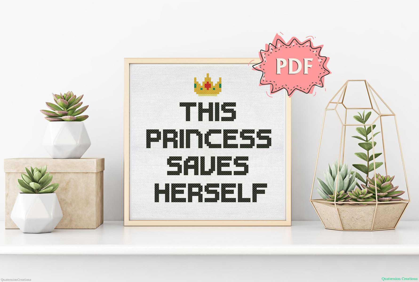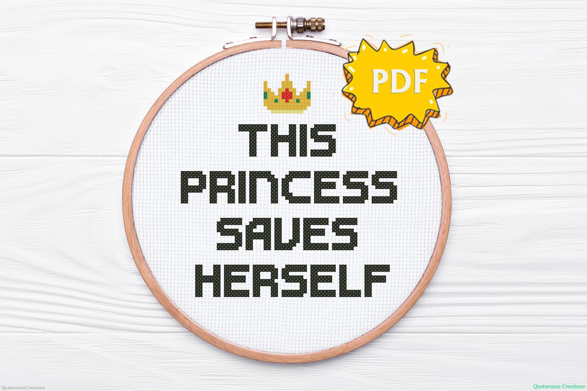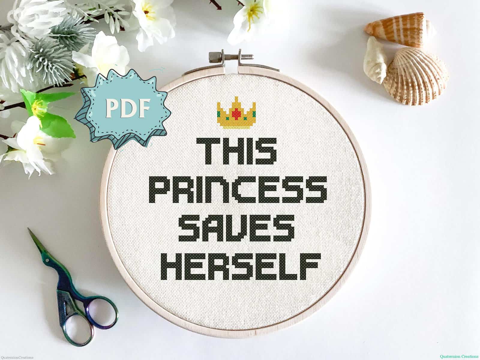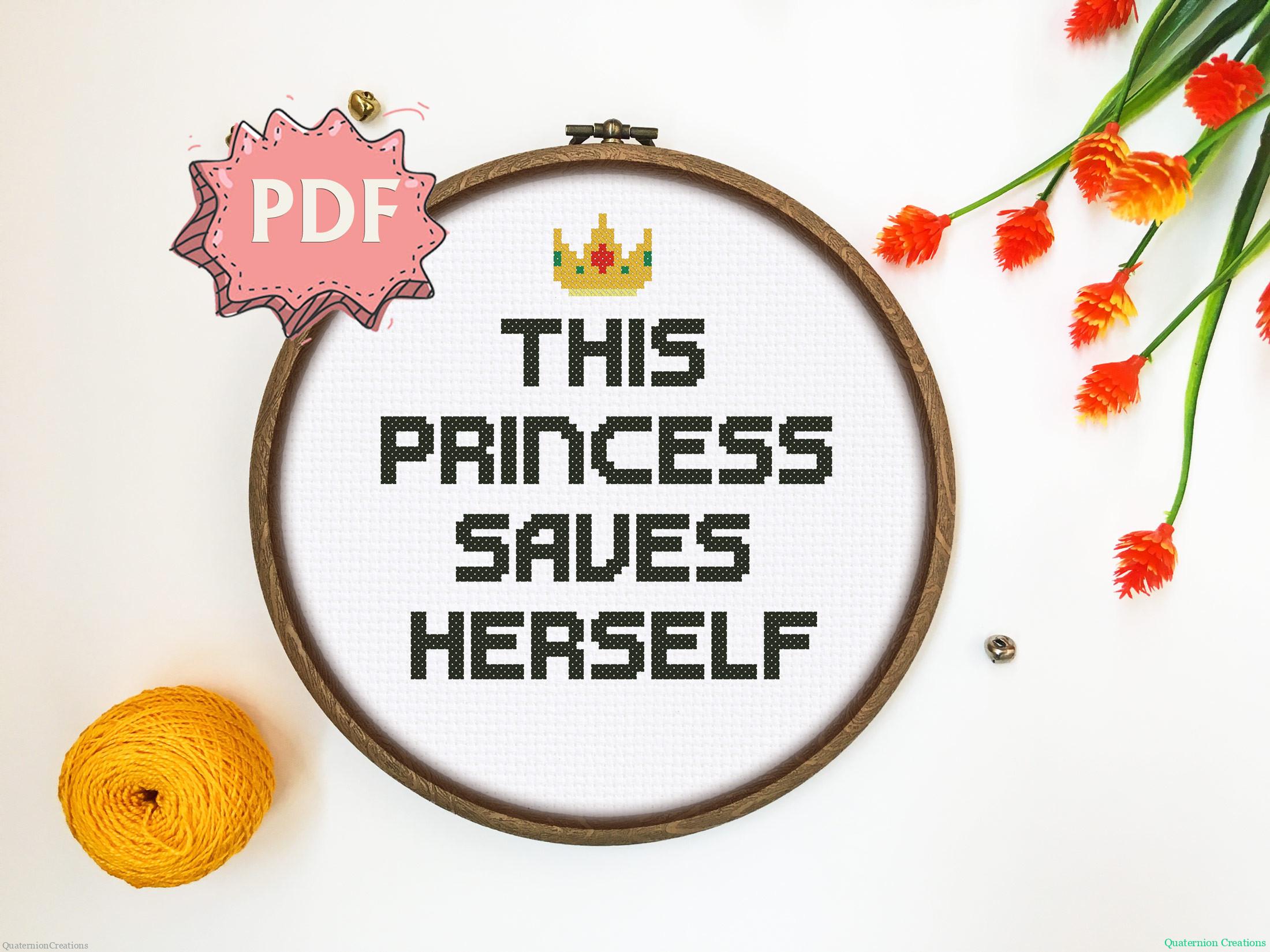 This design features the phrase, This Princess Saves Herself, topped with a stylized little crown.