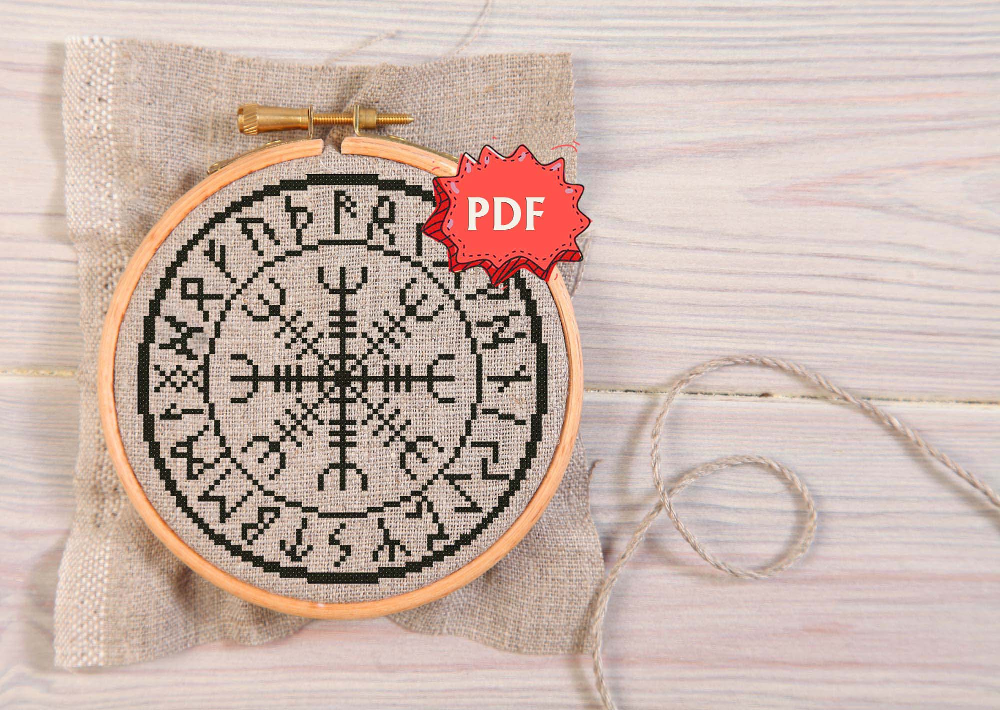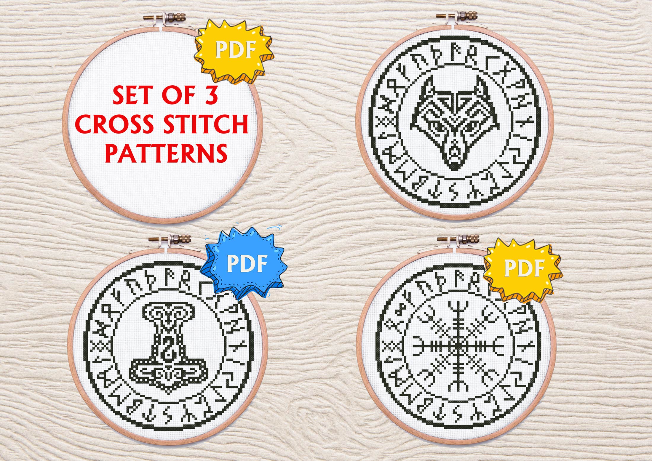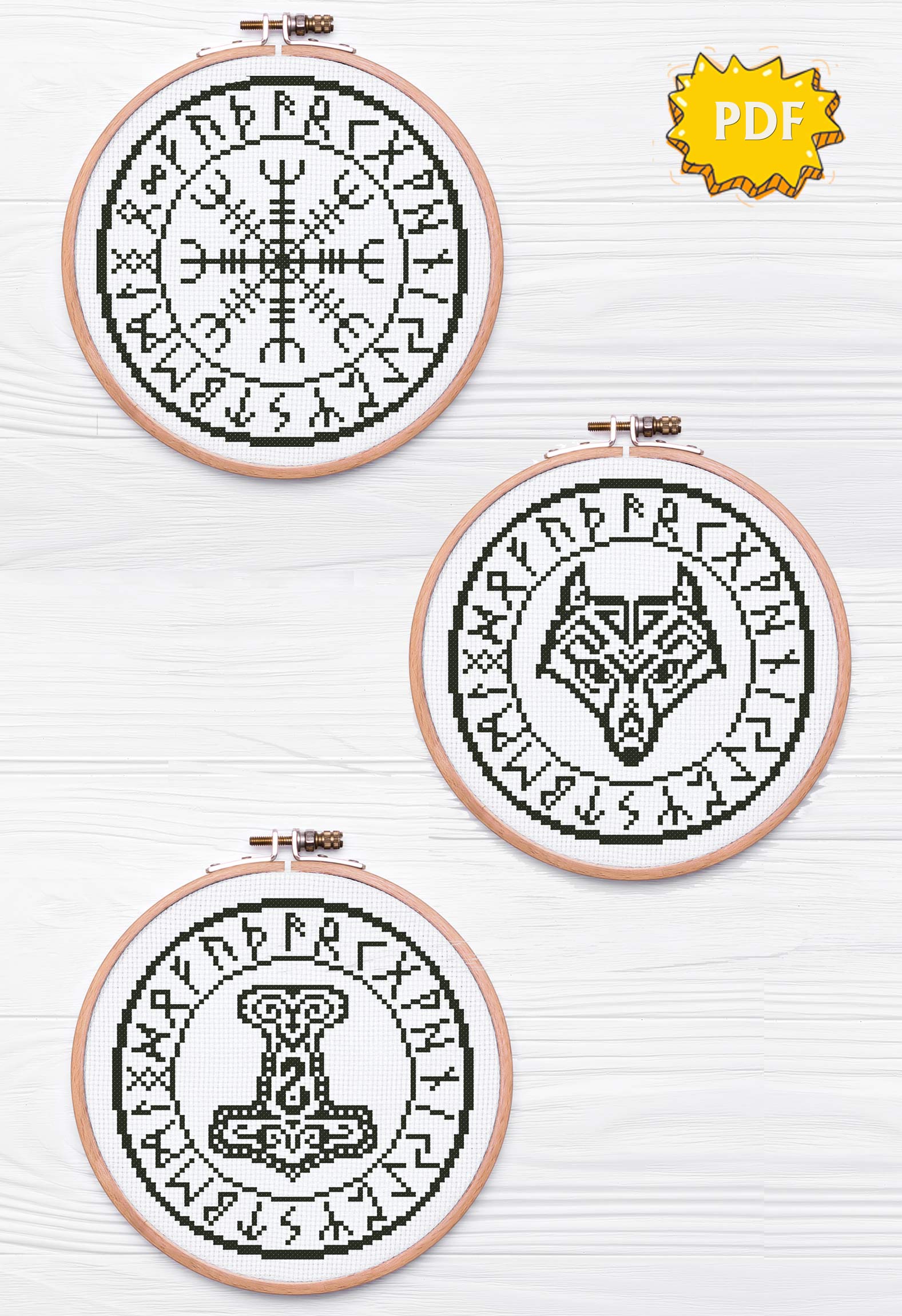 A set of three designs inspired by Norse mythology: a Viking Helm of awe amulet, Fenrir the wolf, and Thor’s hammer the Mjolnir (or Mjollnir). Each symbol is inside an Elder Futhark runic circle and can be stitched with or without it.